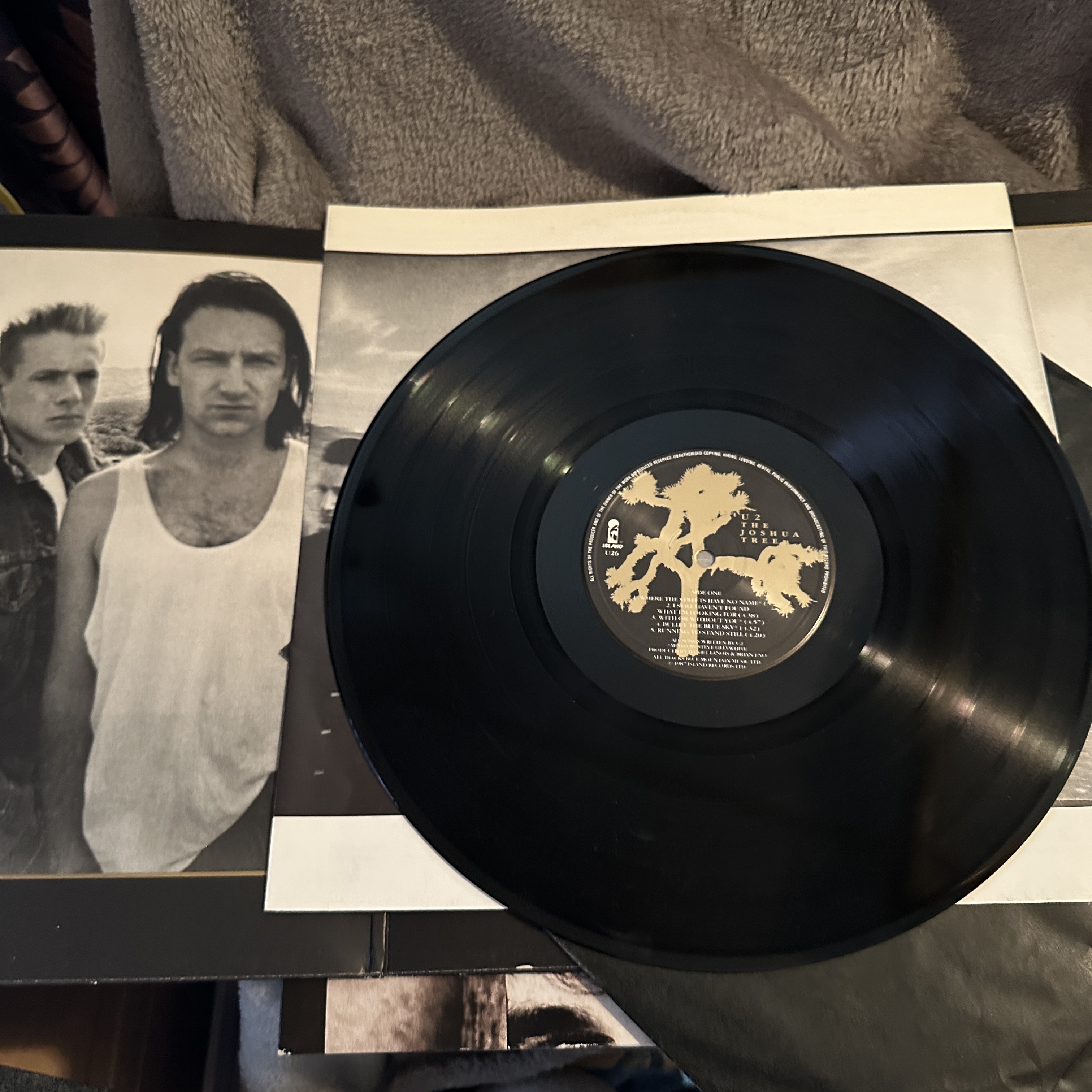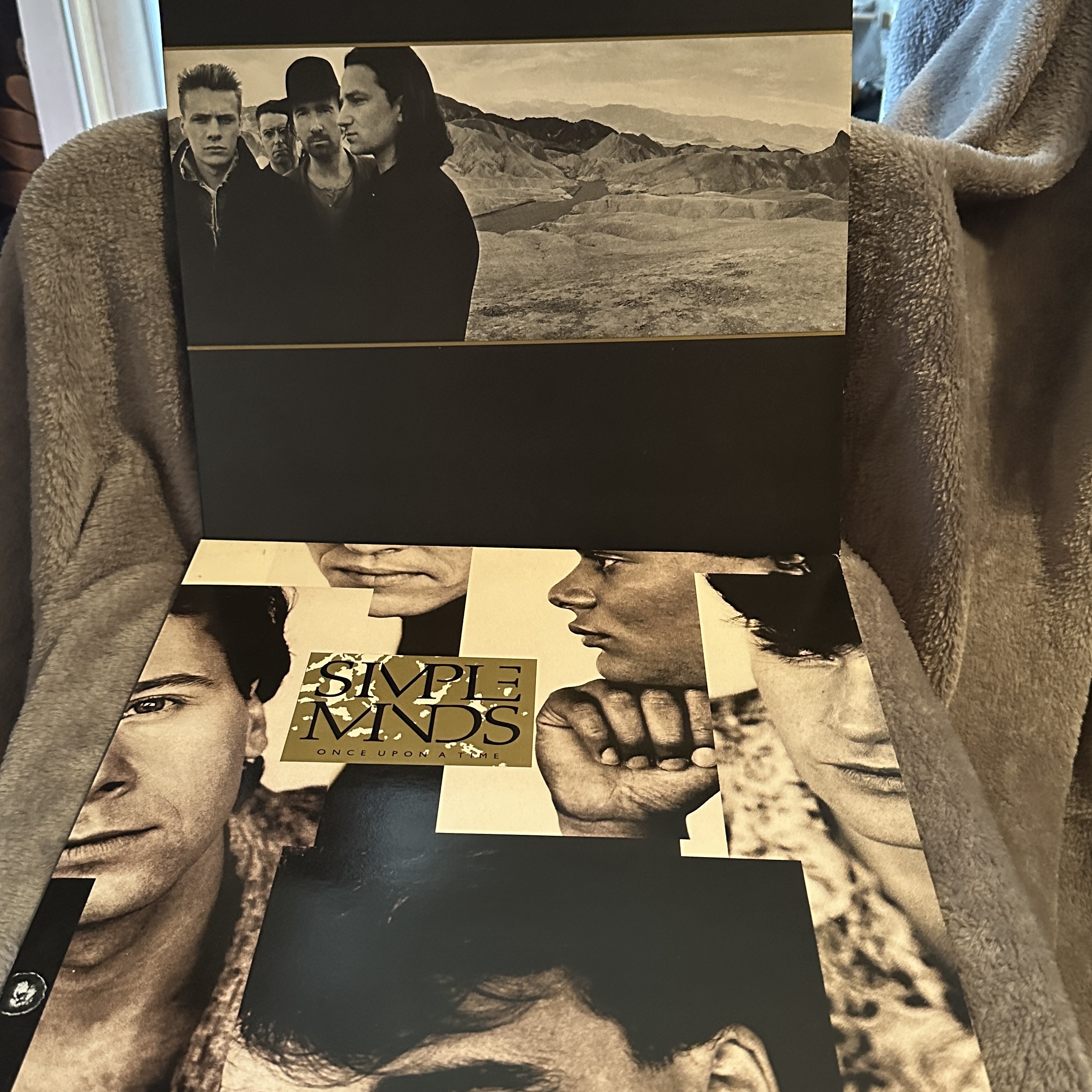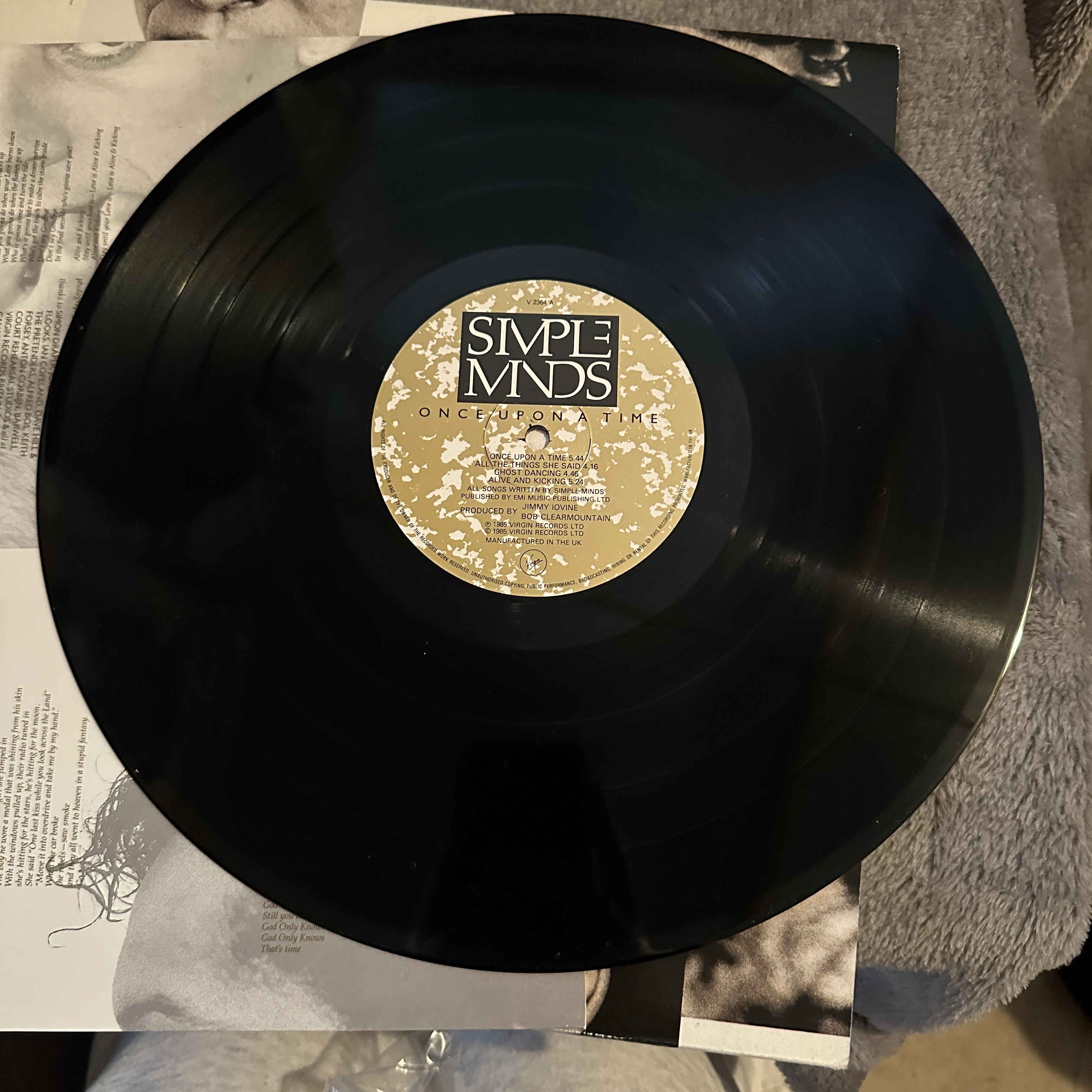 This listing presents a vinyl LP record of Simple Minds’ album “Once Upon a Time.” The record is black vinyl and features printed text including track listings on both sides. It is housed in a gatefold sleeve with black and white photographic imagery of the band members and a landscape. The sleeve exhibits some minor creasing and handling wear.