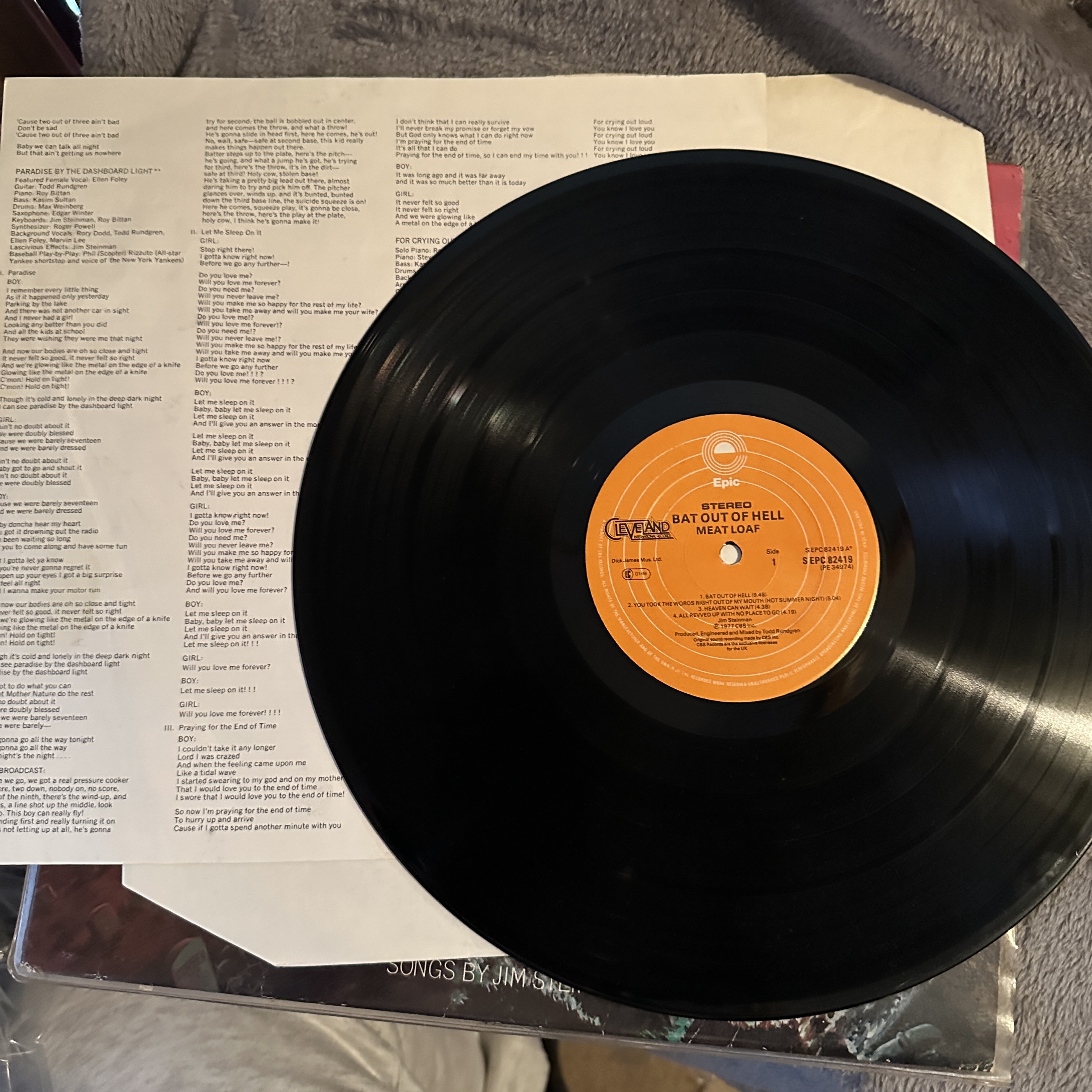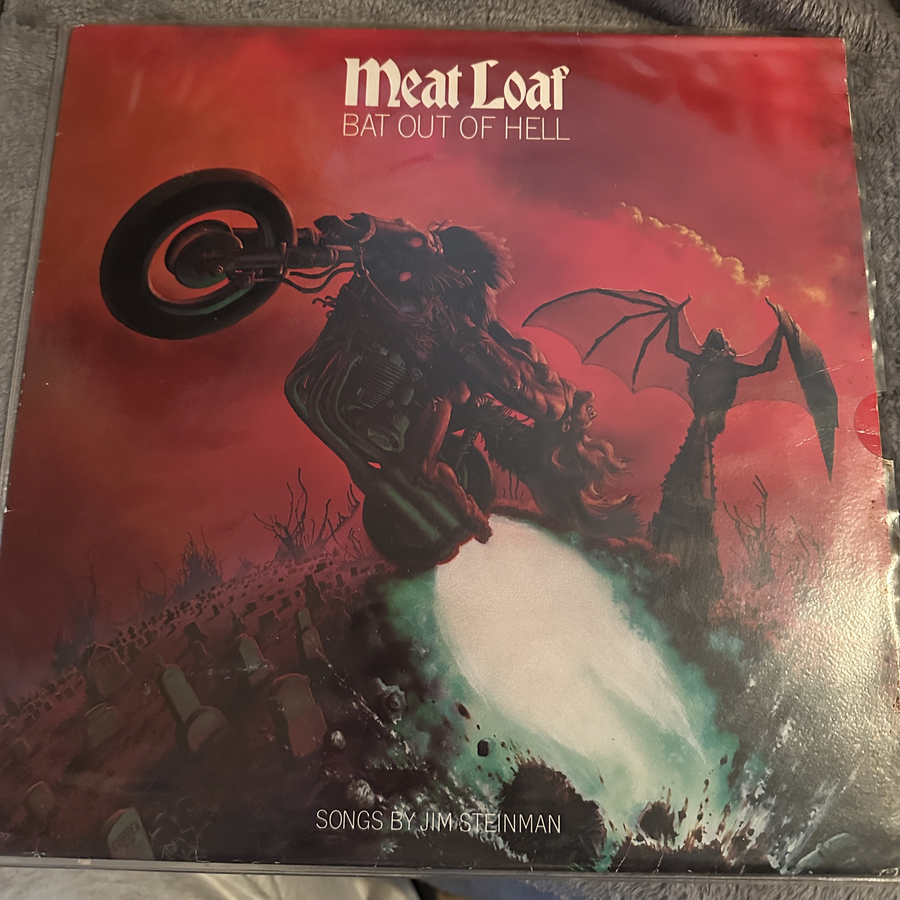 Vinyl LP record of *Bat Out of Hell* by Meat Loaf, featuring cover art depicting a motorcycle rider, bat-like figure, and graveyard scene. Includes a lyric sheet. The record itself is black vinyl and bears the Epic Records label.