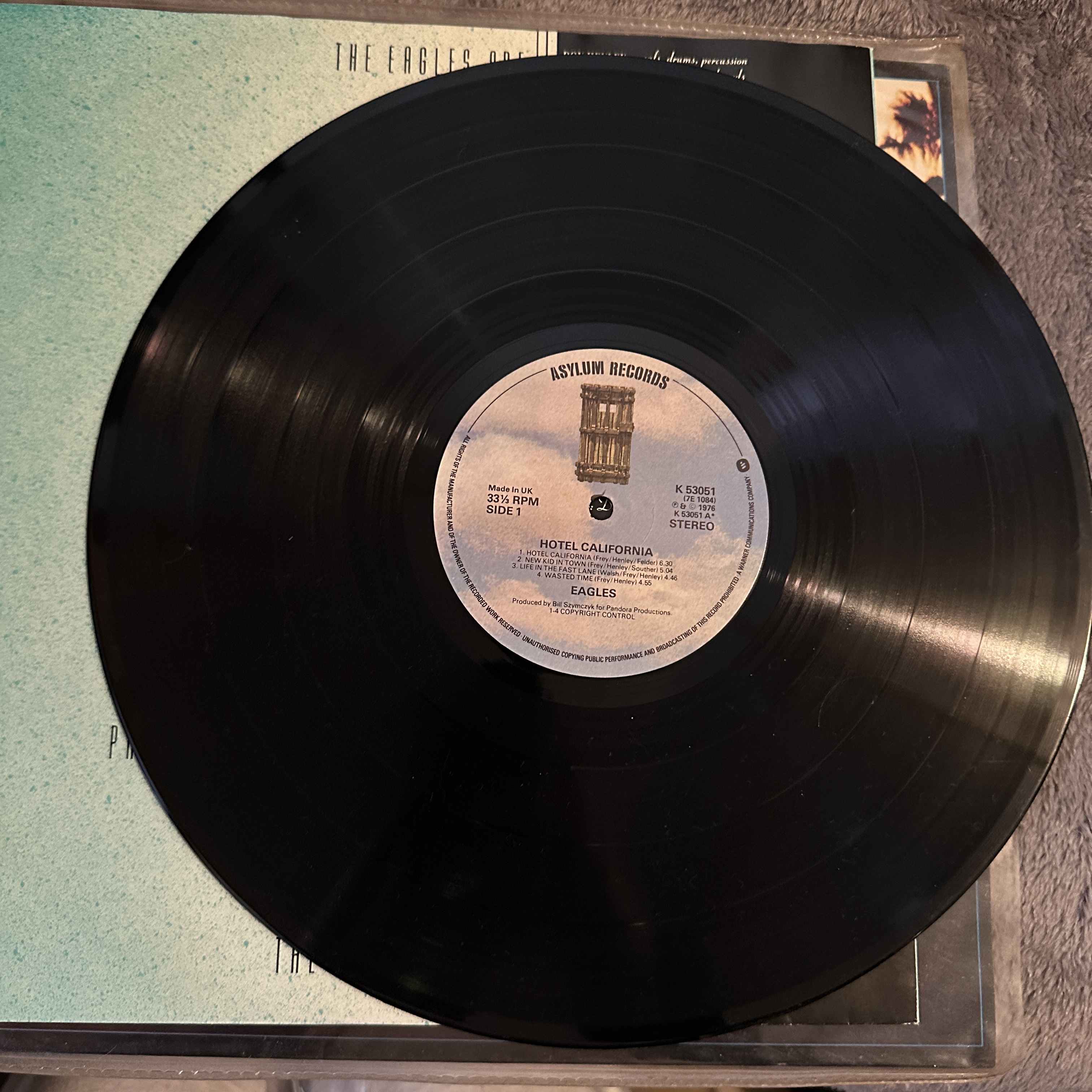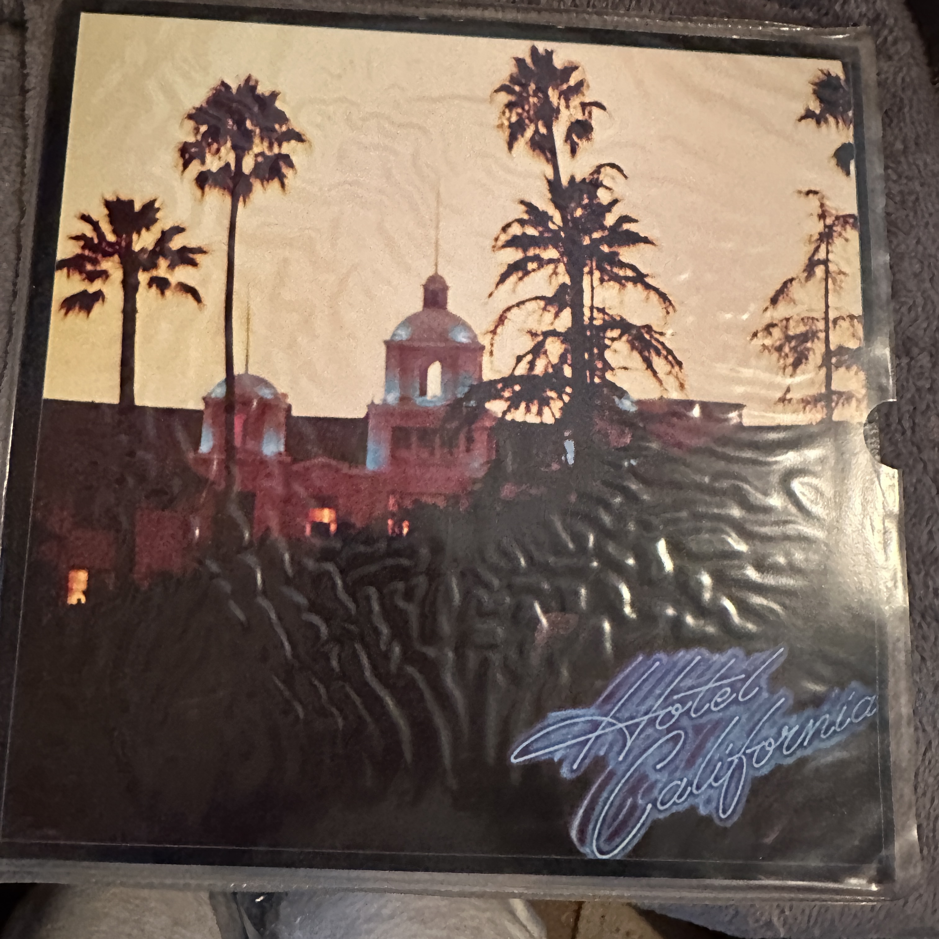 Vinyl long-playing (LP) record album identified as the Eagles’ *Hotel California*, released by Asylum Records (catalog number K 52001). The cover features a painted depiction of a hotel at dusk with palm trees, with embossed or textured detailing on the lower portion. The album title is presented in stylized script across the bottom. The record label displays “Asylum Records,” the album title, and the catalog number. The record itself is black vinyl.