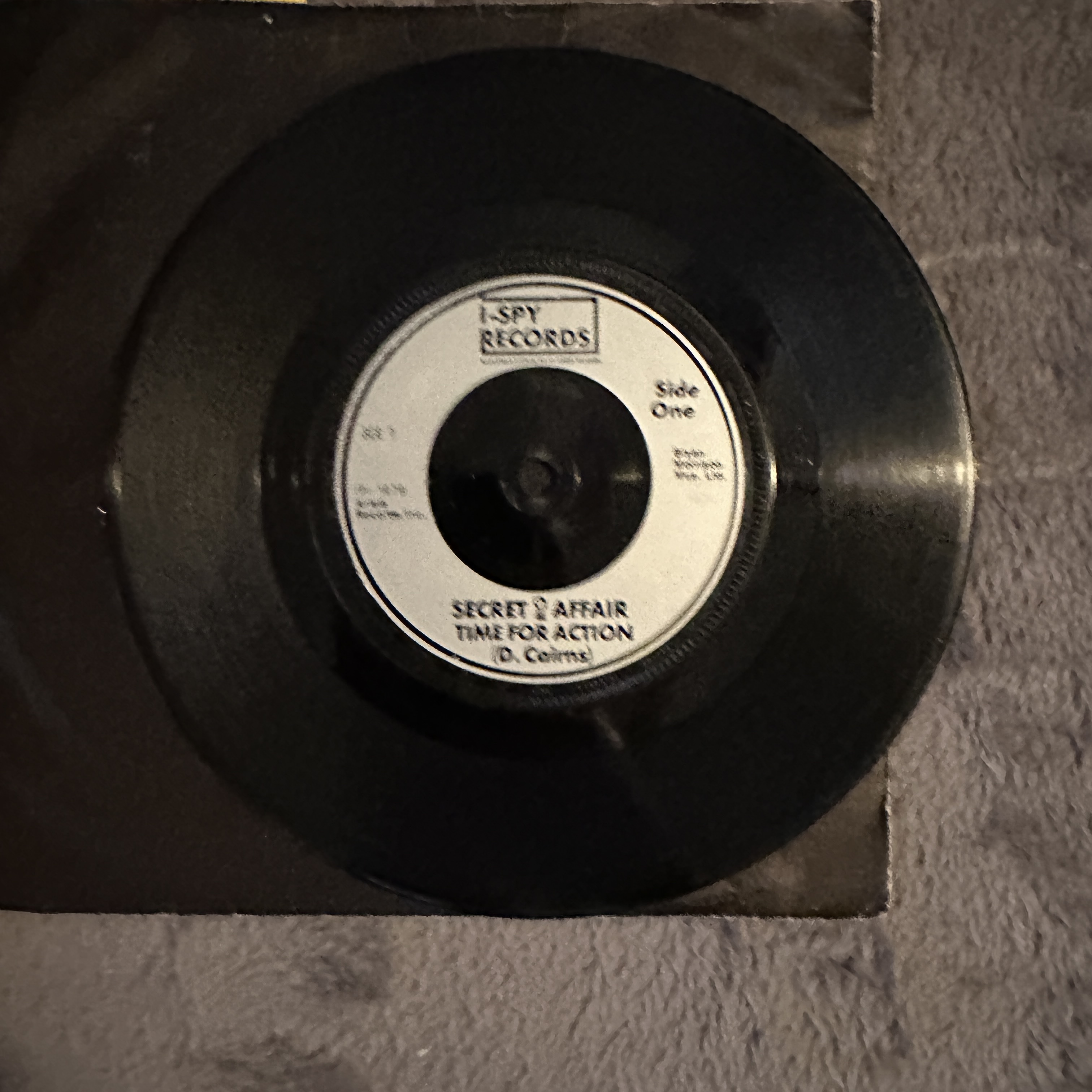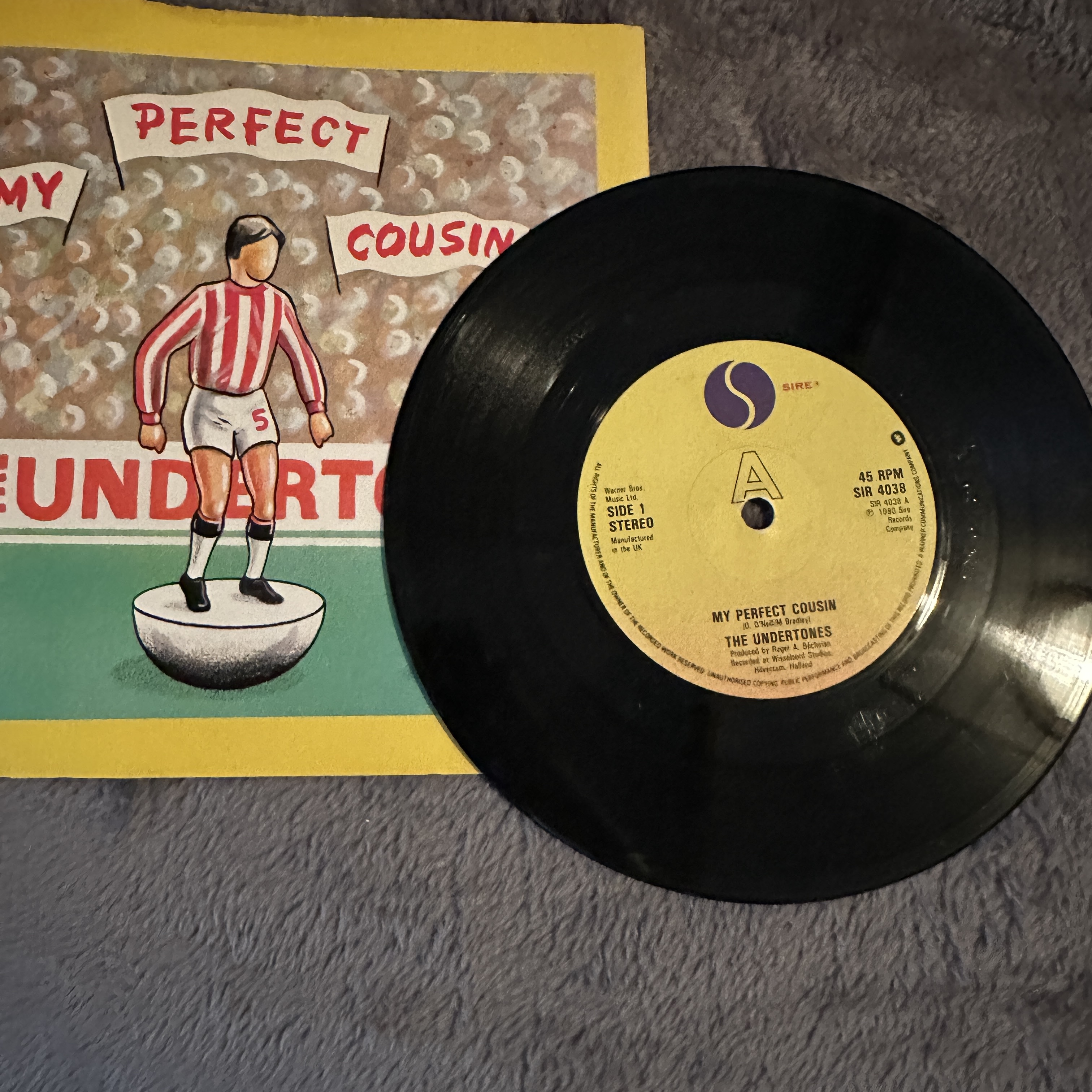 This lot comprises three 7-inch vinyl singles. The first is “My Perfect Cousin” by The Undertones, released on Sire Records (SUR 4038). The second single features “Secret Affair” and “Time for Action” by D. Cairns on I-Spy Records. Both records exhibit minor surface wear. The third item is a picture sleeve for “My Perfect Cousin” with cartoon artwork and text, showing some minor creasing and wear. All items appear to date from the late 20th century.