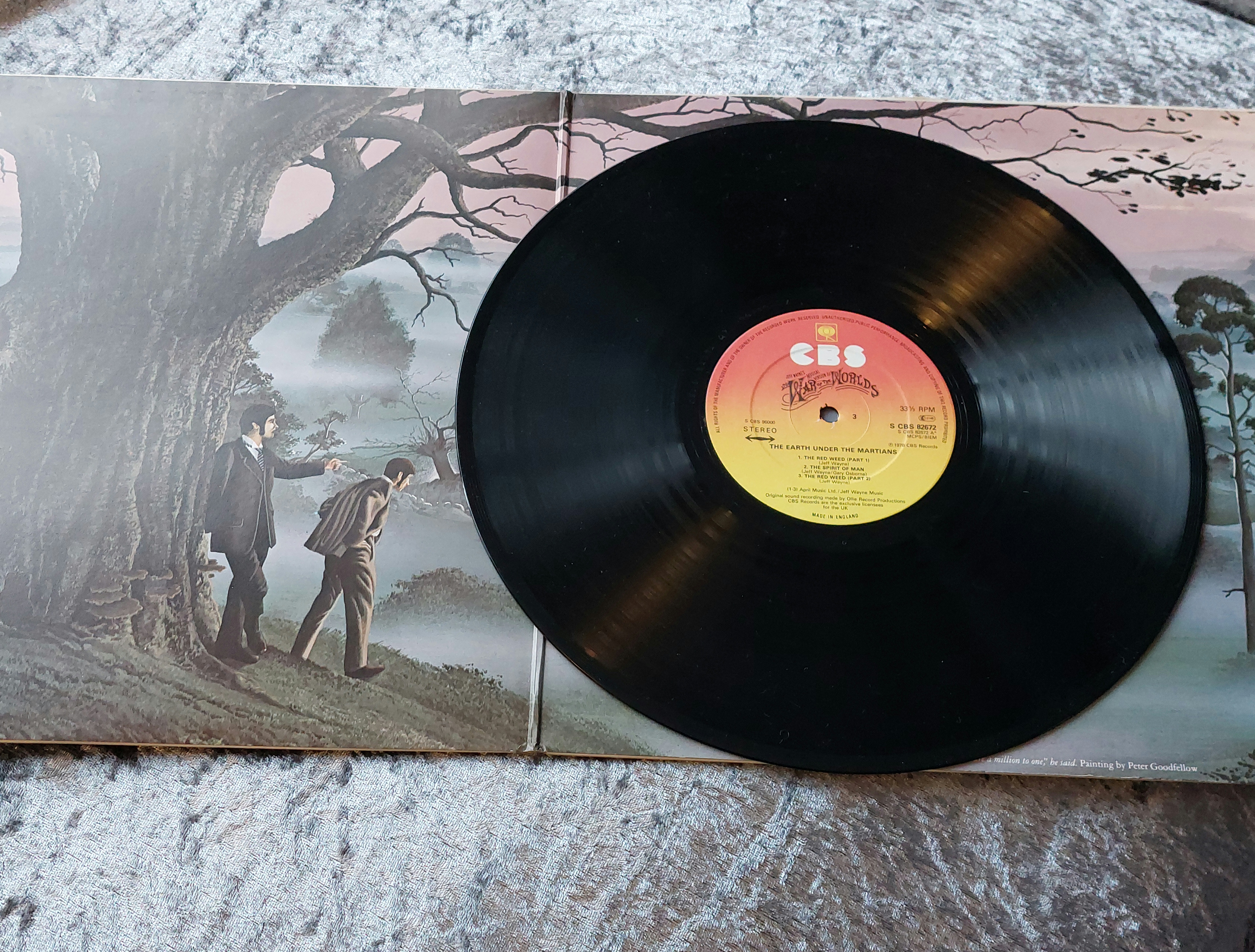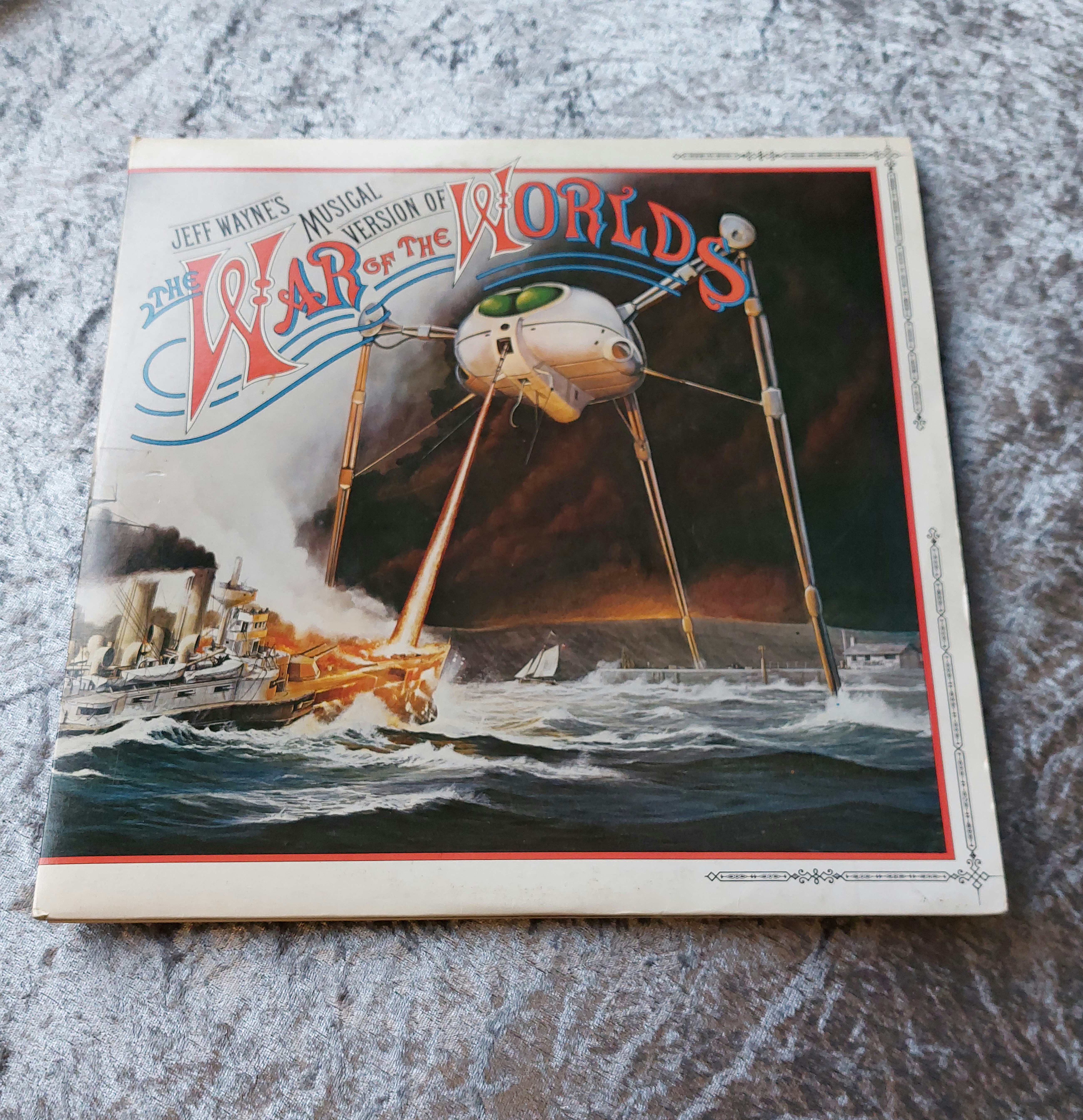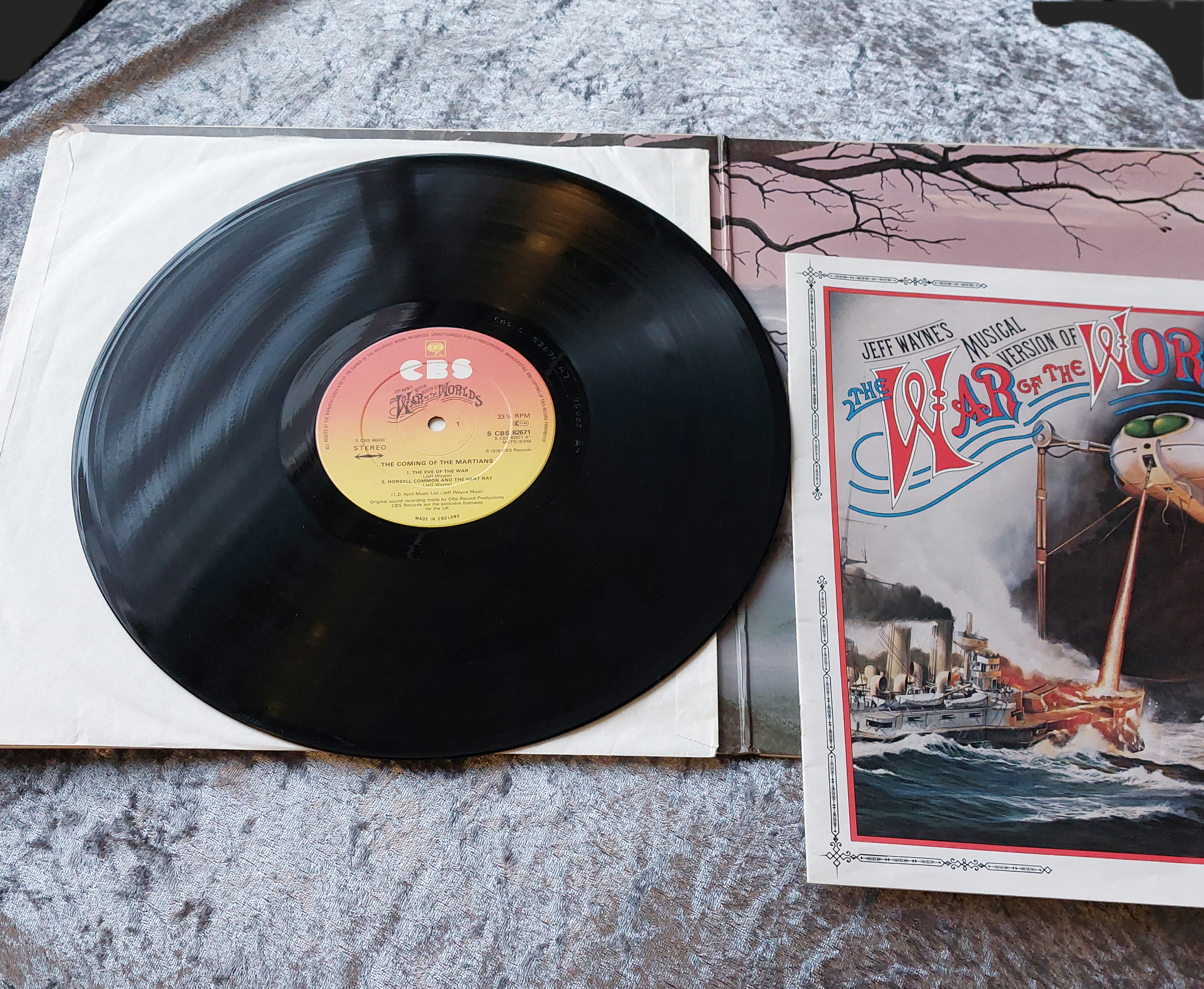 Double vinyl LP record album of Jeff Wayne’s Musical Version of *The War of the Worlds*. Gatefold cover features artwork depicting Martian fighting machines. Text on the cover indicates the title and musical adaptation. Vinyl records appear black with track listings and CBS Records on the labels.