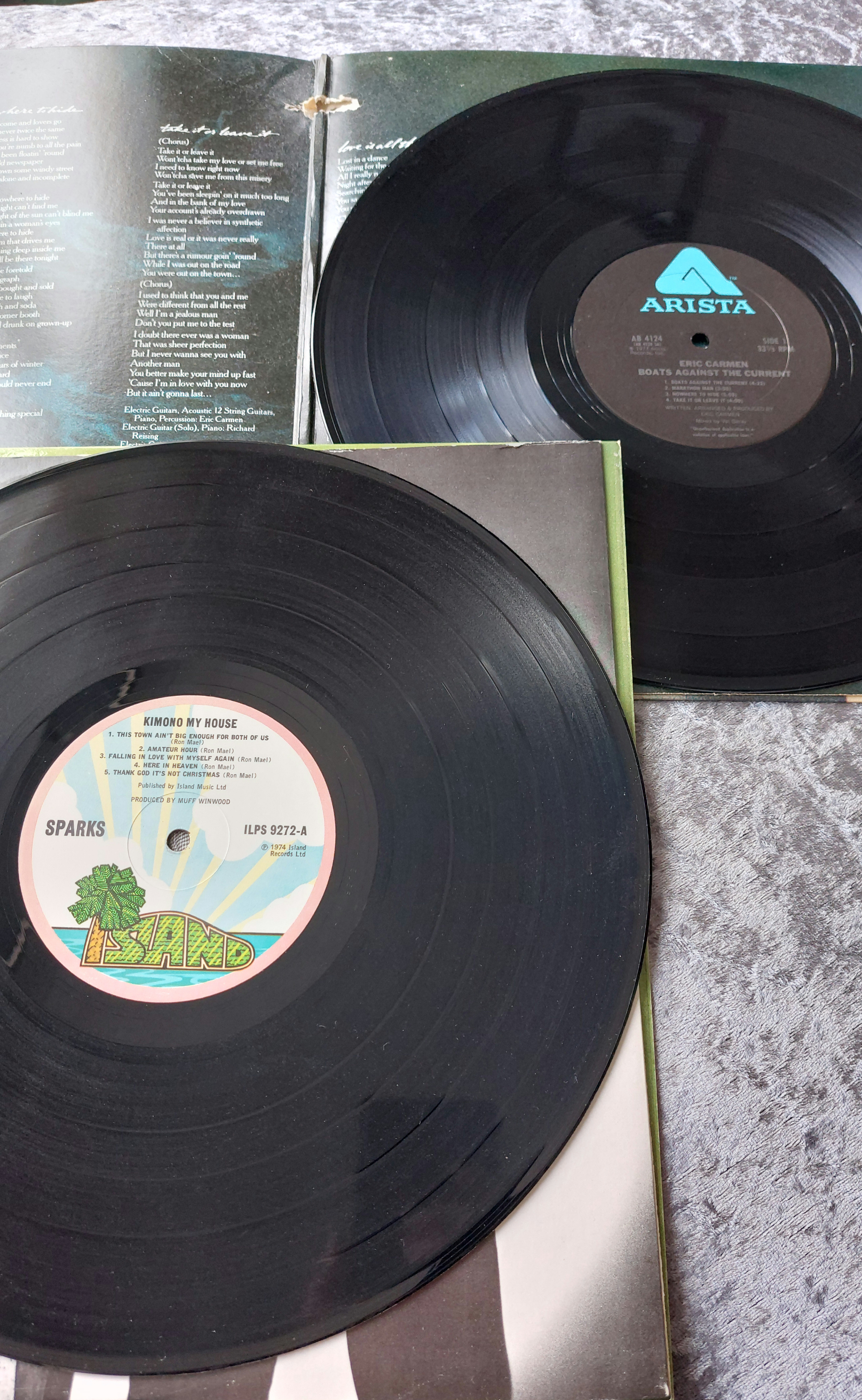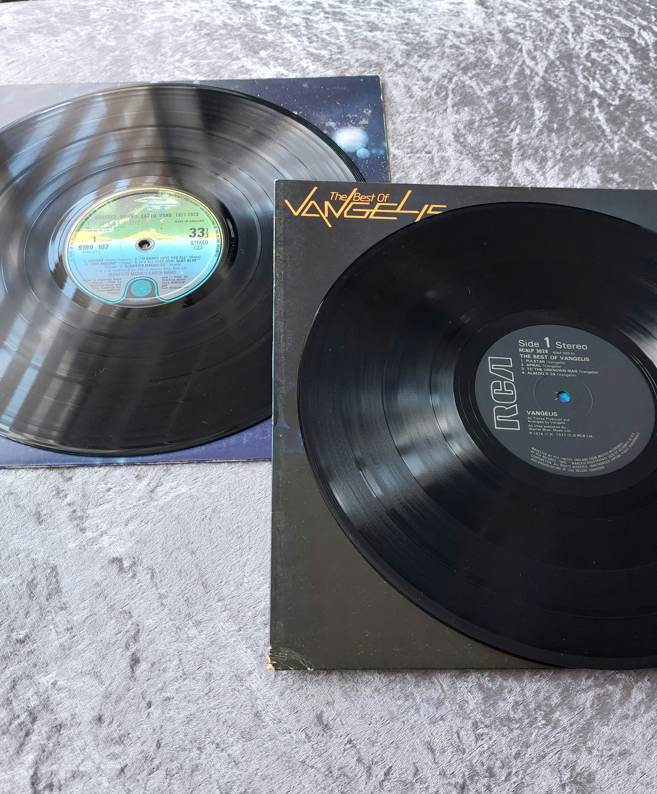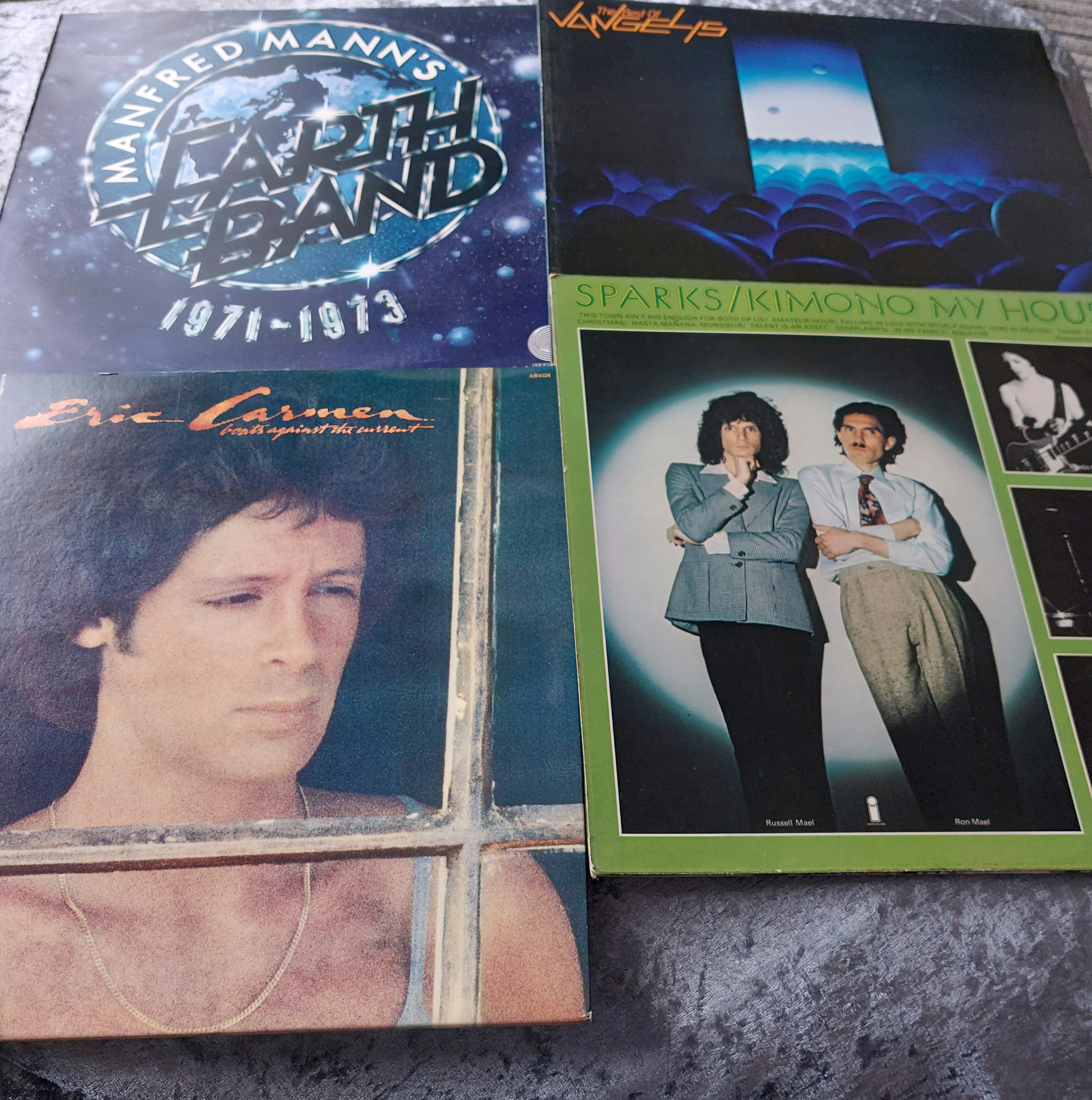 This lot comprises four vinyl LP records. Included are “Manfred Mann’s Earth Band 1971-1973,” “Eric Carmen,” “The Best of Vangelis,” and “Sparks/Kimono My House.” Three of the albums have gatefold sleeves. The records and sleeves show varying degrees of wear.