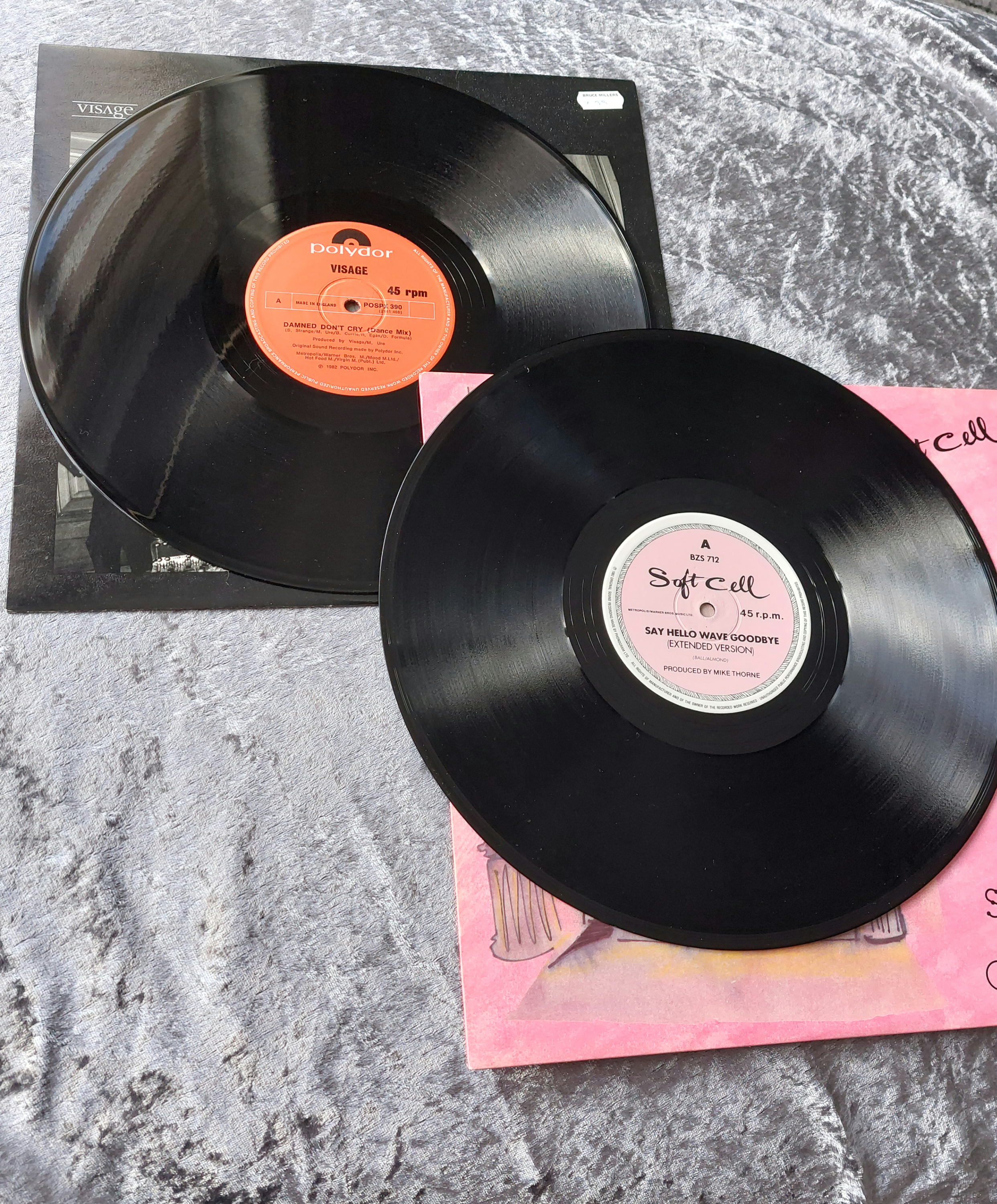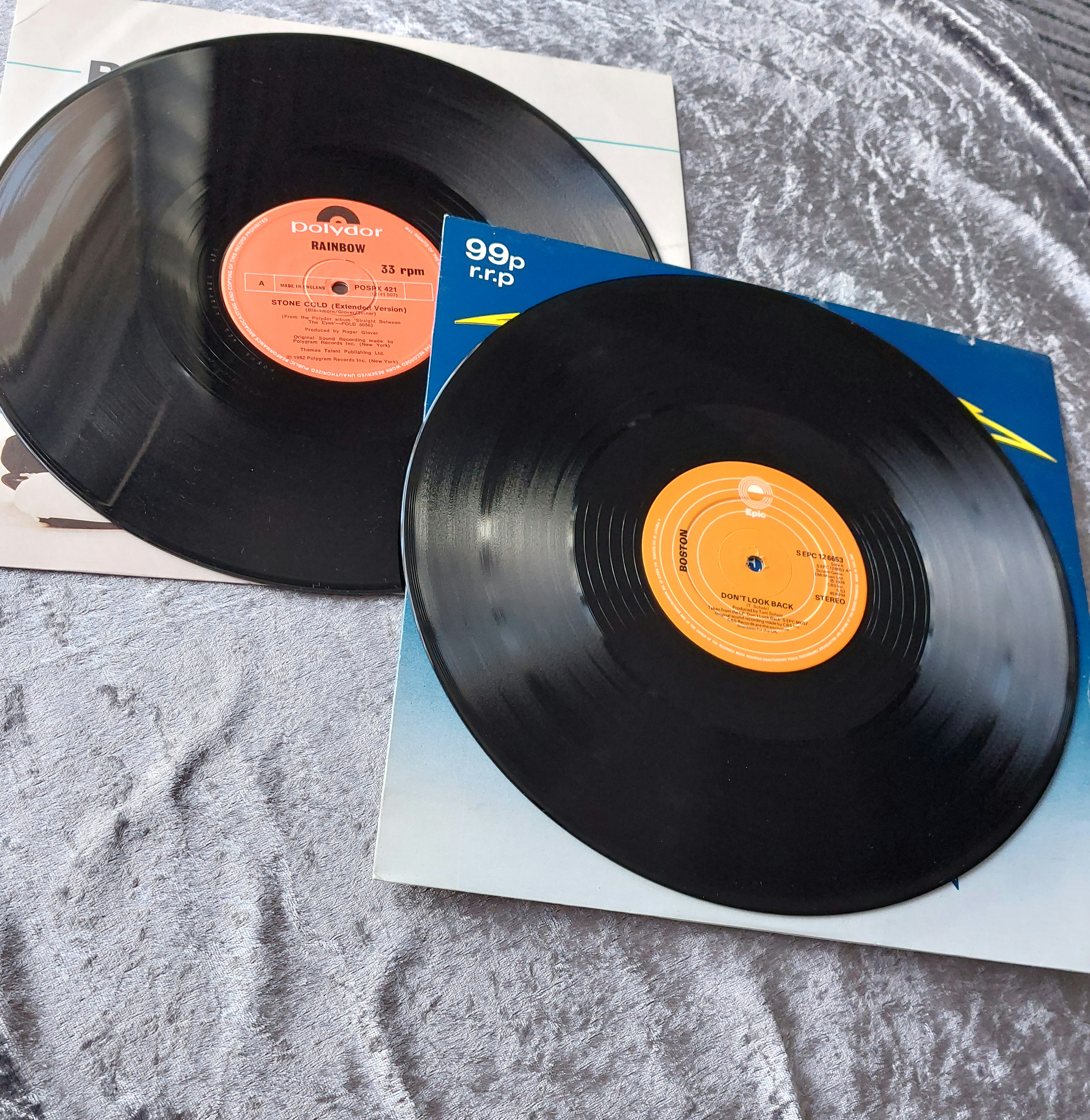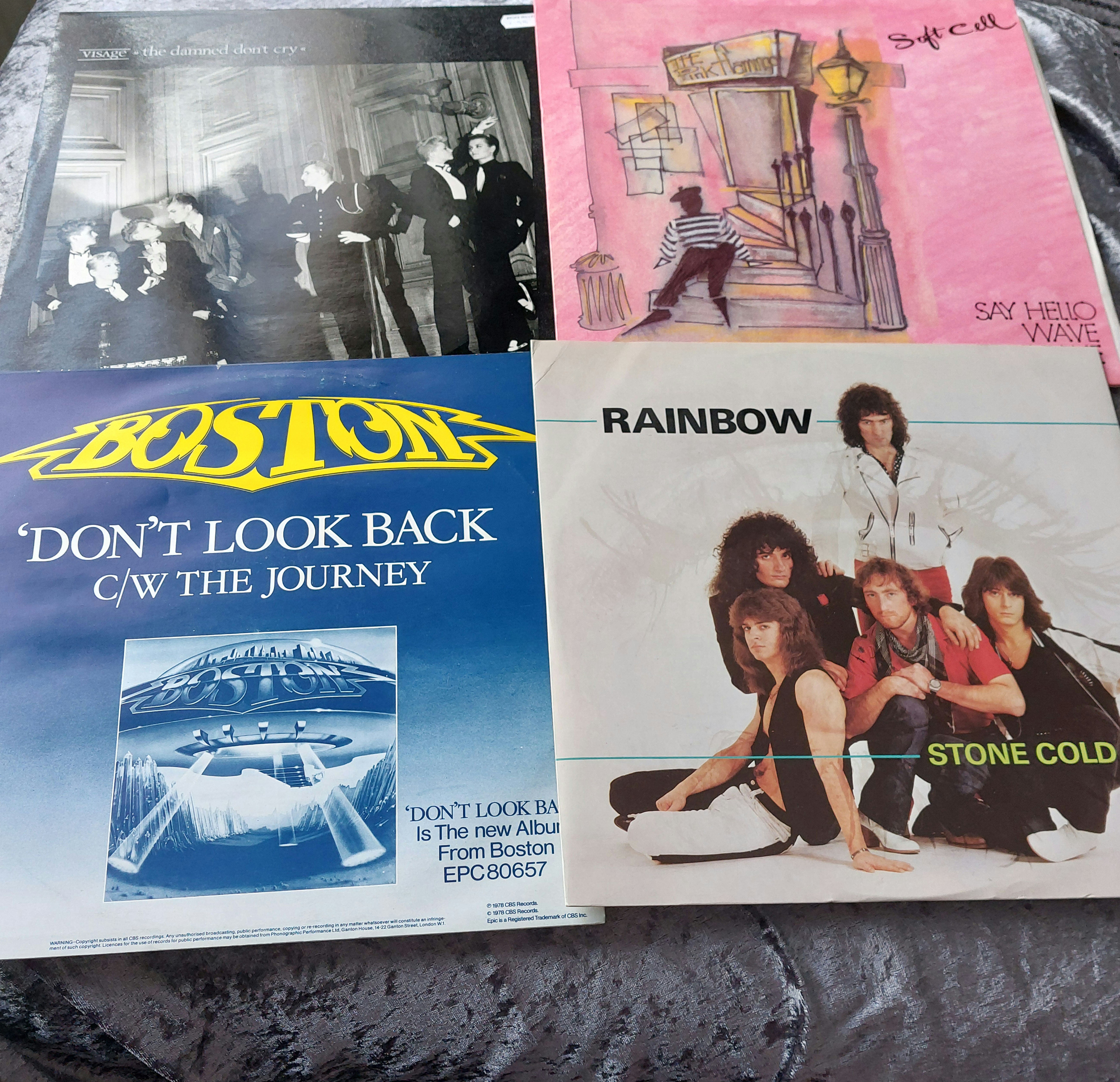 This lot comprises four vinyl records from the late 20th century, including two 7-inch singles and two 12-inch LPs. The 7-inch singles include Visage – “The Damned Don’t Cry” and Soft Cell – “Say Hello Wave Goodbye.” The 12-inch LPs include Boston – “Don’t Look Back” and Rainbow – “Stone Cold.” The records bear catalogue numbers including EPC 80657 and A9294 121, and a Polydor label is visible on some. Price markings such as “99p RRP” are also present.