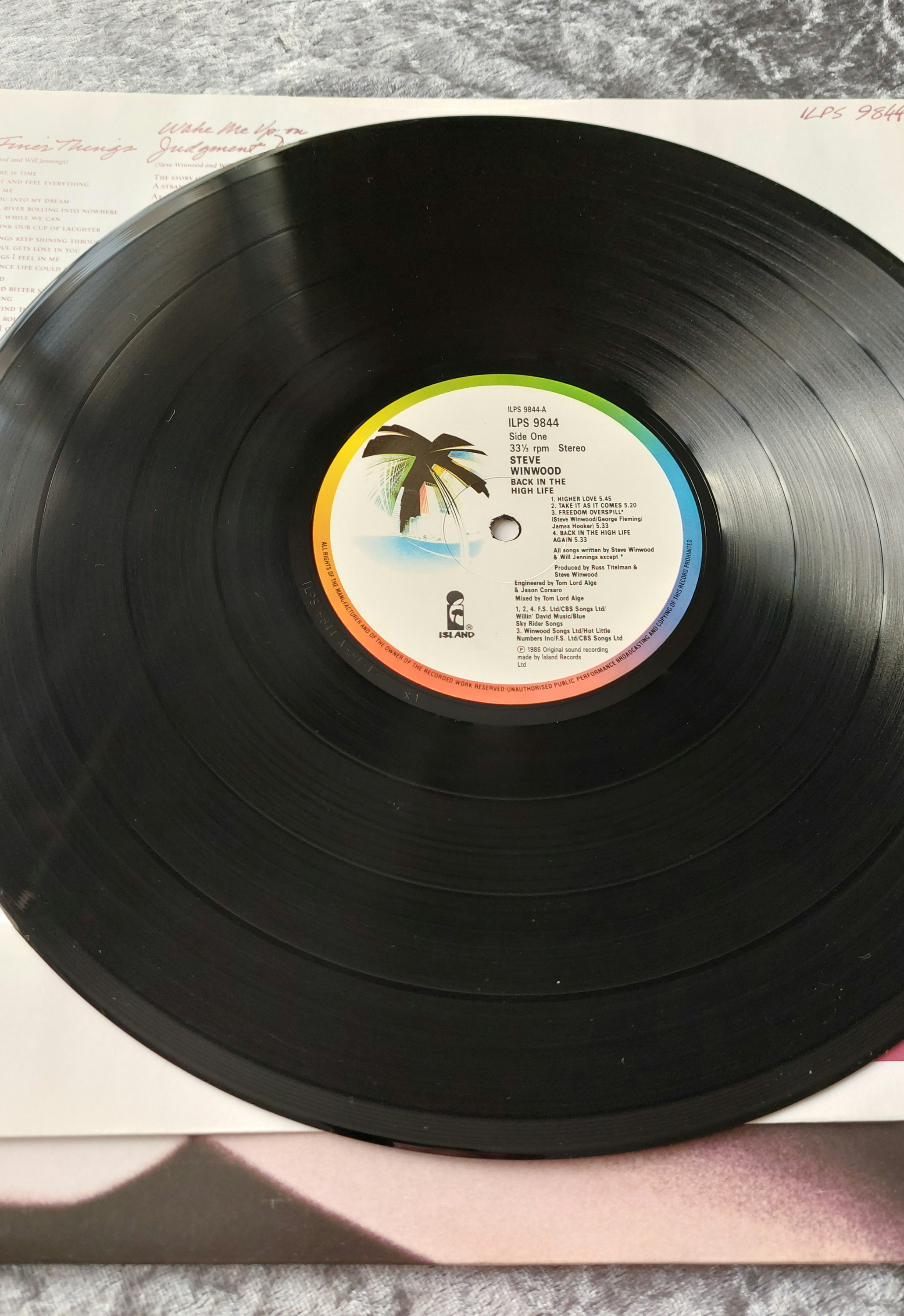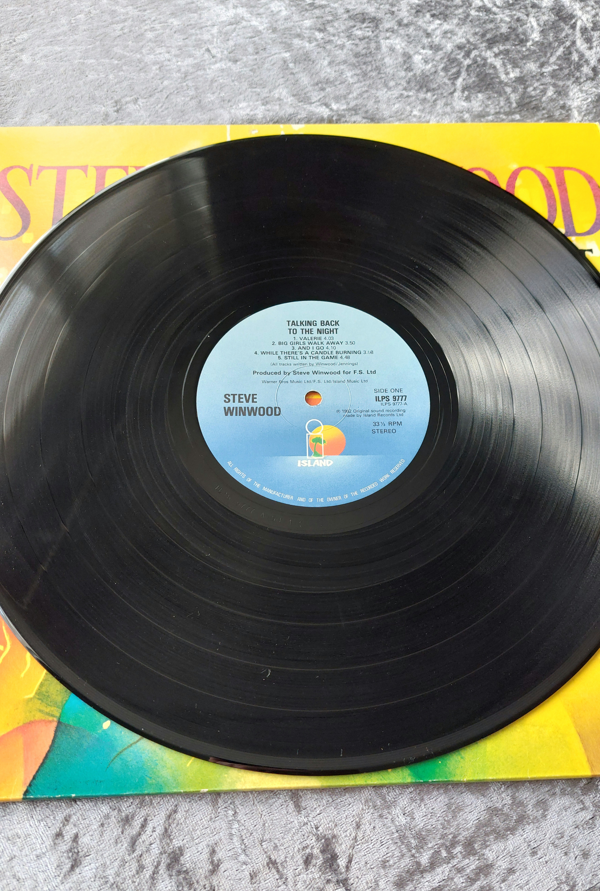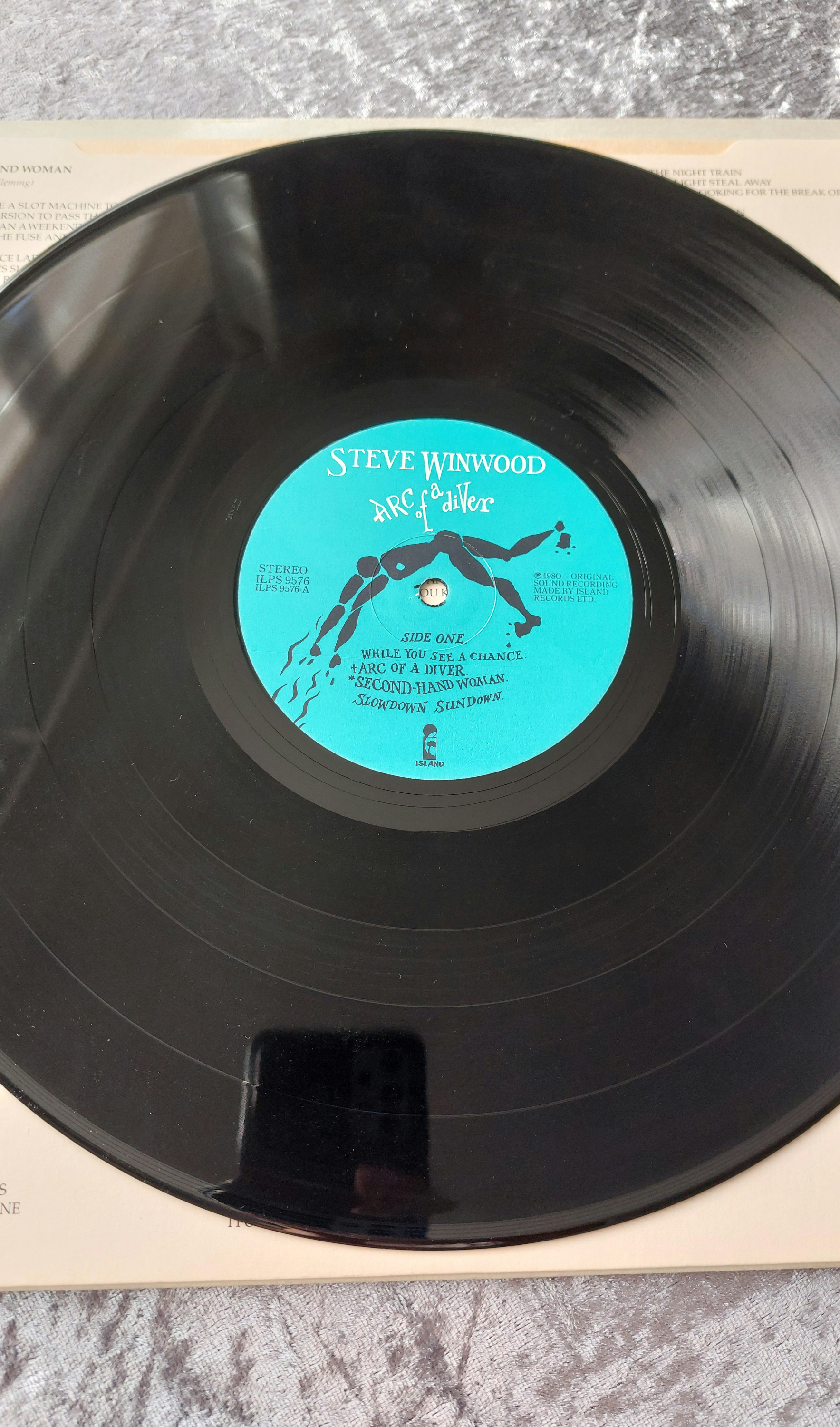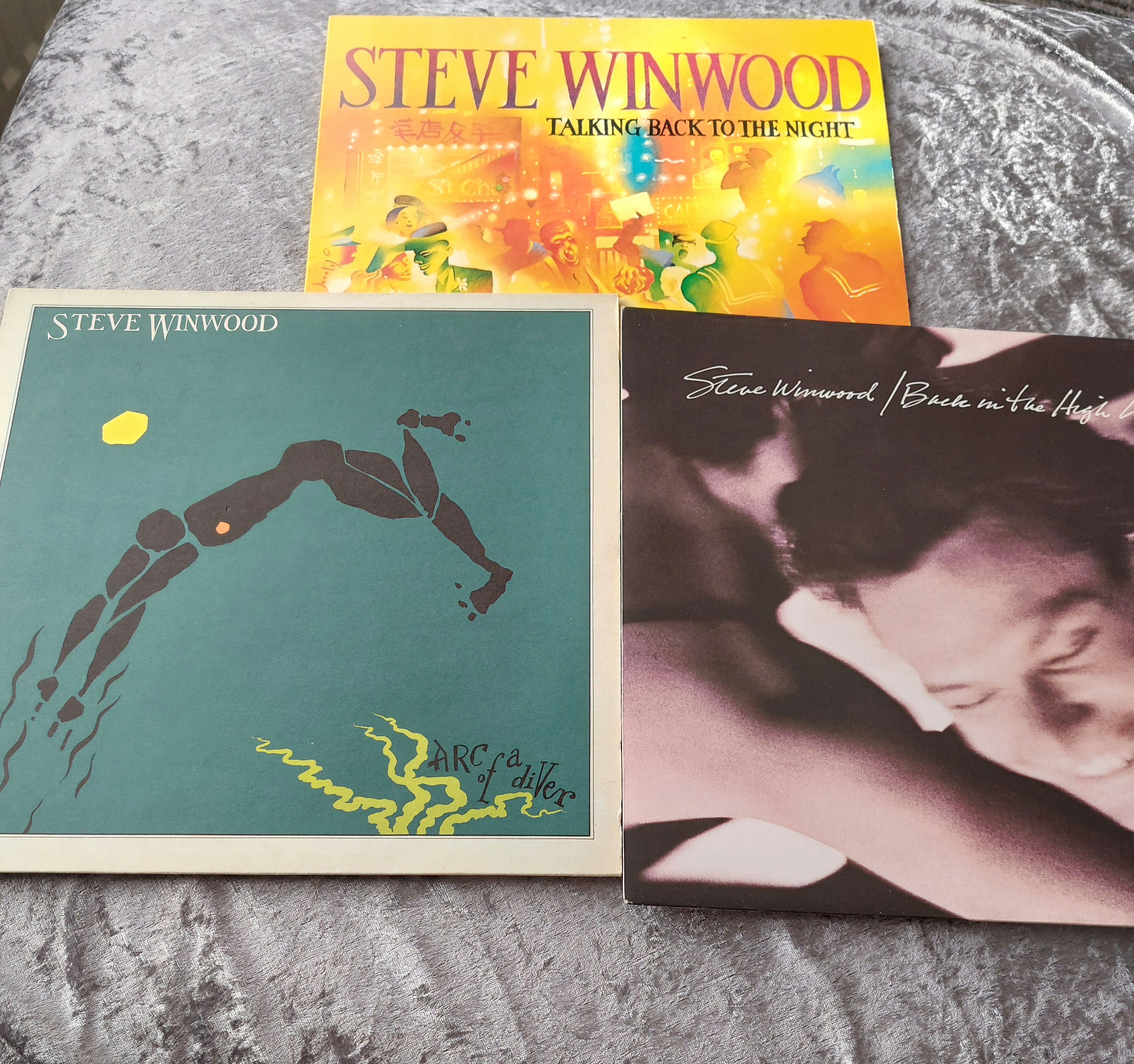 Three vinyl LPs by Steve Winwood, including *Talking Back to the Night* (ILPS 977), *Arc of a Diver*, and *Back in the High Life* (ILPS 9844). All three albums are on the Island Records label. *Talking Back to the Night* features cover art depicting a city scene at night. *Arc of a Diver* features an abstract image of a diver. *Back in the High Life* features a close-up portrait of Steve Winwood. The records are black vinyl.