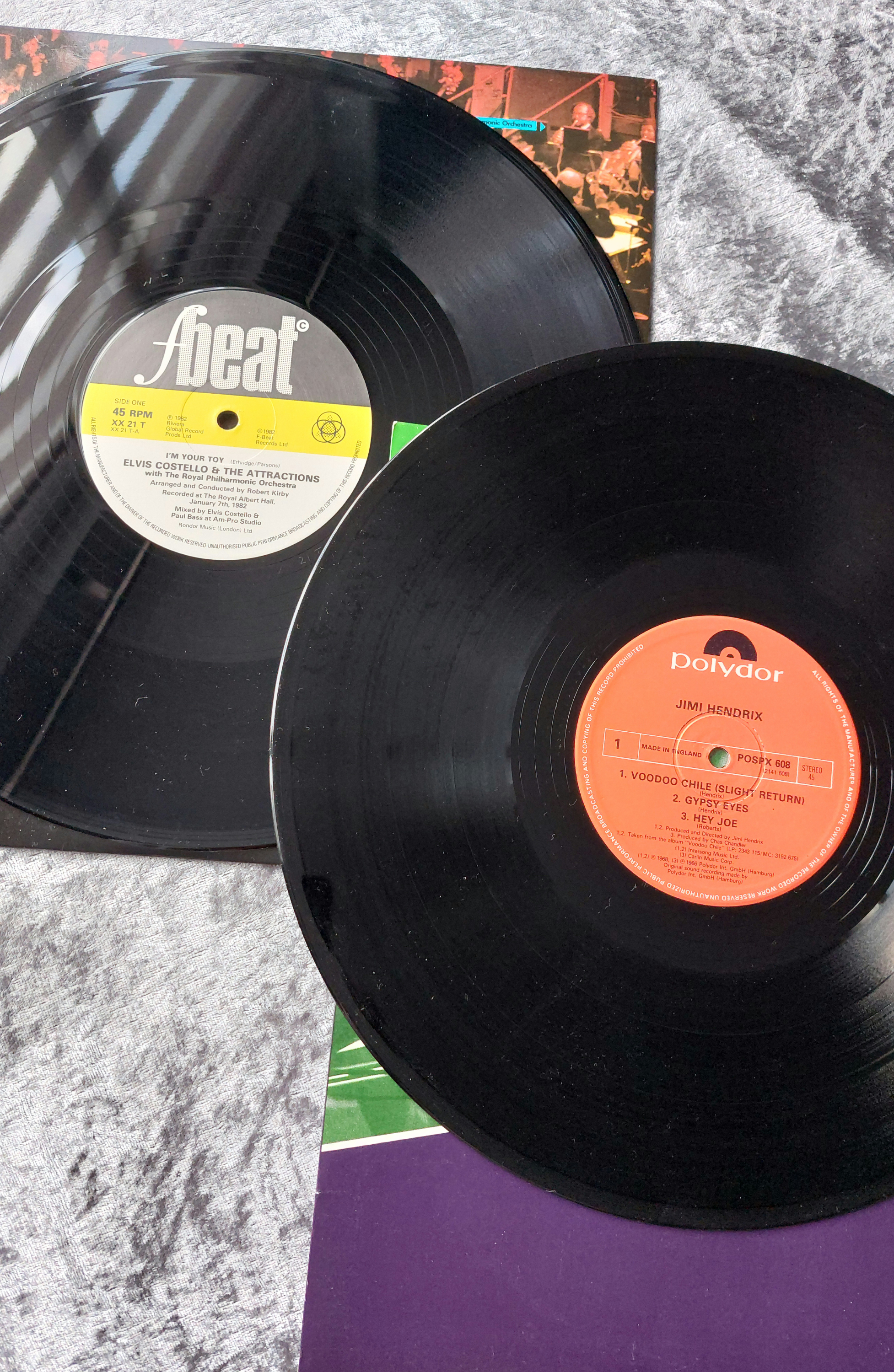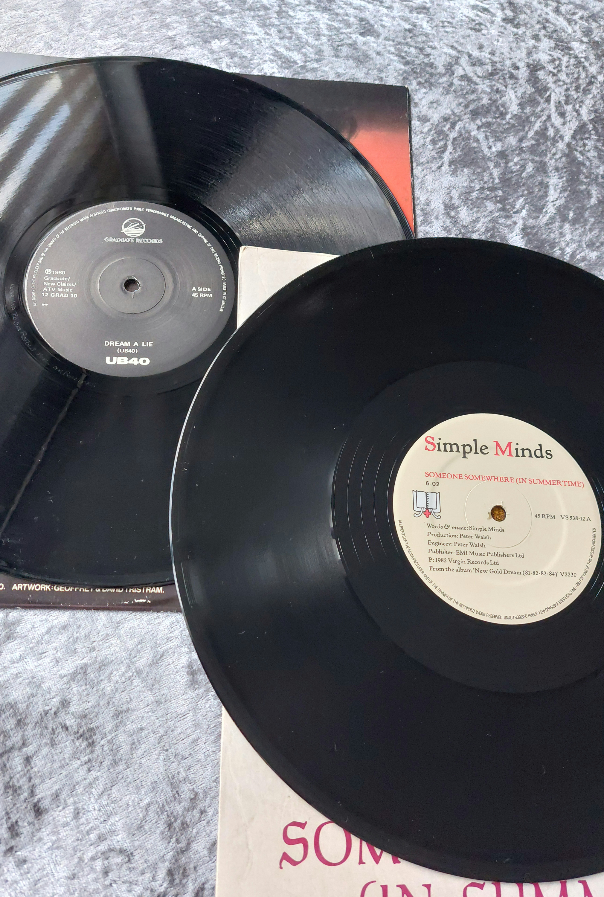 This lot comprises four 7-inch vinyl single records with their original picture sleeves. The records include: UB40 “Dream a Lie,” Simple Minds “Someone Somewhere in Summertime,” Jimi Hendrix “Voodoo Chile (Slight Return),” and Elvis Costello and the Attractions “I’m Your Toy.” The sleeves exhibit varying degrees of wear, including creasing and edge wear commensurate with age and handling. The vinyl records themselves appear to be in generally good condition, though some surface imperfections may be present upon closer inspection. Labels include artist and song title information, along with record company details (Chrysalis Records, EMI, Polydor, A&M Records/Beat Records).