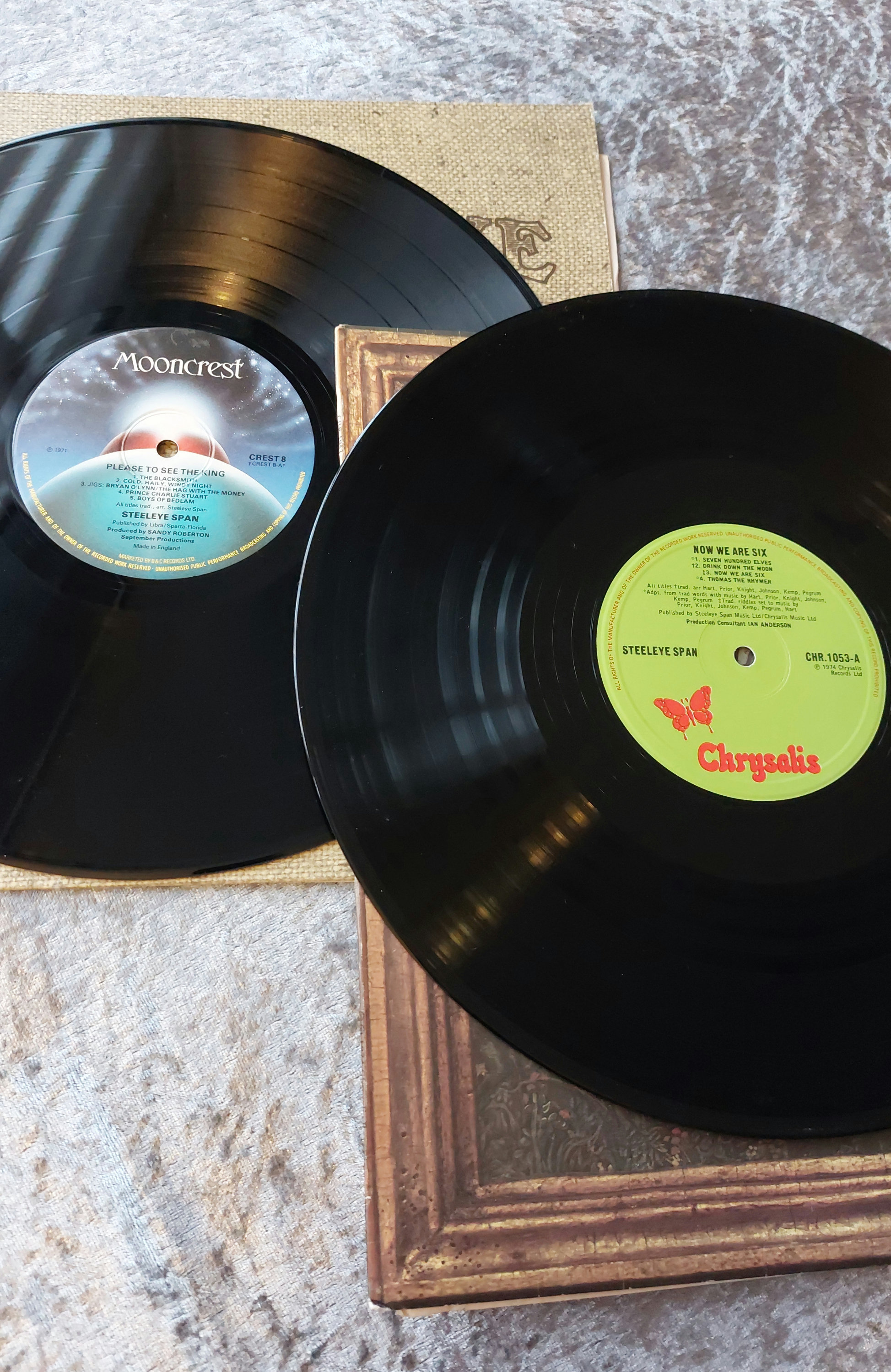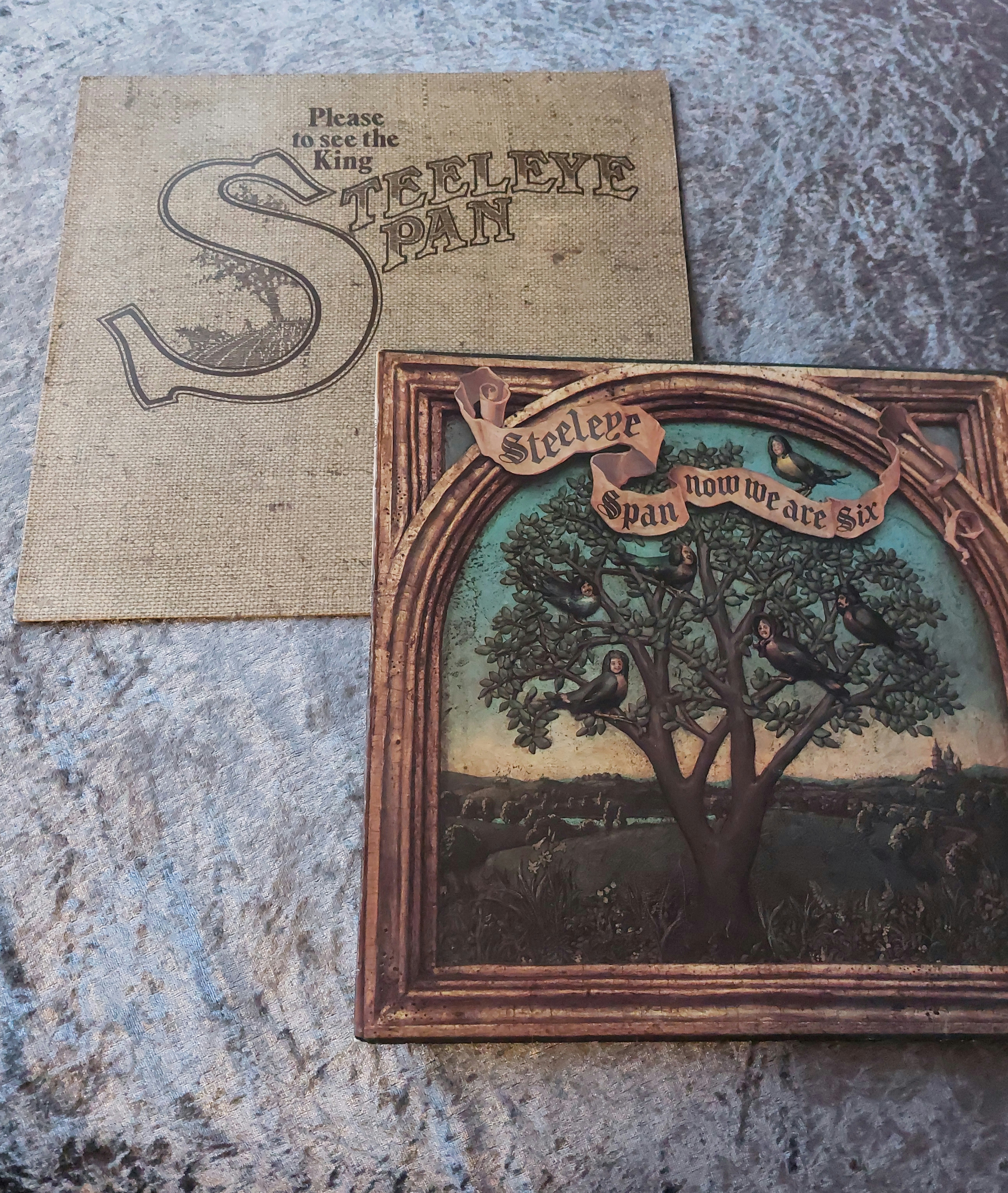 A vinyl double LP record album by Steeleye Span titled “Now We Are Six.” The album includes a gatefold cover with artwork depicting a tree and birds in a medieval or Renaissance-inspired frame. The cover appears to be made of heavy cardboard. An inner sleeve of light brown textured paper features the album title and band name. Two black vinyl LPs bear Chrysalis Records labels with track listings and other information.