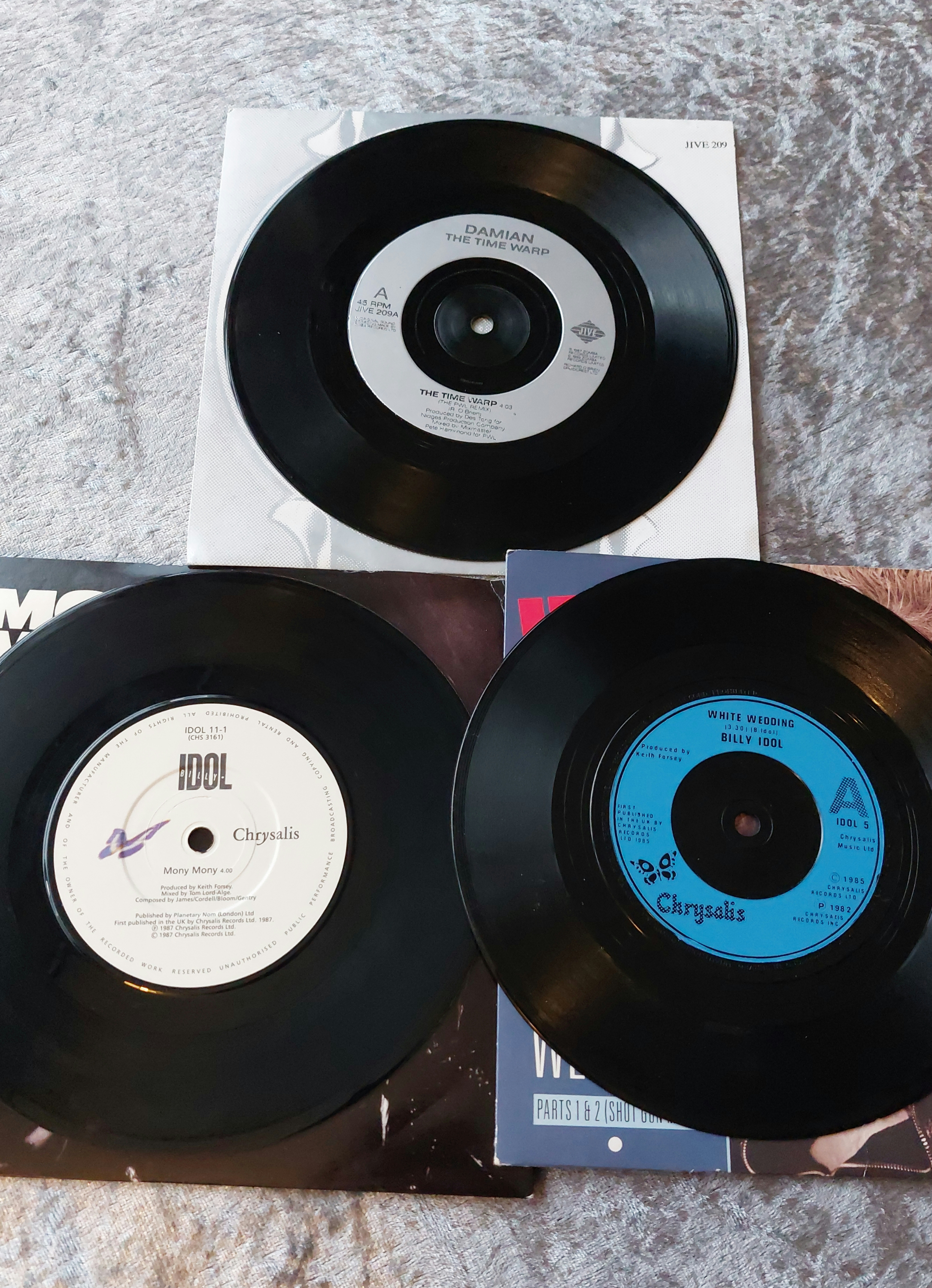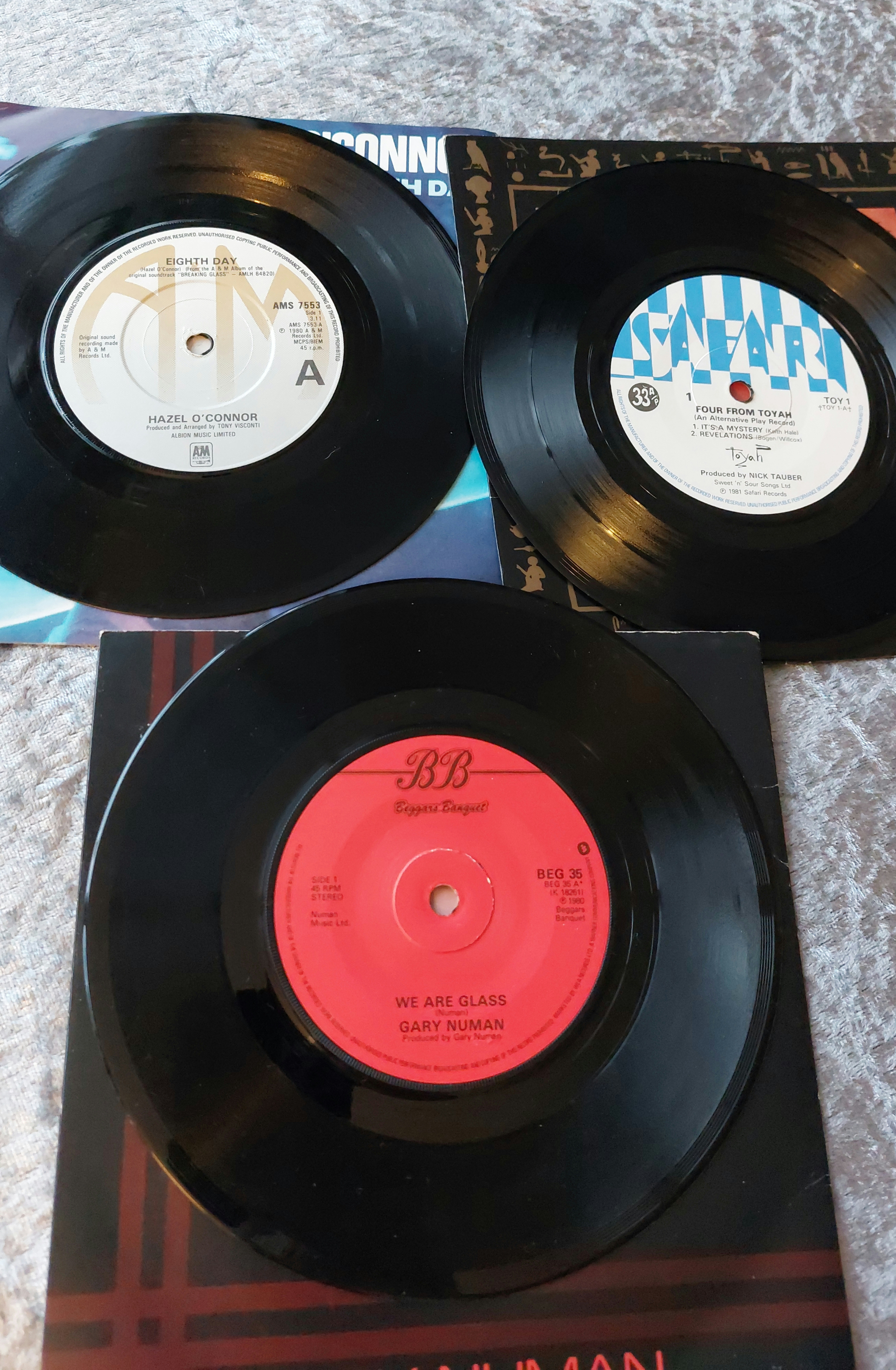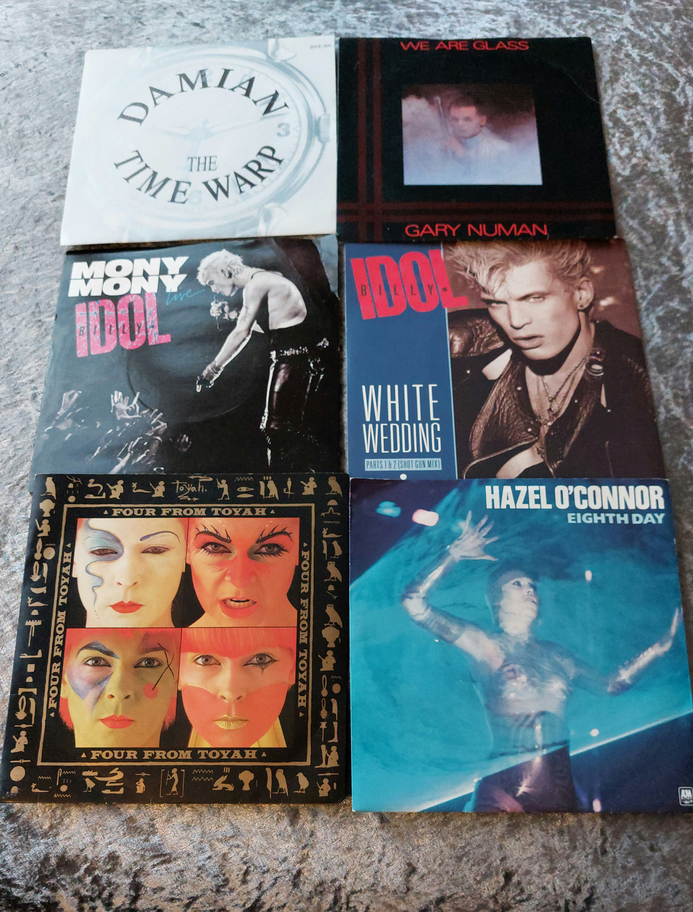 A collection of nine 7-inch vinyl single records featuring artists prominent in the late 1970s and 1980s new wave and post-punk genres, including Gary Numan, Billy Idol, Hazel O’Connor, and Toyah. The records are housed in their original picture sleeves. Record labels bear artist and song titles, along with catalog numbers and record company information, such as Chrysalis Records.