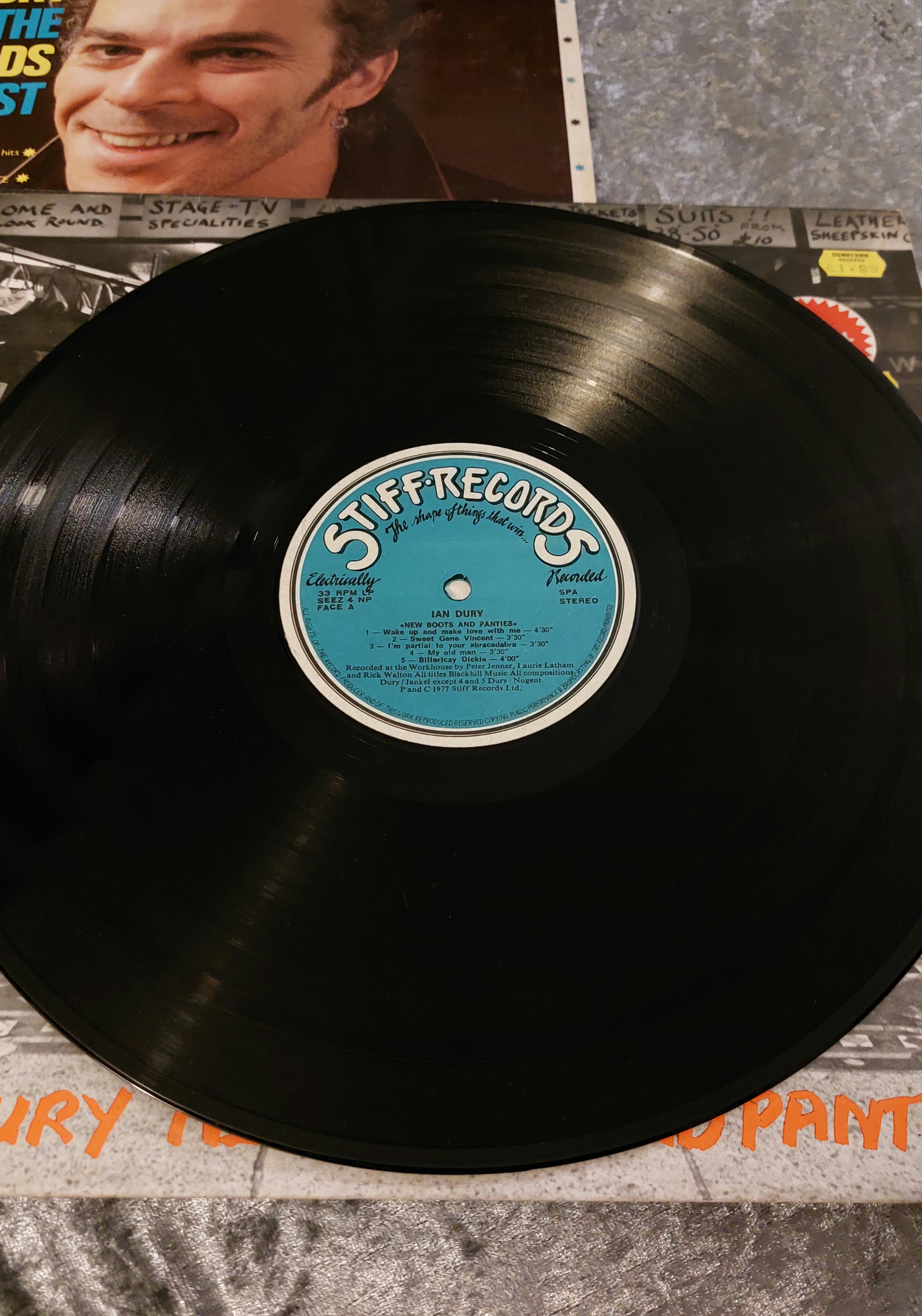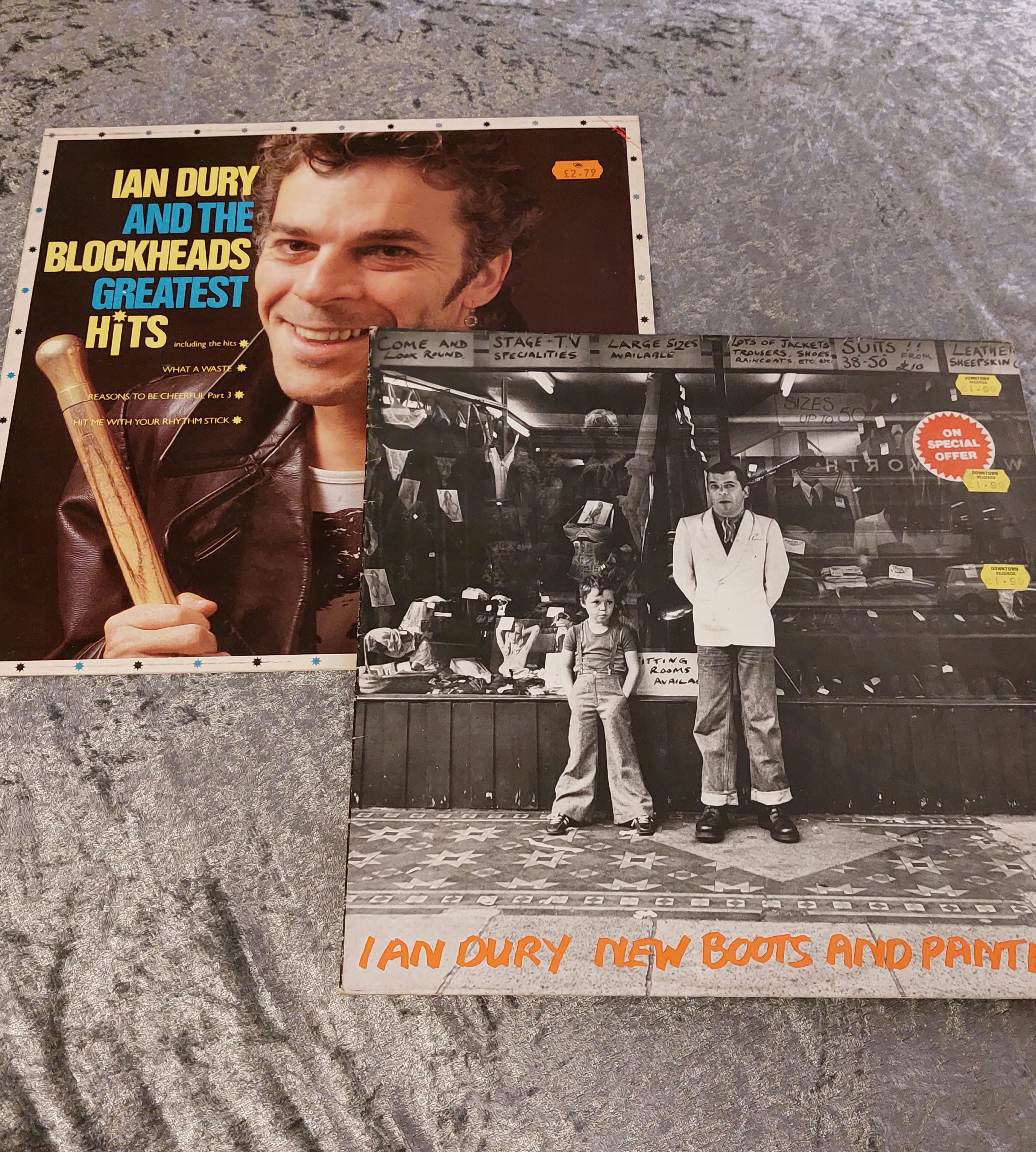 Two vinyl LP records by Ian Dury. One LP is titled “New Boots and Panties!!”, featuring a black and white photographic cover depicting two men and a child. The other LP is titled “Ian Dury and the Blockheads Greatest Hits,” with a color photographic cover of Ian Dury. The “New Boots and Panties!!” LP bears a Stiff Records label, while the “Greatest Hits” LP has a Fame label. Both appear to be late 20th-century releases.