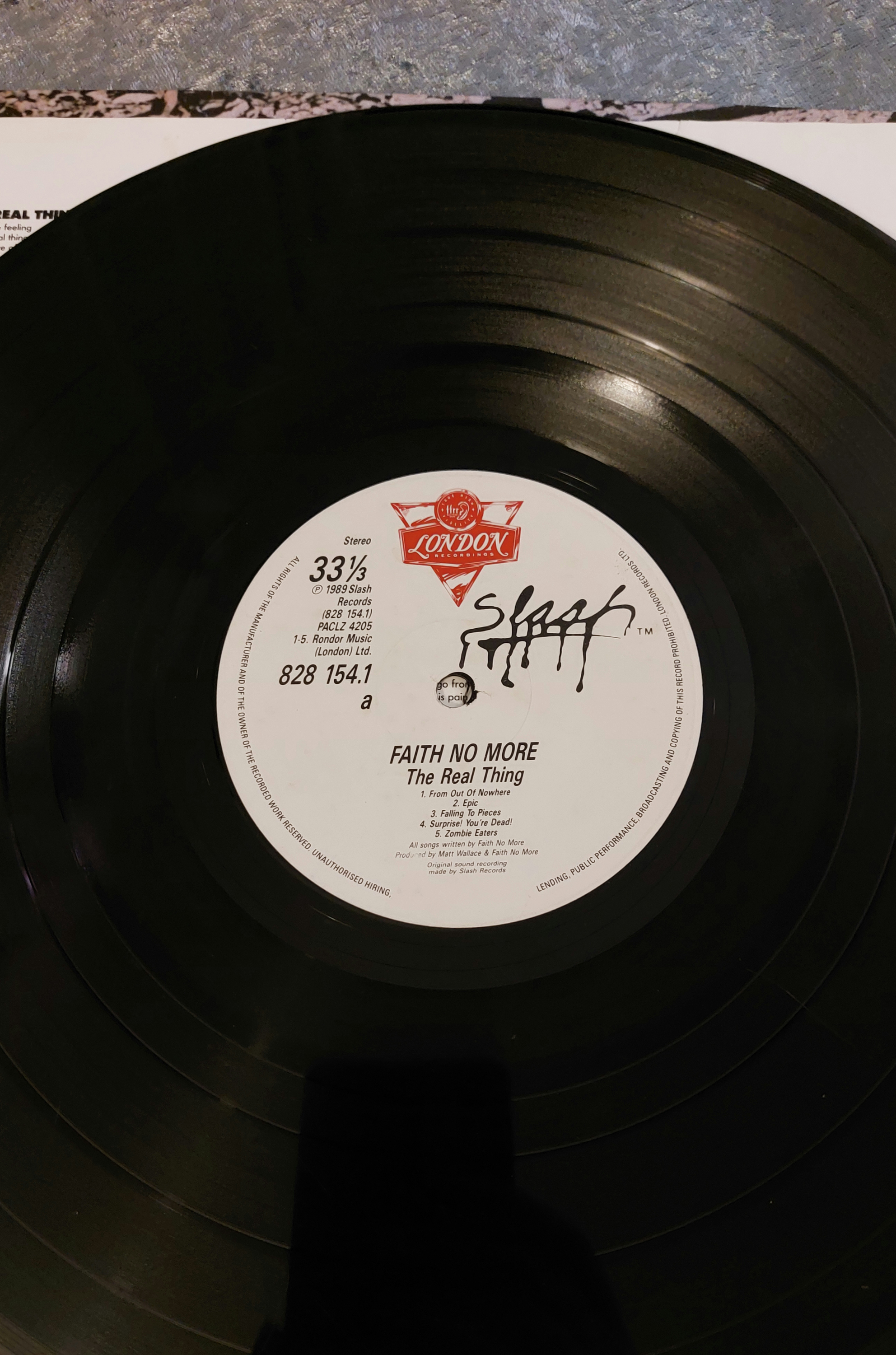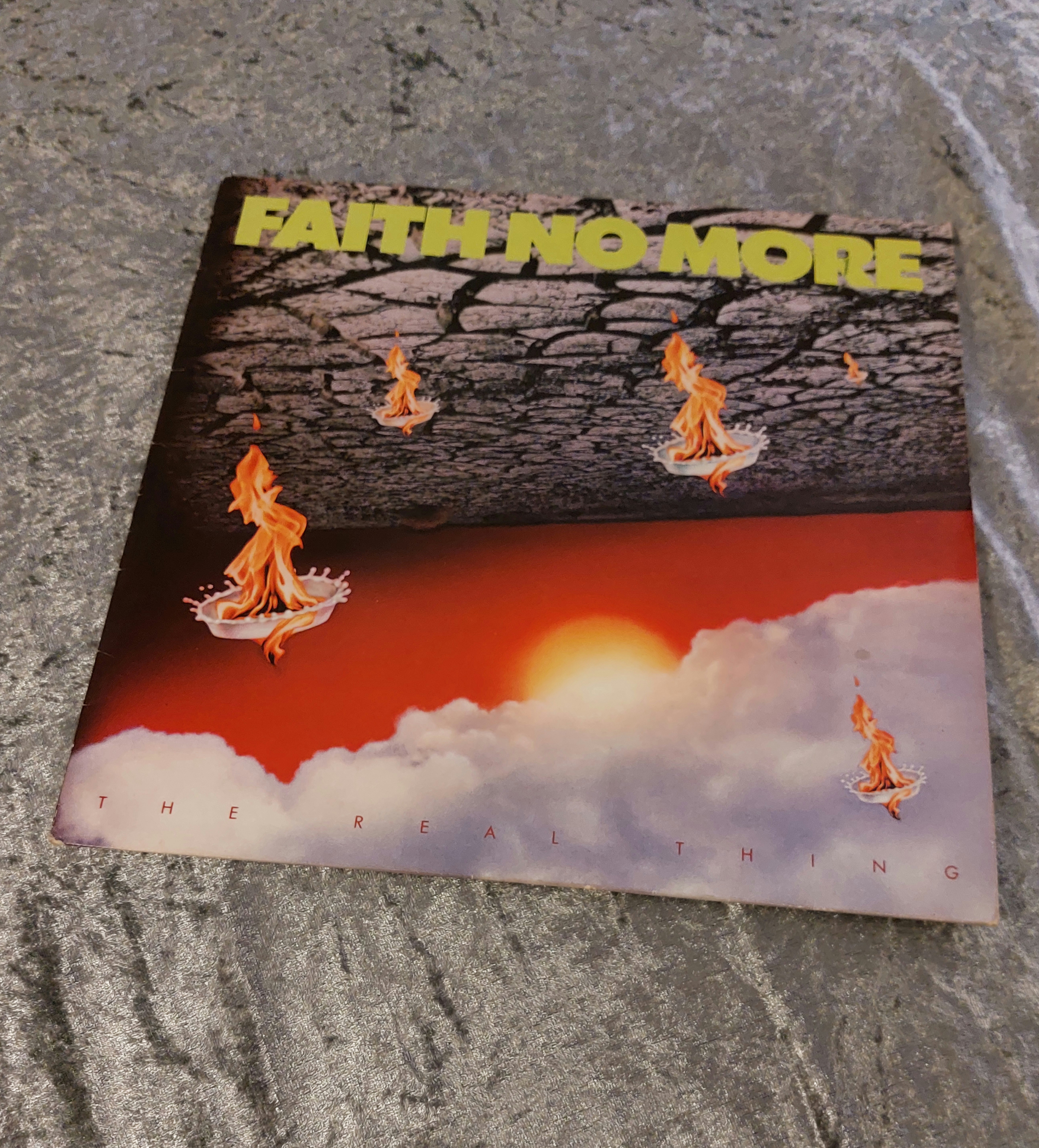 This listing presents a vinyl LP album of “The Real Thing” by Faith No More. The album cover features a surreal image of flames and a cracked earth-like surface against a sunset backdrop, printed in color on card stock. The vinyl record itself is black and includes printed text with the band name, album title, track listing, and London Records label information. The record appears to be a 1989 pressing based on the Discogs entries.