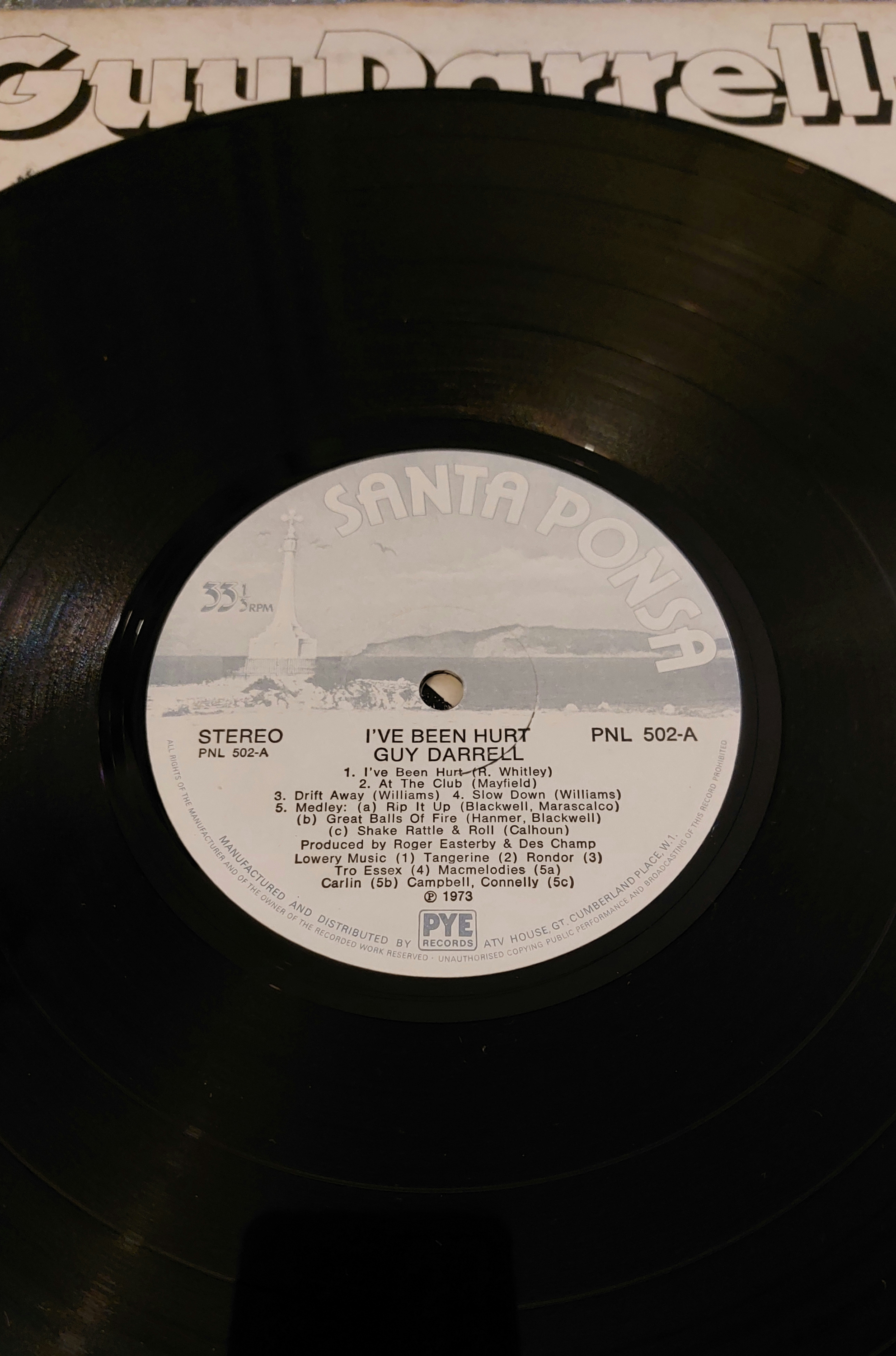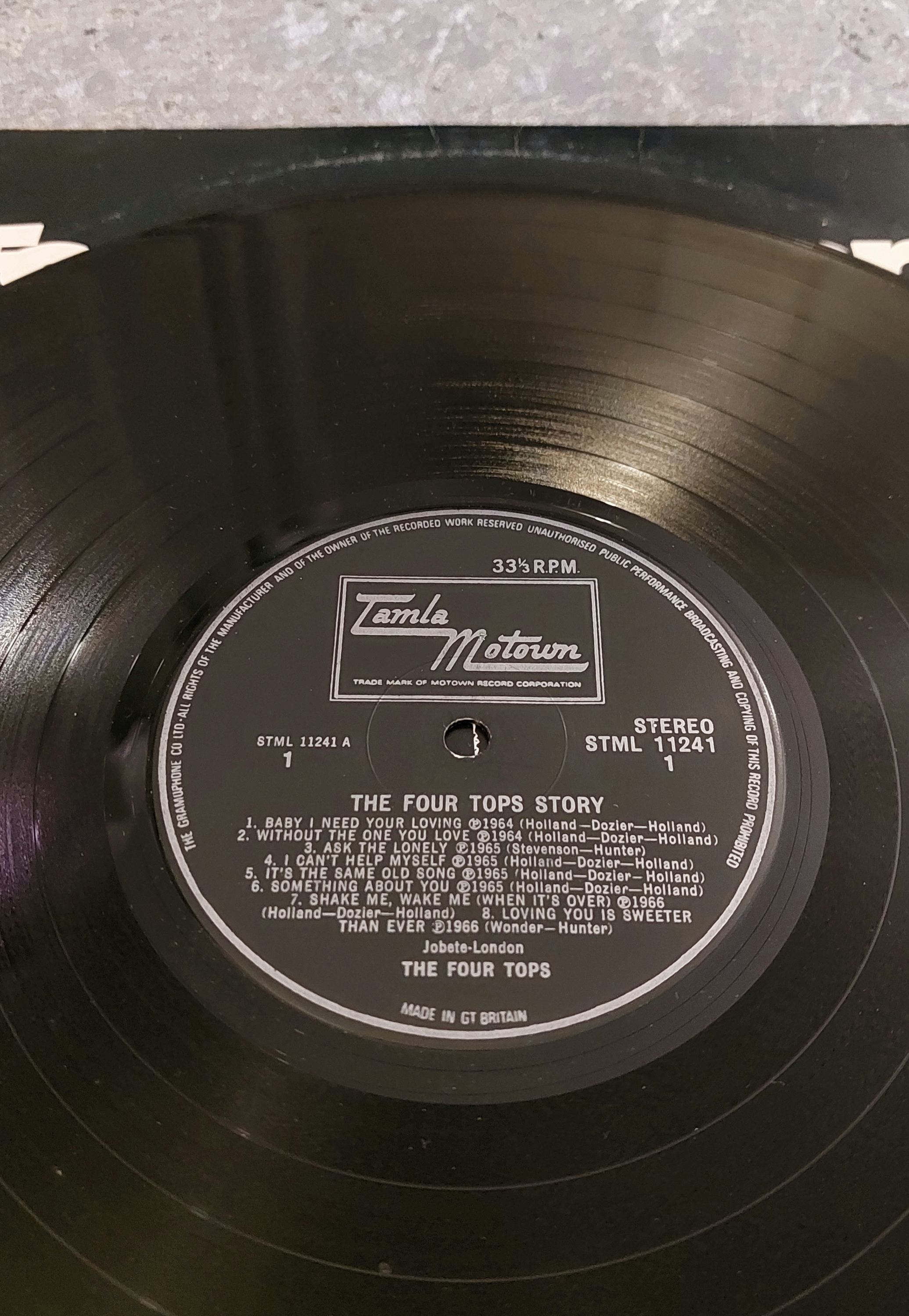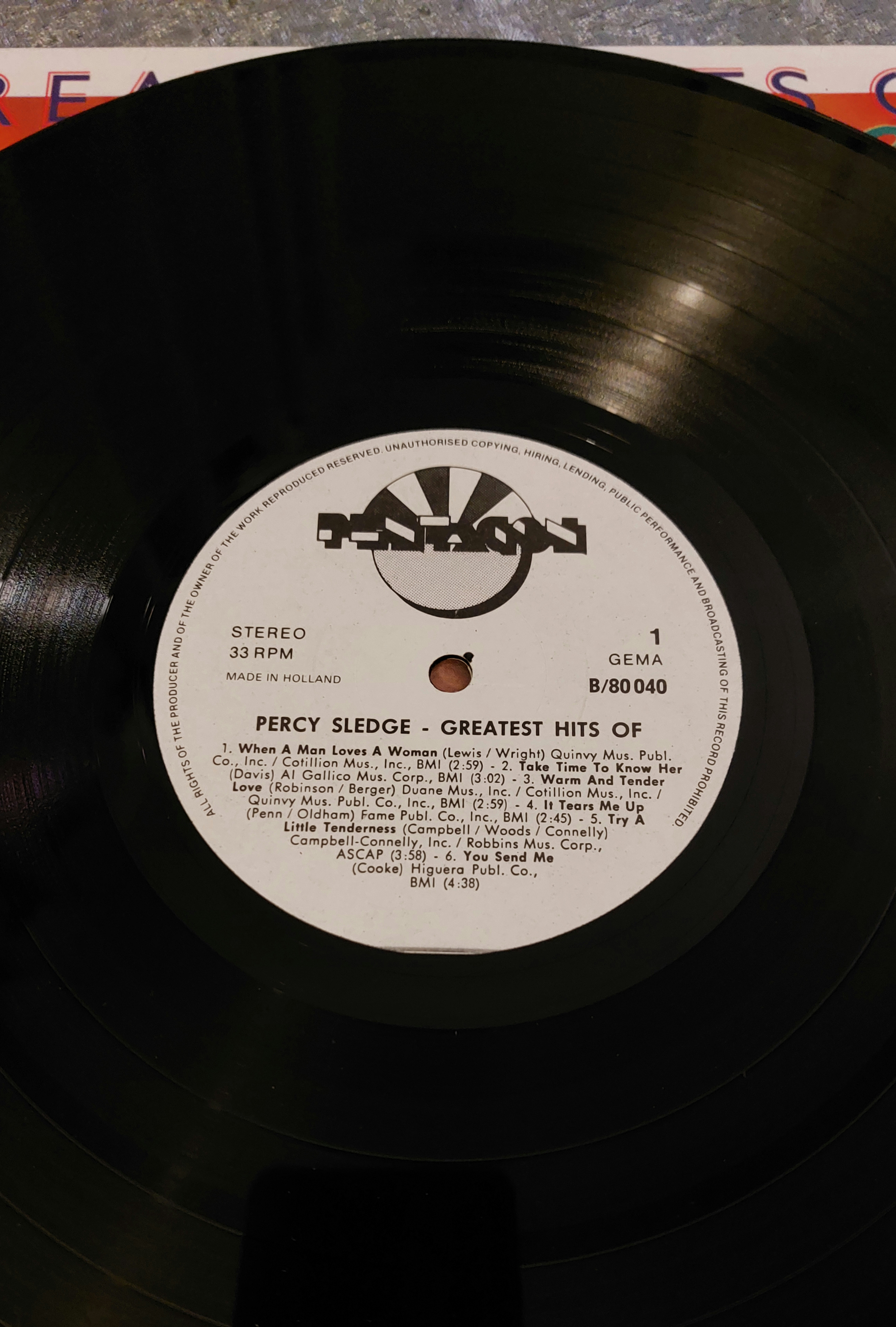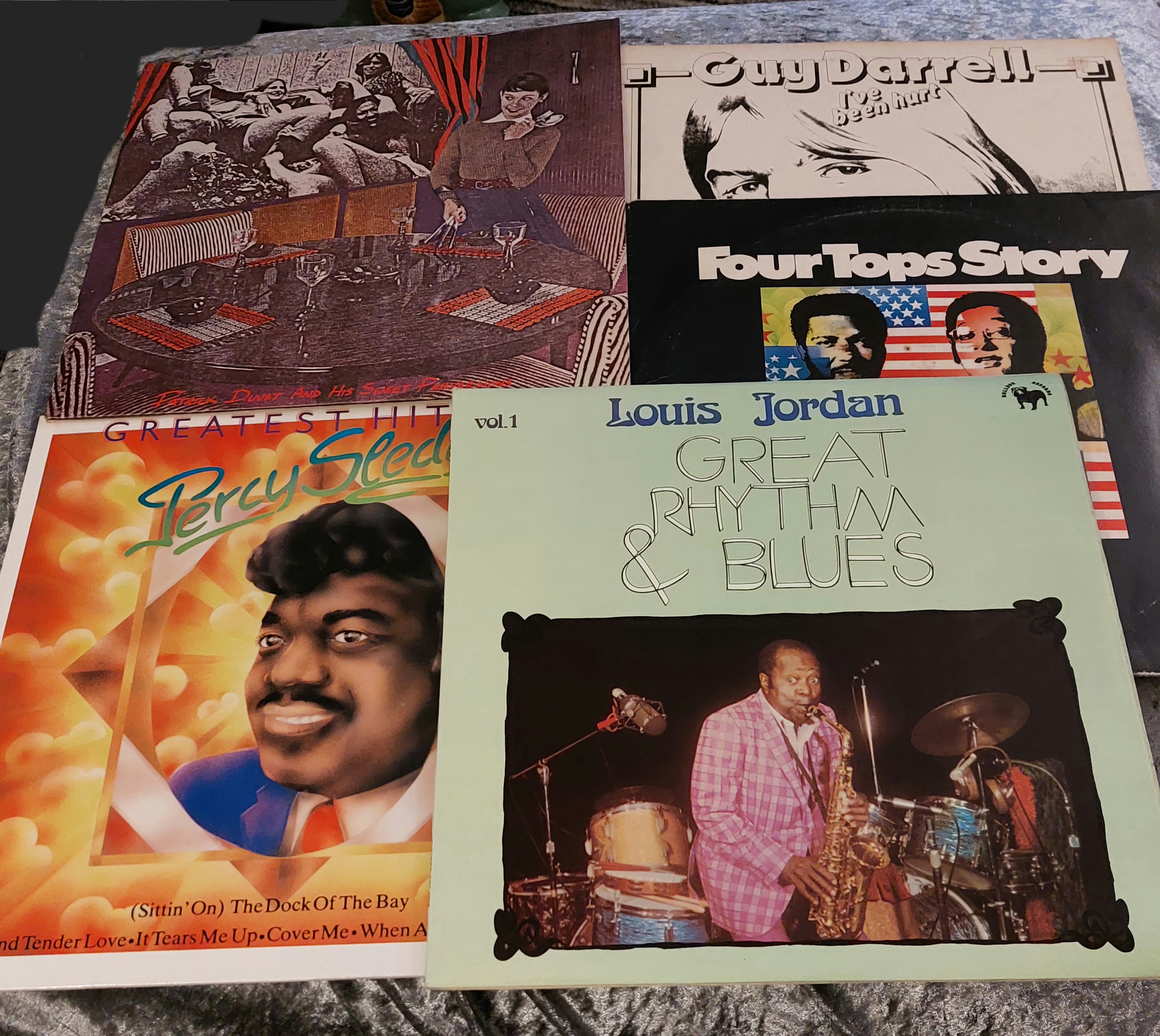 This lot comprises six vinyl records: five LPs and one 45 RPM single. The LPs include Percy Sledge’s “Greatest Hits Vol. 1”, Louis Jordan’s “Great Rhythm & Blues”, The Four Tops’ “Four Tops Story”, and Guy Darrell’s “I’ve Been Hurt”. An additional unidentified LP is also included. The 45 RPM single is by Patrick Duvet and titled “Sex and Drugs and Rock and Roll”. The records feature original labels with artist, title, track listings, and record company details. The condition of the records varies from fair to good, exhibiting signs of use consistent with age, including surface scratches on the vinyl and wear on the covers.