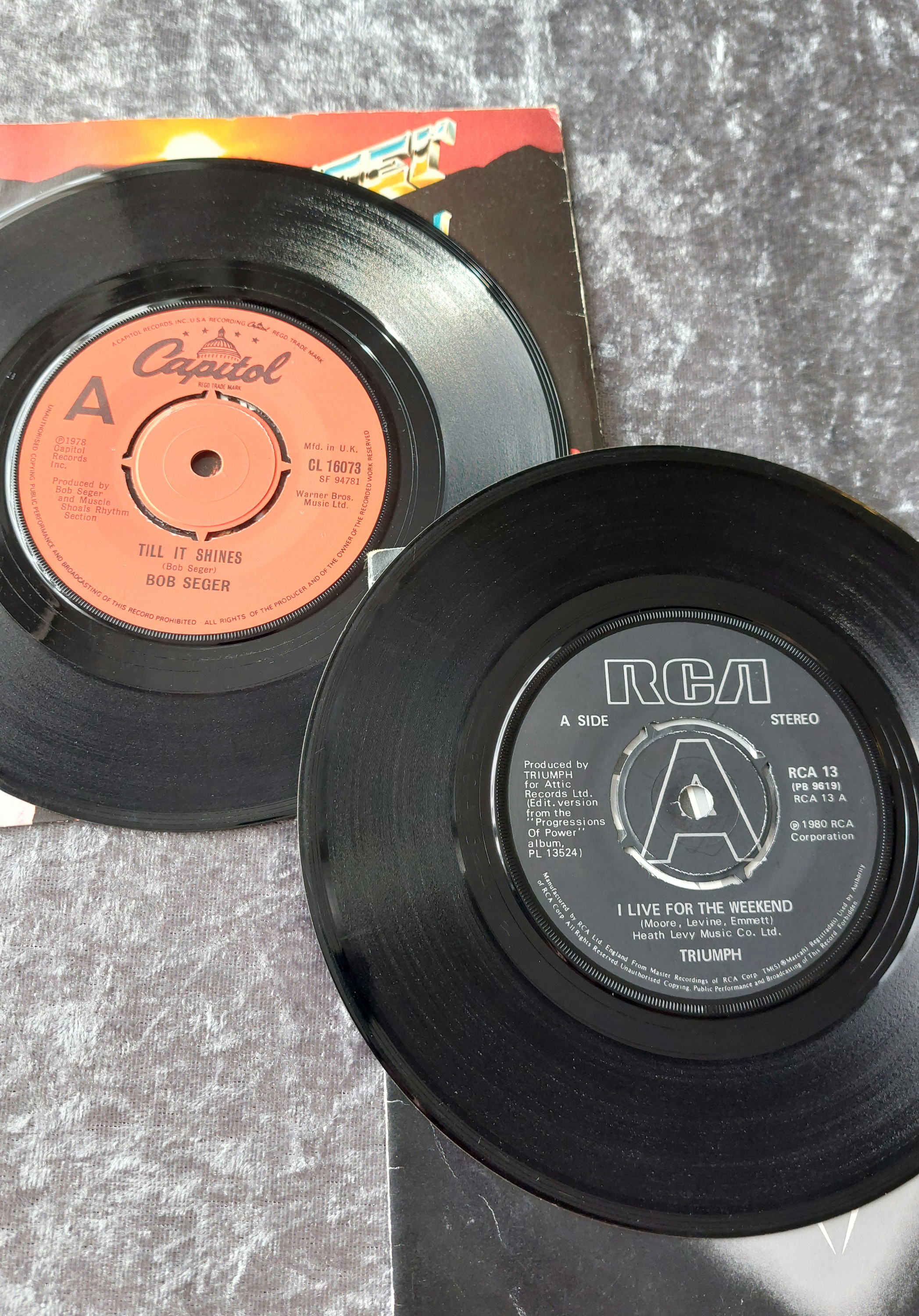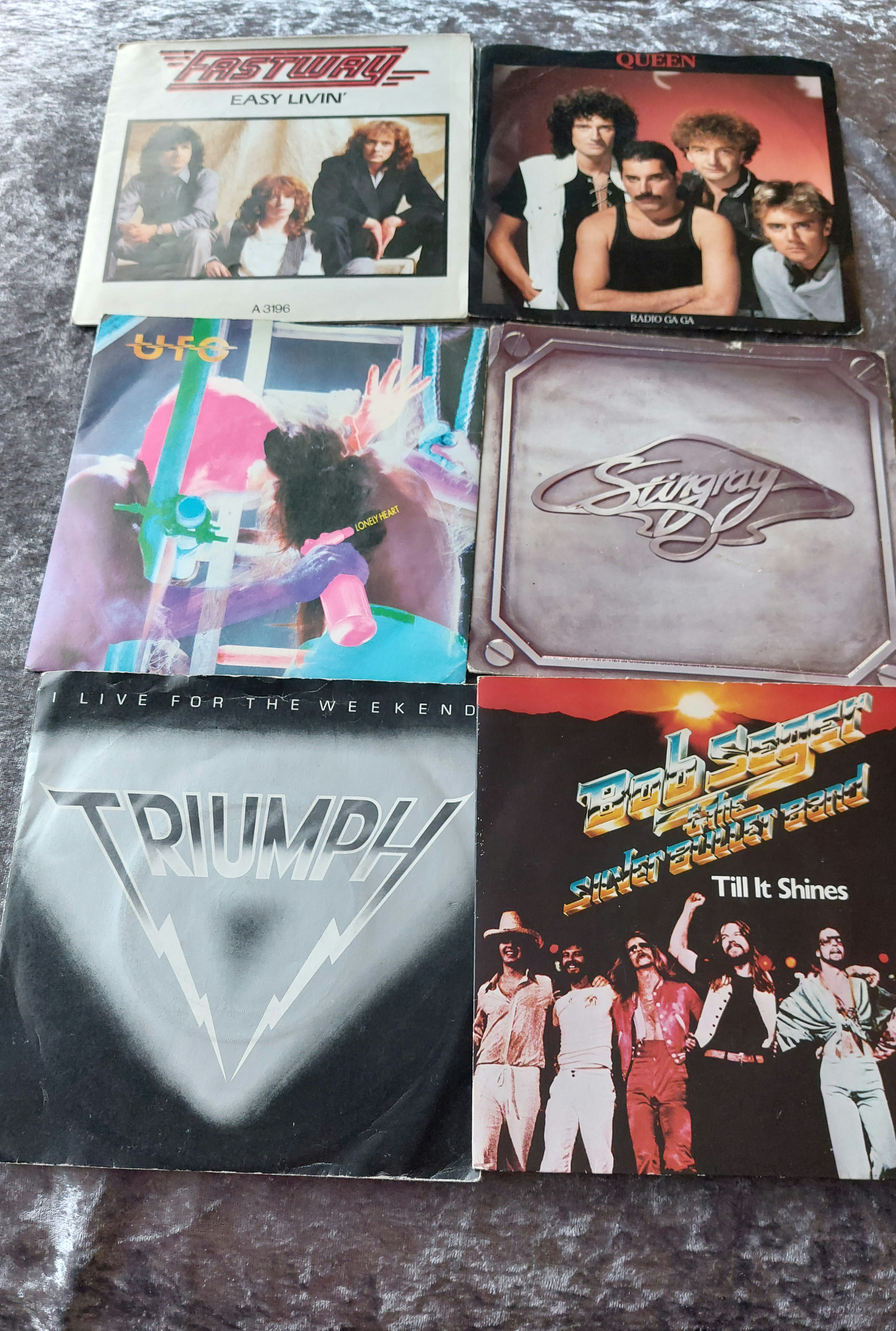 This lot comprises five 7-inch vinyl singles, each presented in its original picture sleeve. The singles include: Fastway “Easy Livin'”, Queen “Radio Ga Ga”, UFO “Lonely Heart”, Sting “Better the Devil You Know”, Bob Seger “Till It Shines”, and Triumph “I Live for the Weekend”. The picture sleeves display artwork characteristic of 1980s rock music. Each record label provides artist and song title information, along with recording details such as matrix numbers, producer, and record company. The sleeves and records show wear commensurate with age.