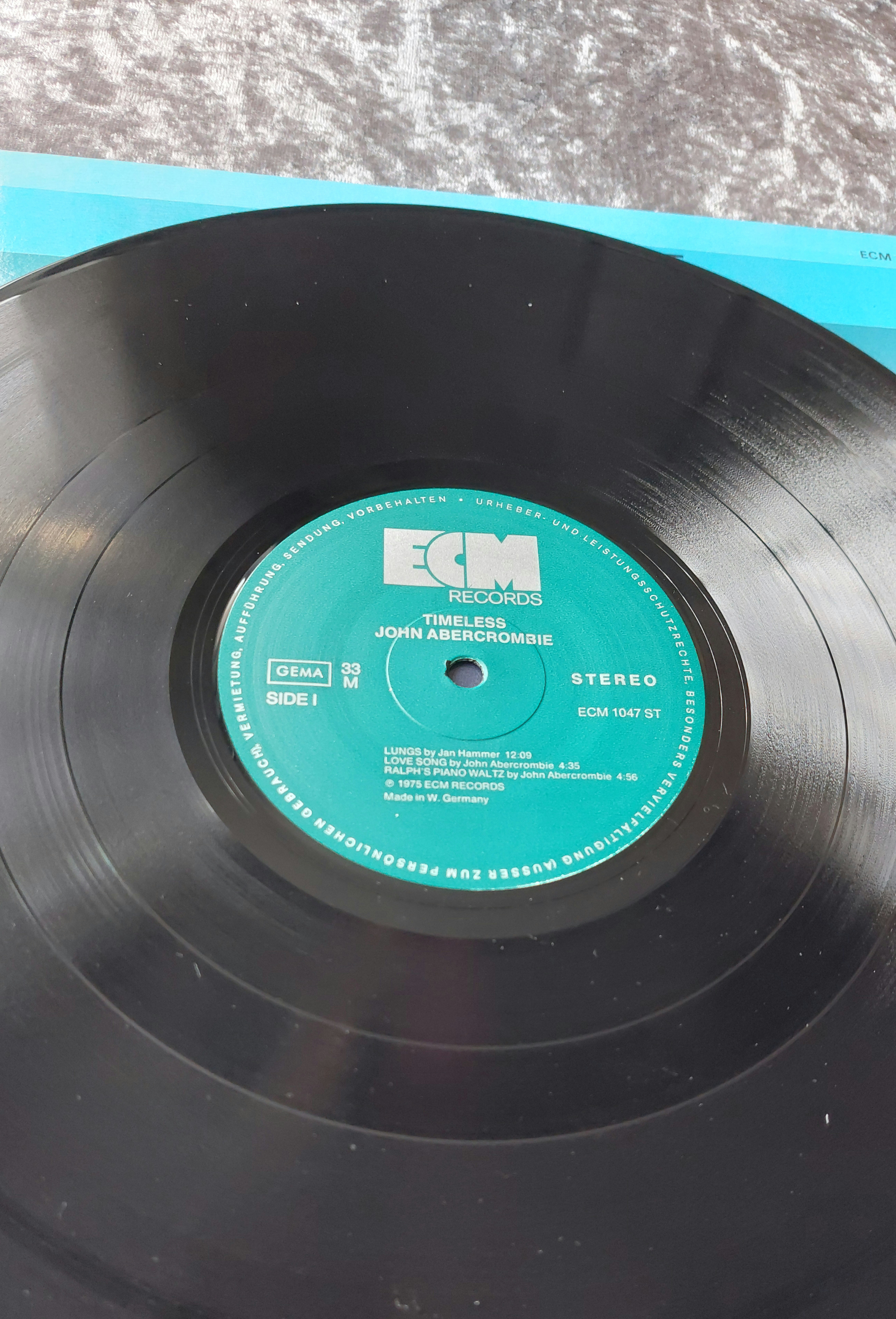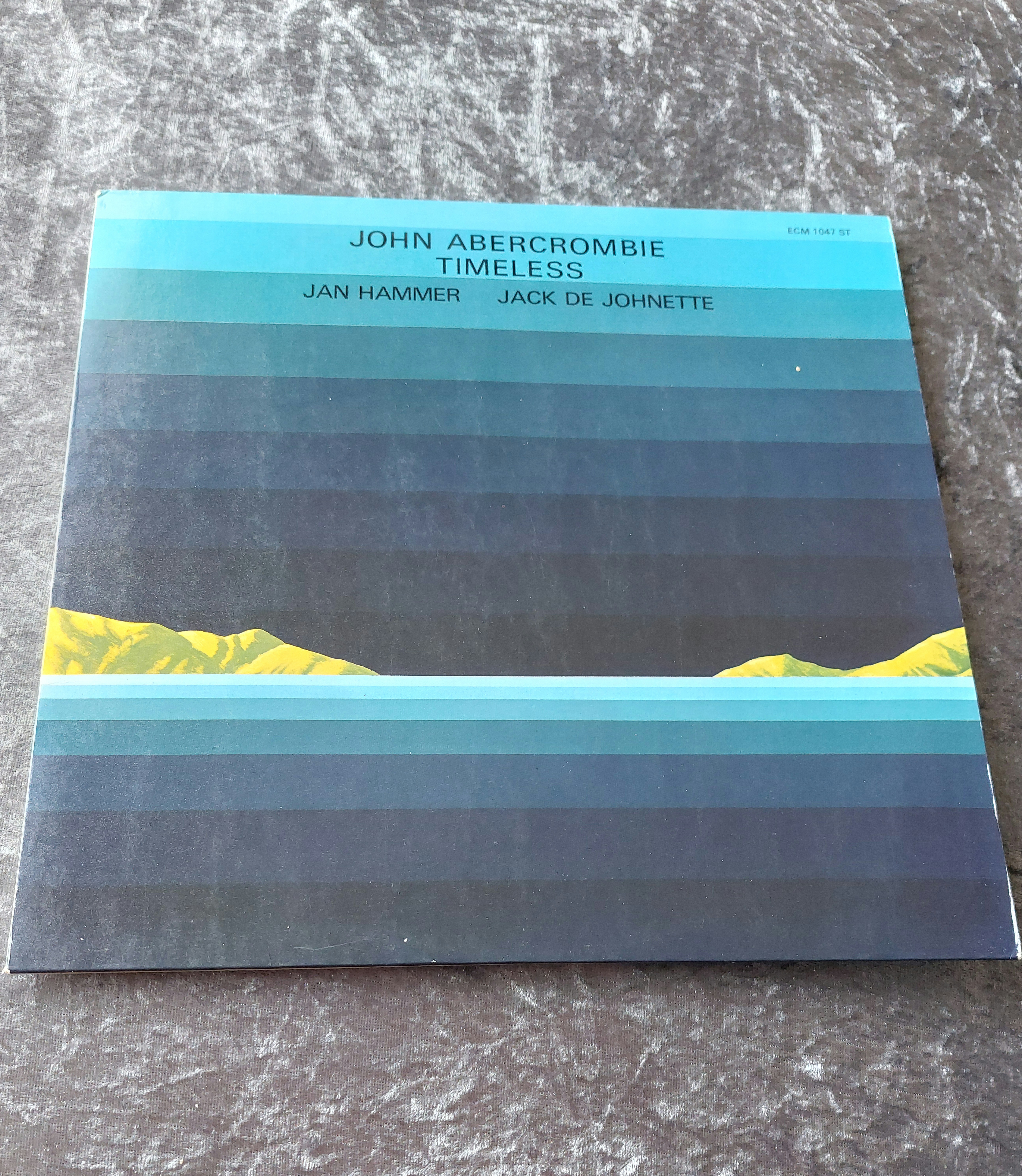 Vinyl LP record album titled “Timeless” by John Abercrombie, featuring Jan Hammer and Jack DeJohnette. Issued on ECM Records (ECM 1047 ST). Gatefold cover with an abstract landscape design in shades of blue and yellow. The vinyl includes printed track information and copyright details indicating a 1975 recording date and 1978 release by ECM Records in Germany.