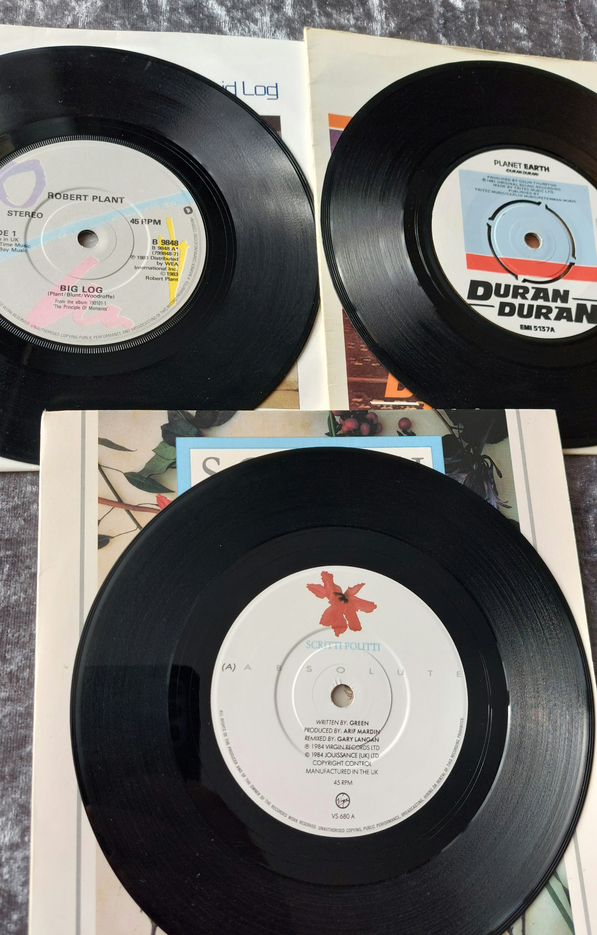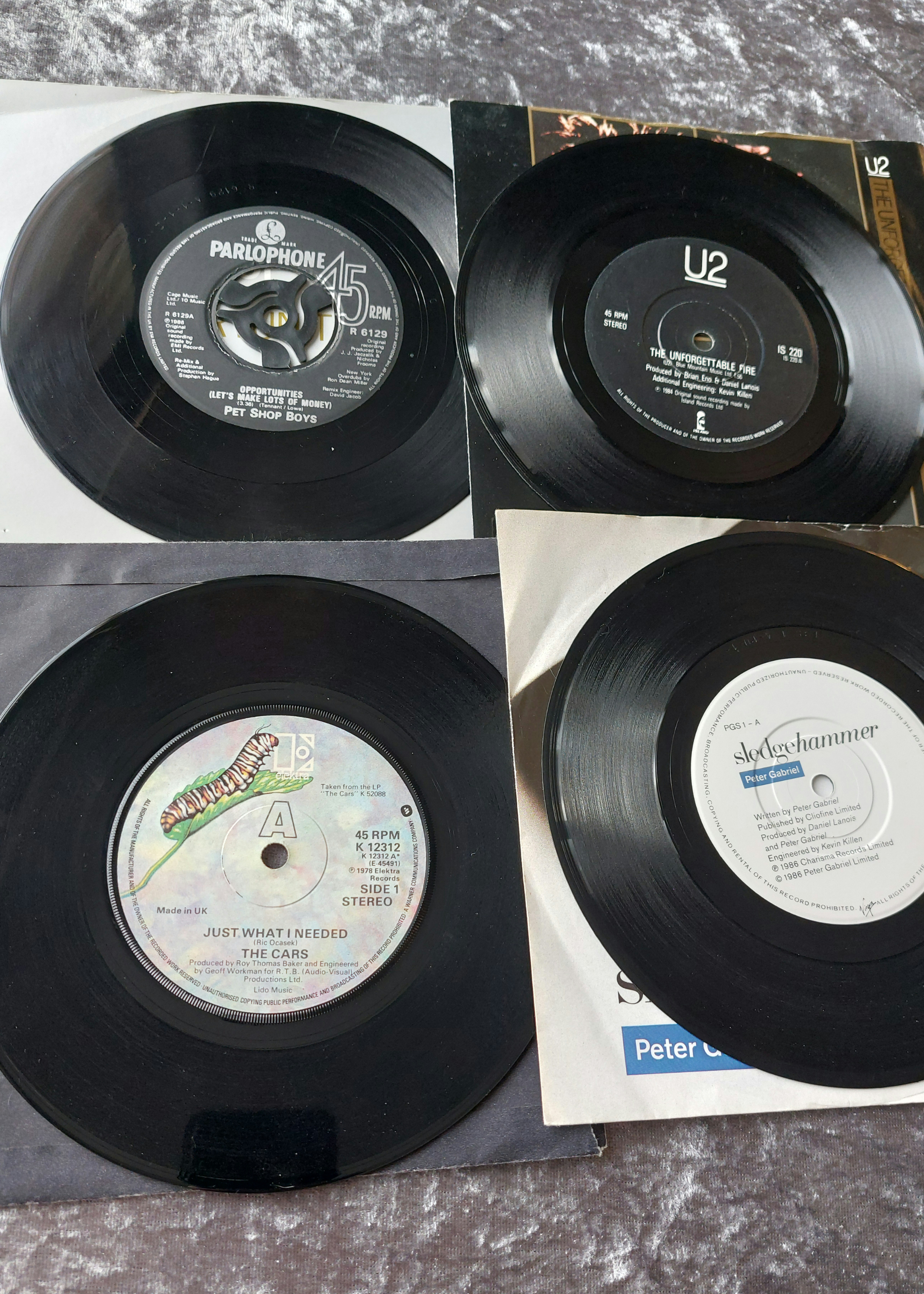 This lot comprises eight 7-inch vinyl singles with their accompanying picture sleeves. Artists represented include Duran Duran (“Planet Earth”), Robert Plant (“Big Log”), Pet Shop Boys (“Opportunities”), U2 (“The Unforgettable Fire”), Peter Gabriel (“Sledgehammer”), Scritti Politti (“Absolute”), and The Cars (“Just What I Needed”). The singles by the first six listed artists appear to date from the 1980s, based on label and artwork style. The Cars single appears to be from the 1970s. The vinyl records are black. The picture sleeves exhibit varying degrees of wear consistent with age and handling.