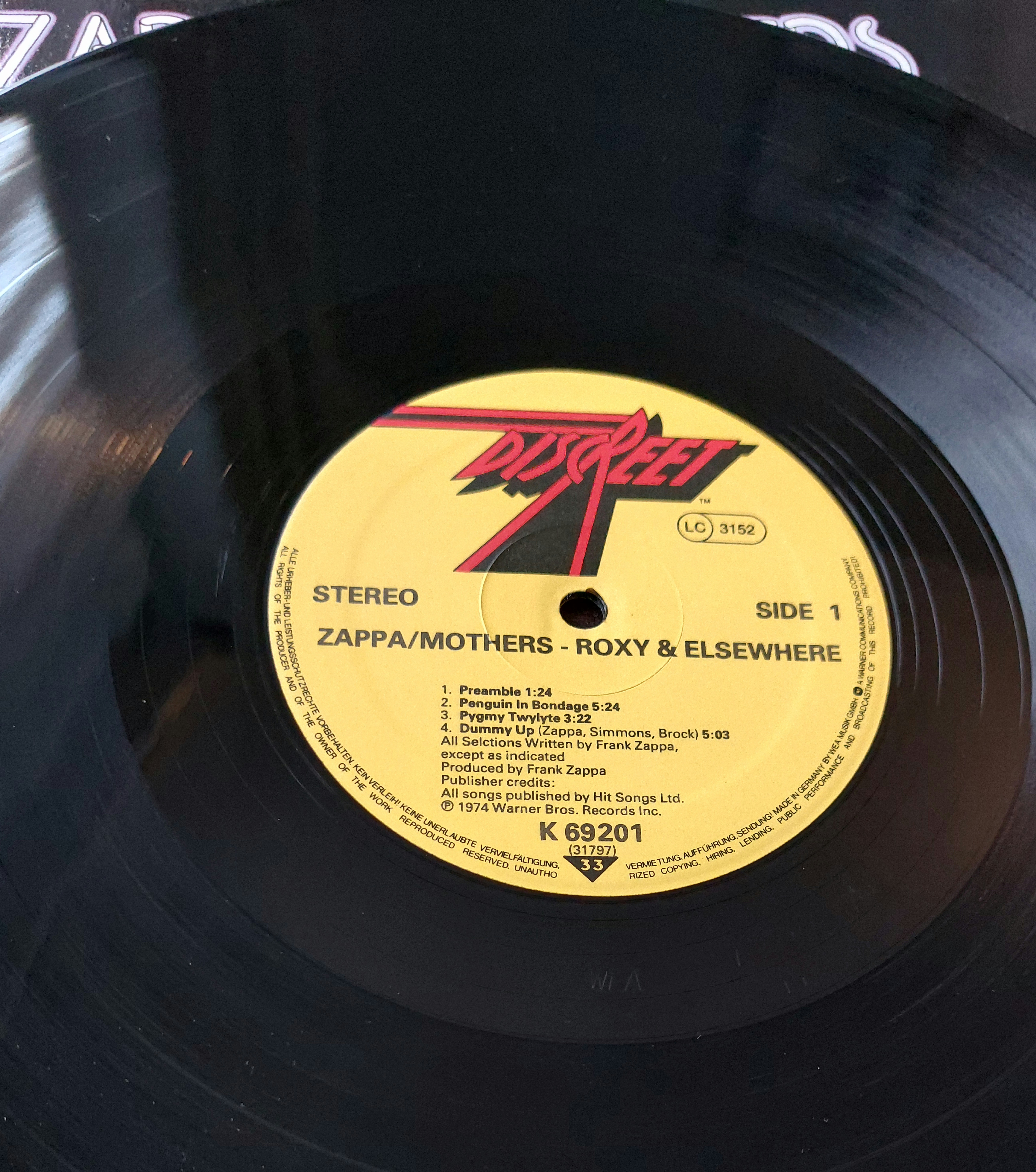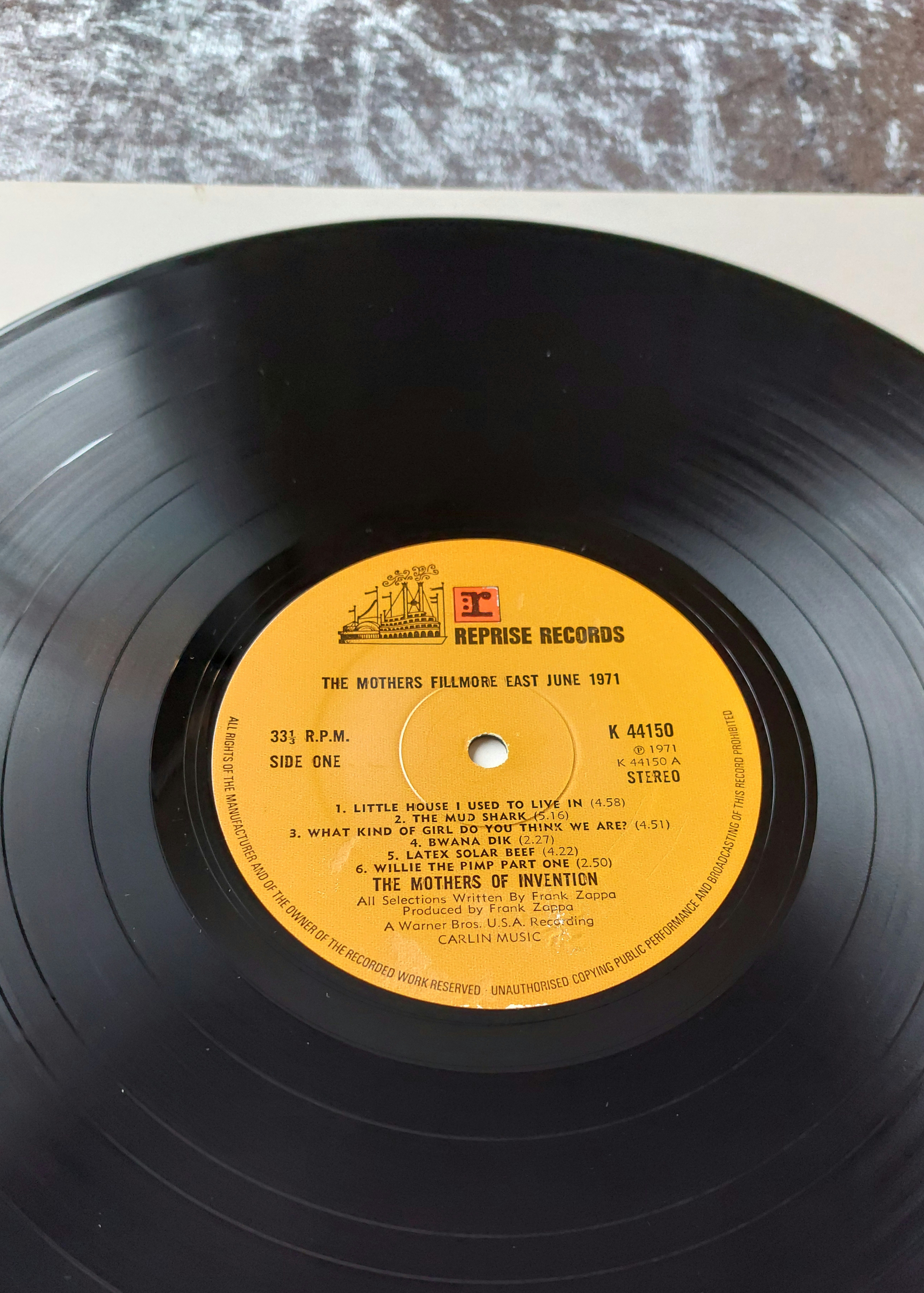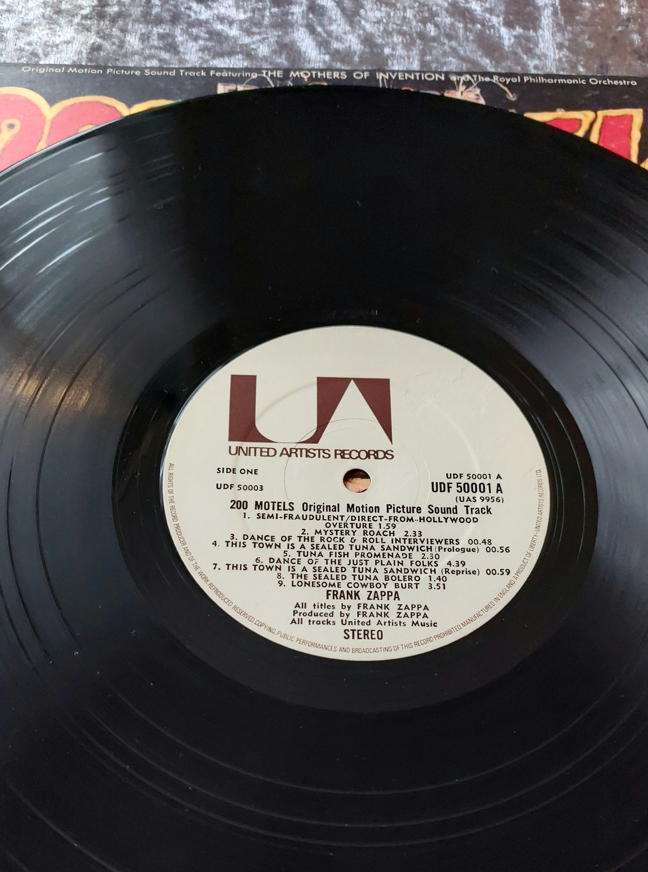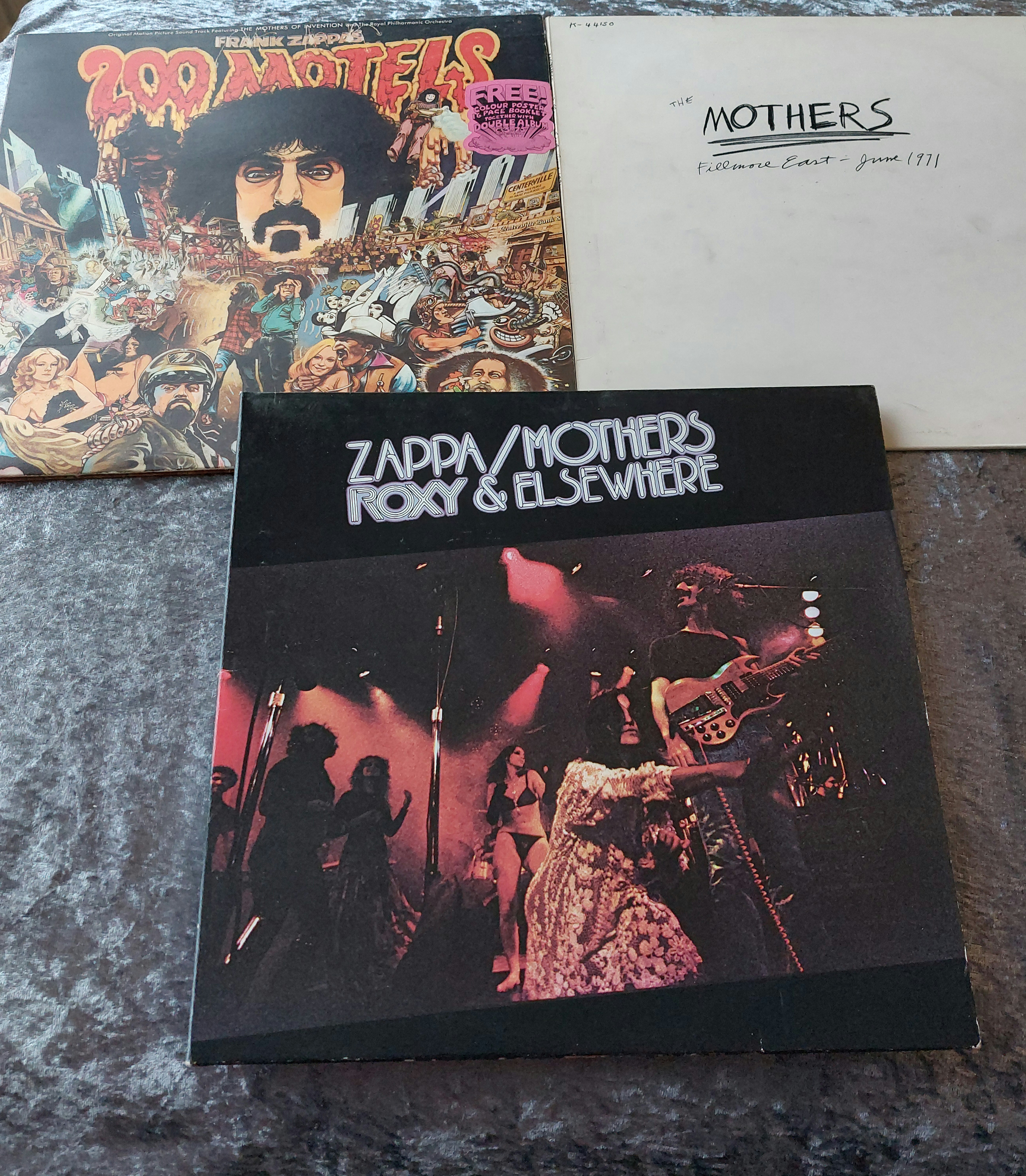 Three vinyl records, including Frank Zappa and The Mothers of Invention *200 Motels* original motion picture soundtrack on United Artists Records; The Mothers *Fillmore East – June ’71* on Reprise Records; and Zappa/Mothers *Roxy & Elsewhere* on Warner Bros. Records. All appear to date from the 1970s and are housed in their original sleeves.