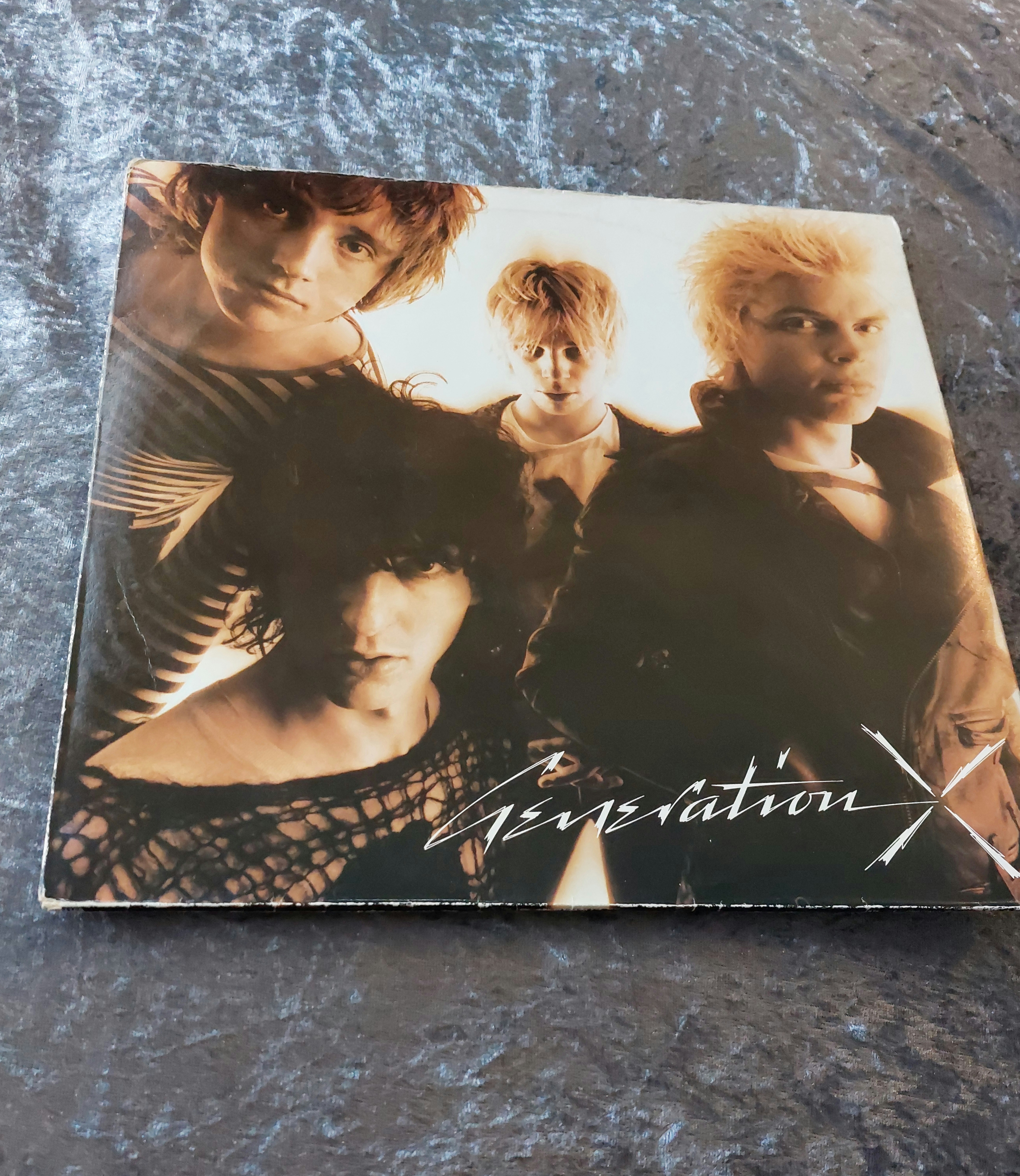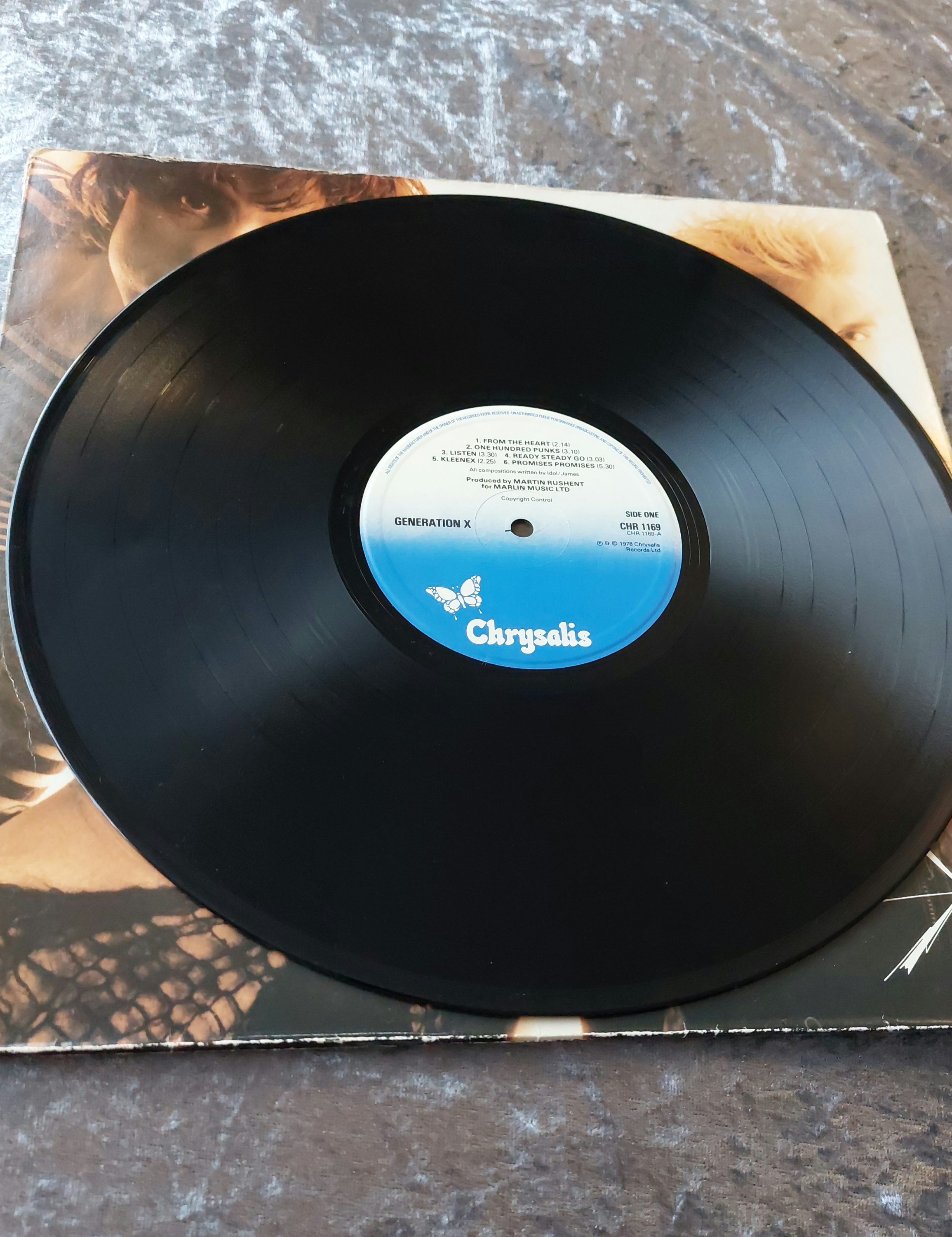 A vinyl long-playing (LP) record album identified as “Generation X” by the band of the same name. The album features a photographic image of the band on the cover and is housed in a paper sleeve. The vinyl disc bears the Chrysalis Records label with the catalog number CHL 1189.