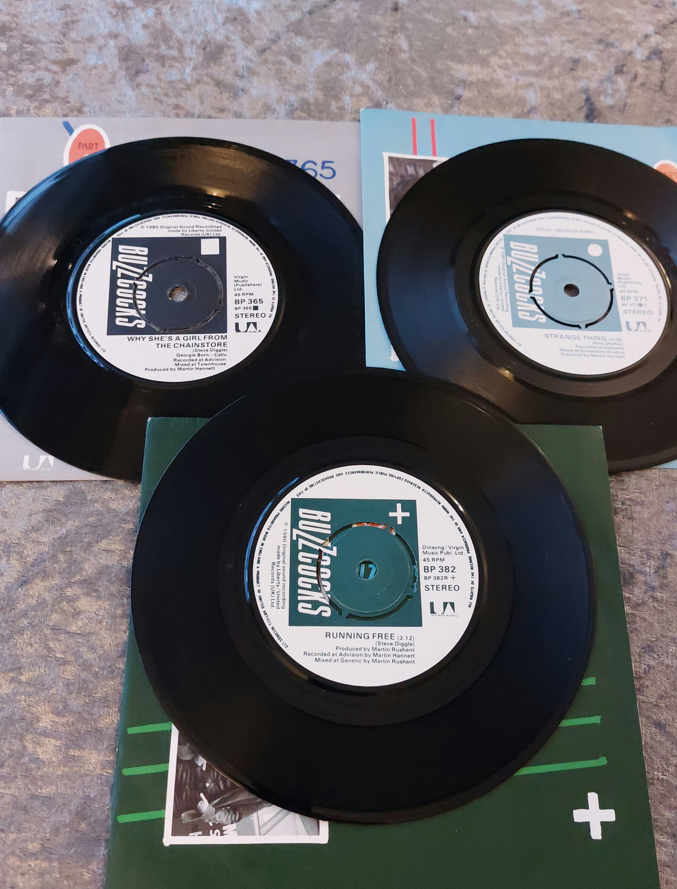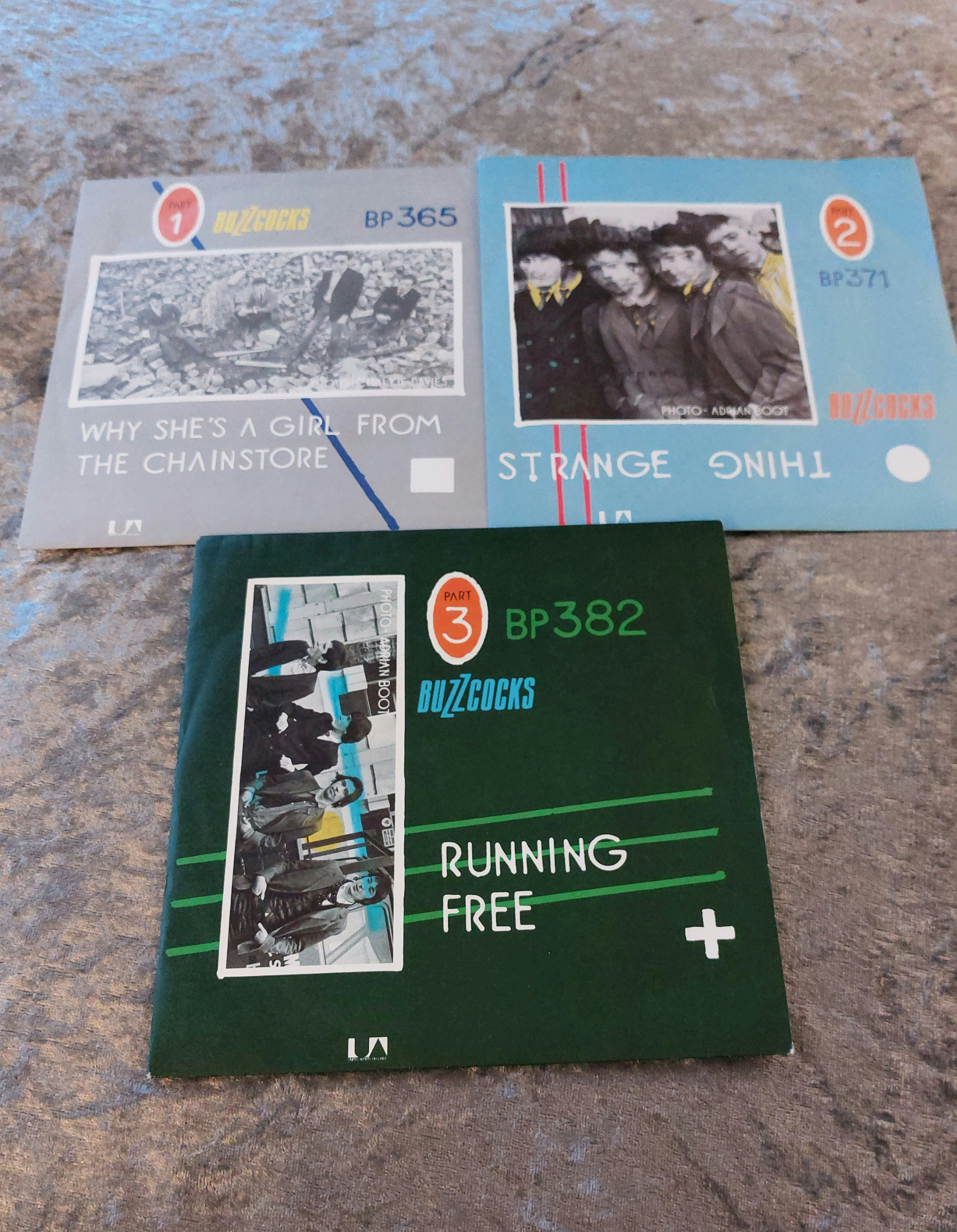 Three 7-inch vinyl singles by the Buzzcocks, including “Why She’s A Girl From The Chainstore” (BP 365), “Strange Thing” (BP 371), and “Running Free” (BP 382). Each single includes its original picture sleeve. The sleeves feature photographic images and printed text including the song title, band name, and catalog number. The vinyl records are black.