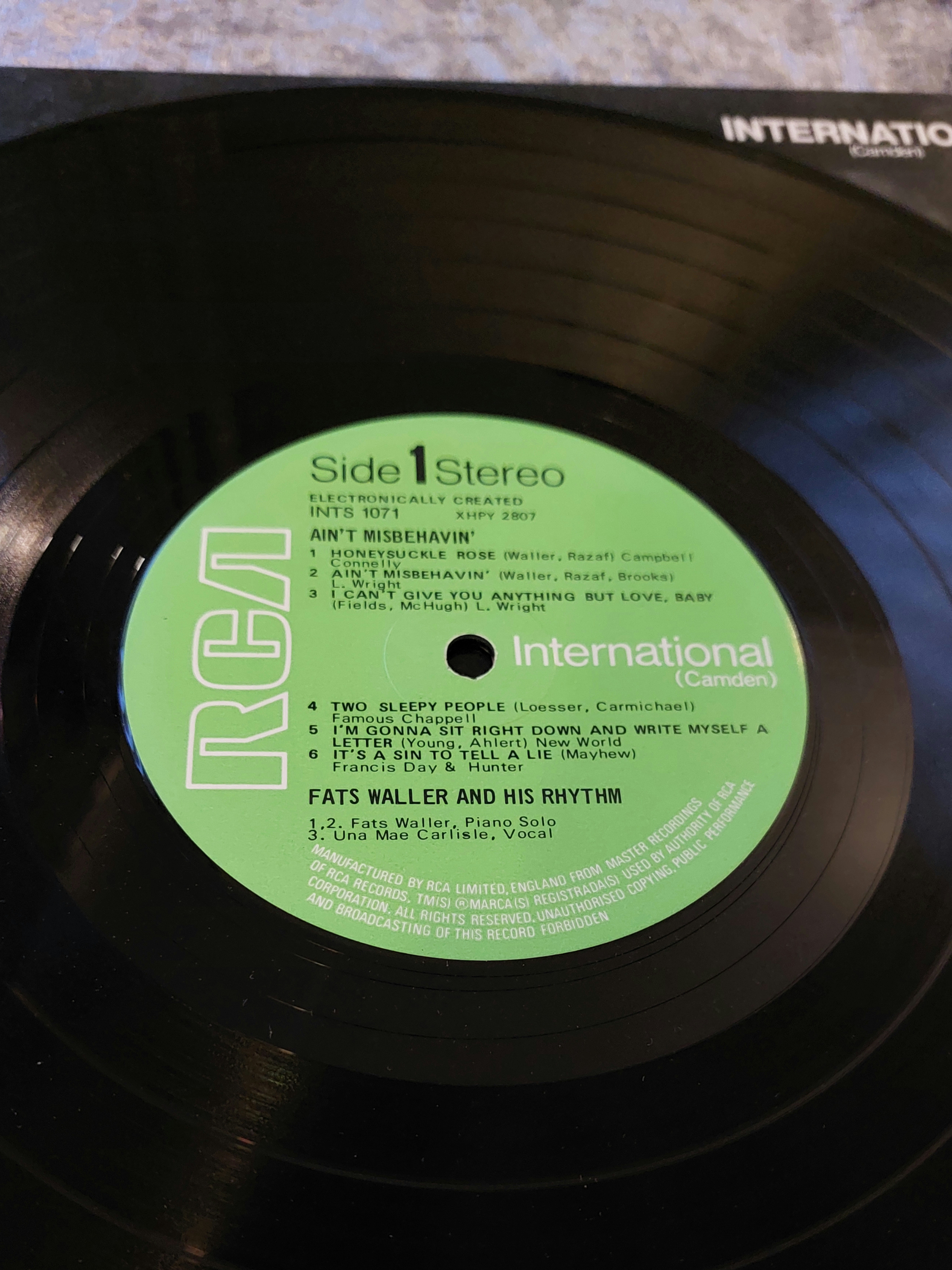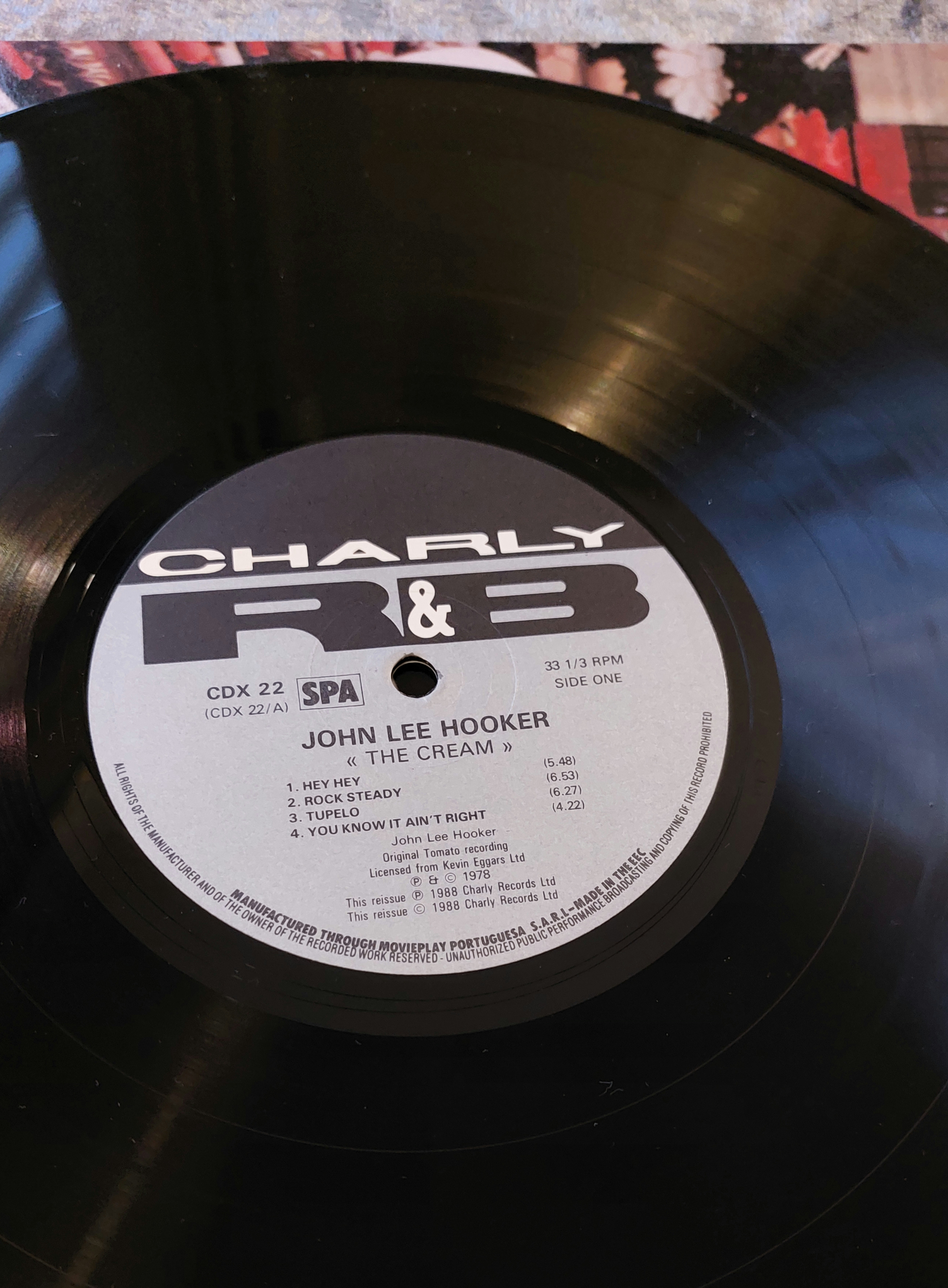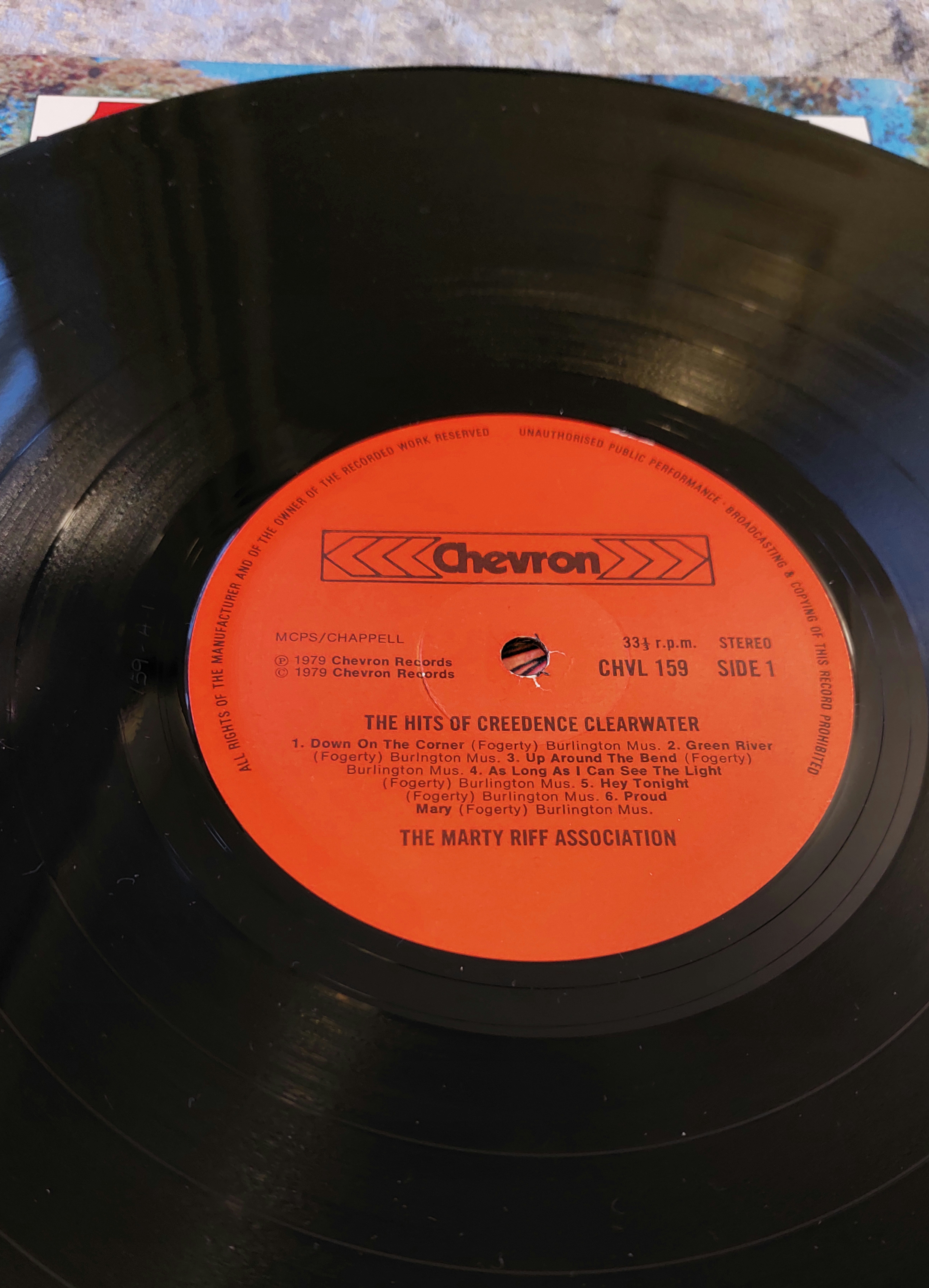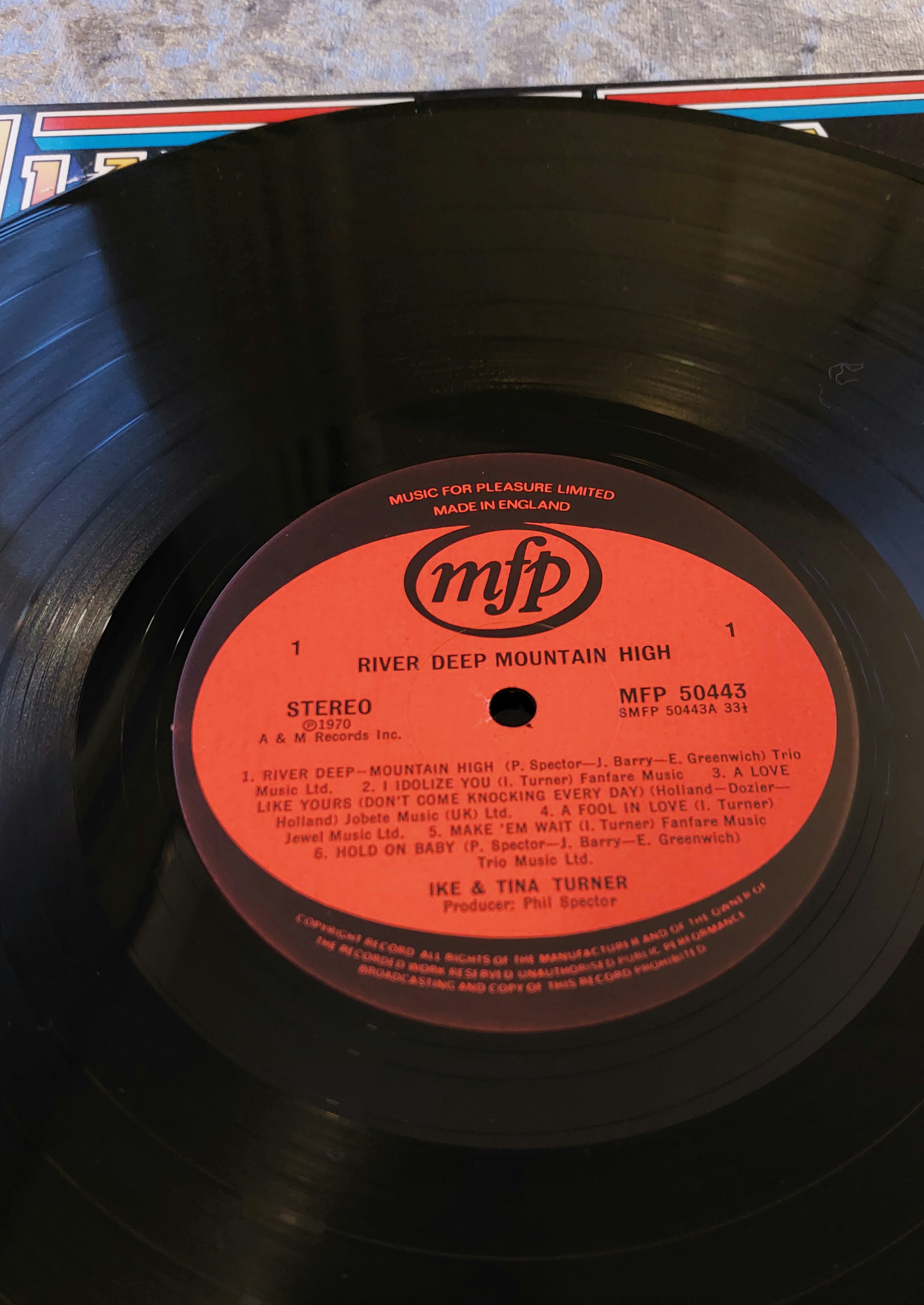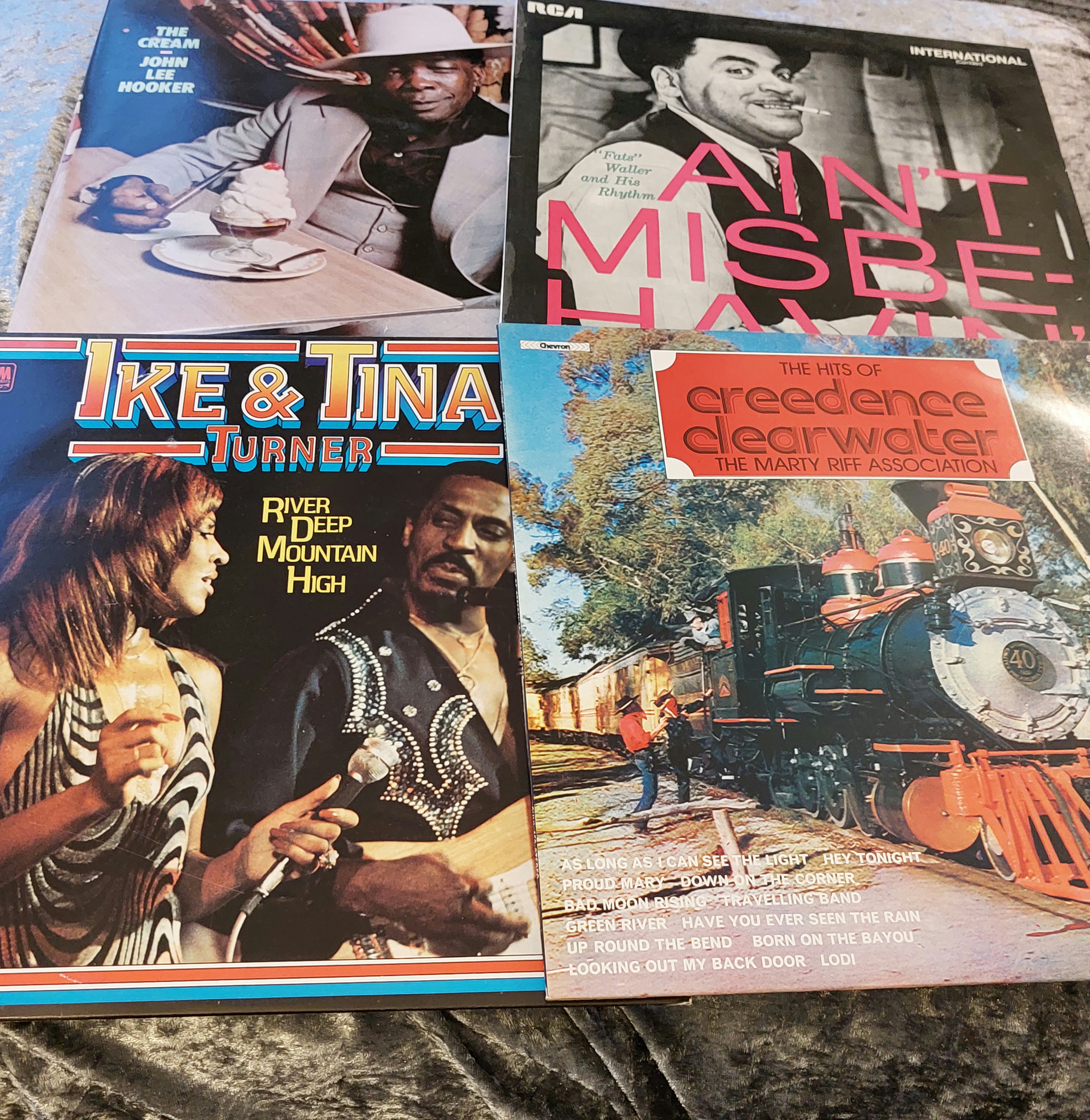 A group of five vintage vinyl long-playing records (LPs) with their original sleeves. Artists represented include Ike & Tina Turner (“River Deep Mountain High,” MFP 50443), The Marty Riff Association (“The Hits of Creedence Clearwater Revival,” Chevron CHVL 159), Fats Waller and His Rhythm (“Ain’t Misbehavin’,” RCA Camden INTS 1071), and John Lee Hooker (“The Cream,” Charly R&B CDX 22). The records and sleeves show varying degrees of wear consistent with age and use.