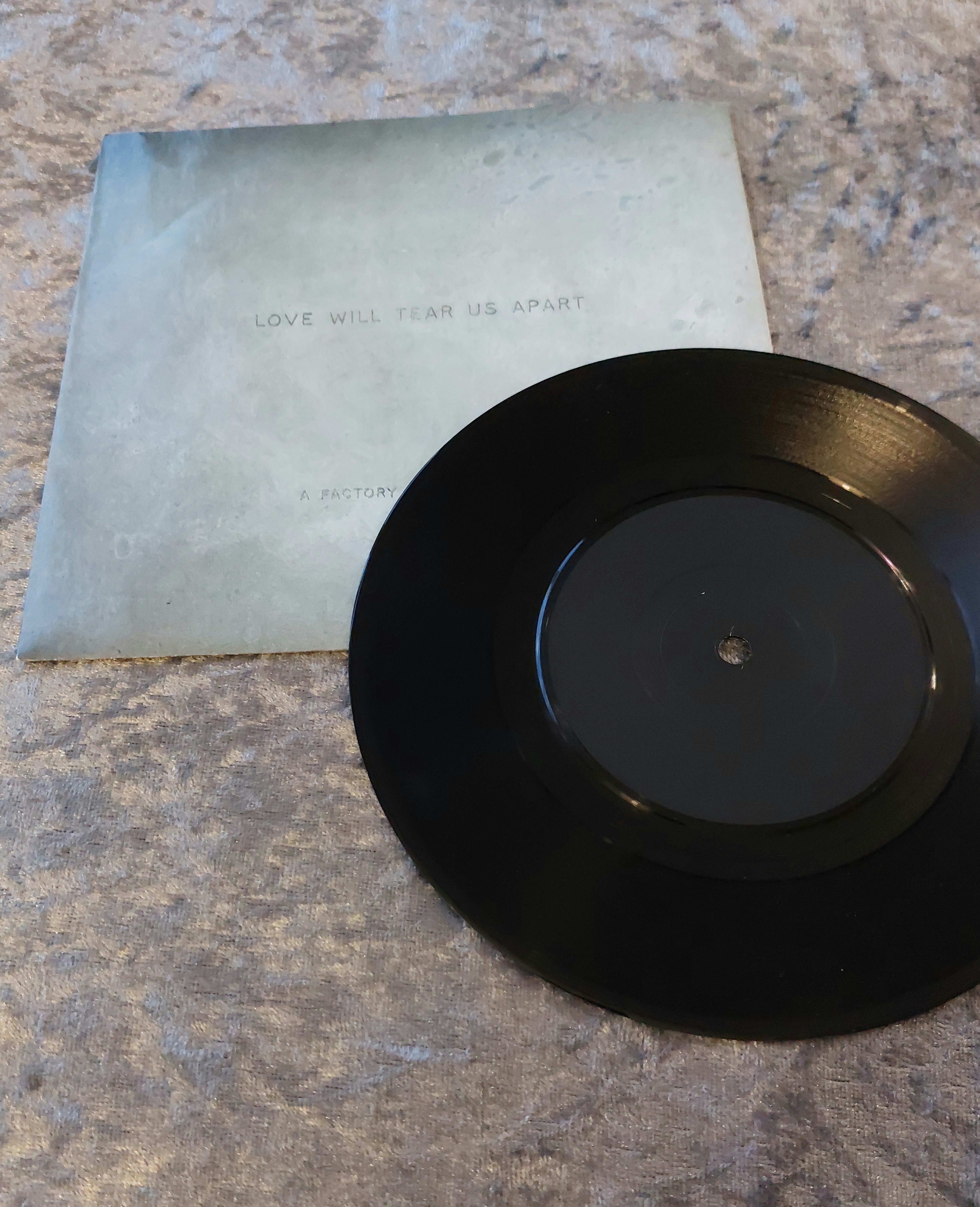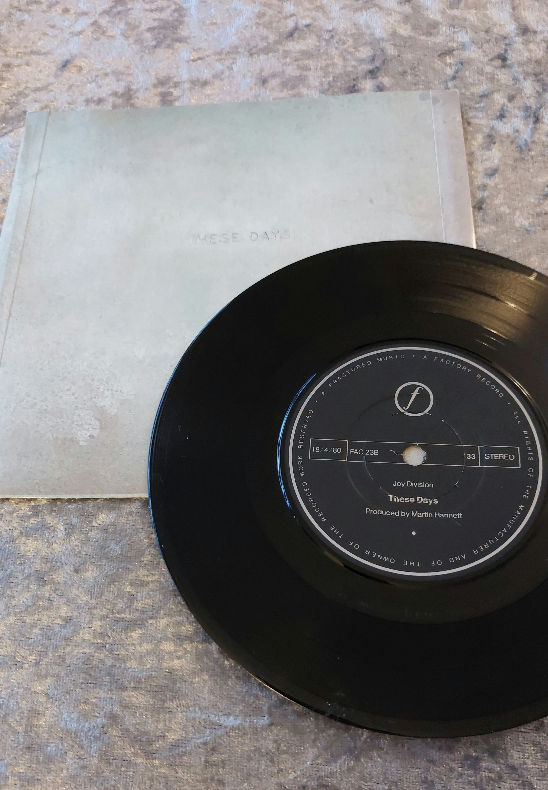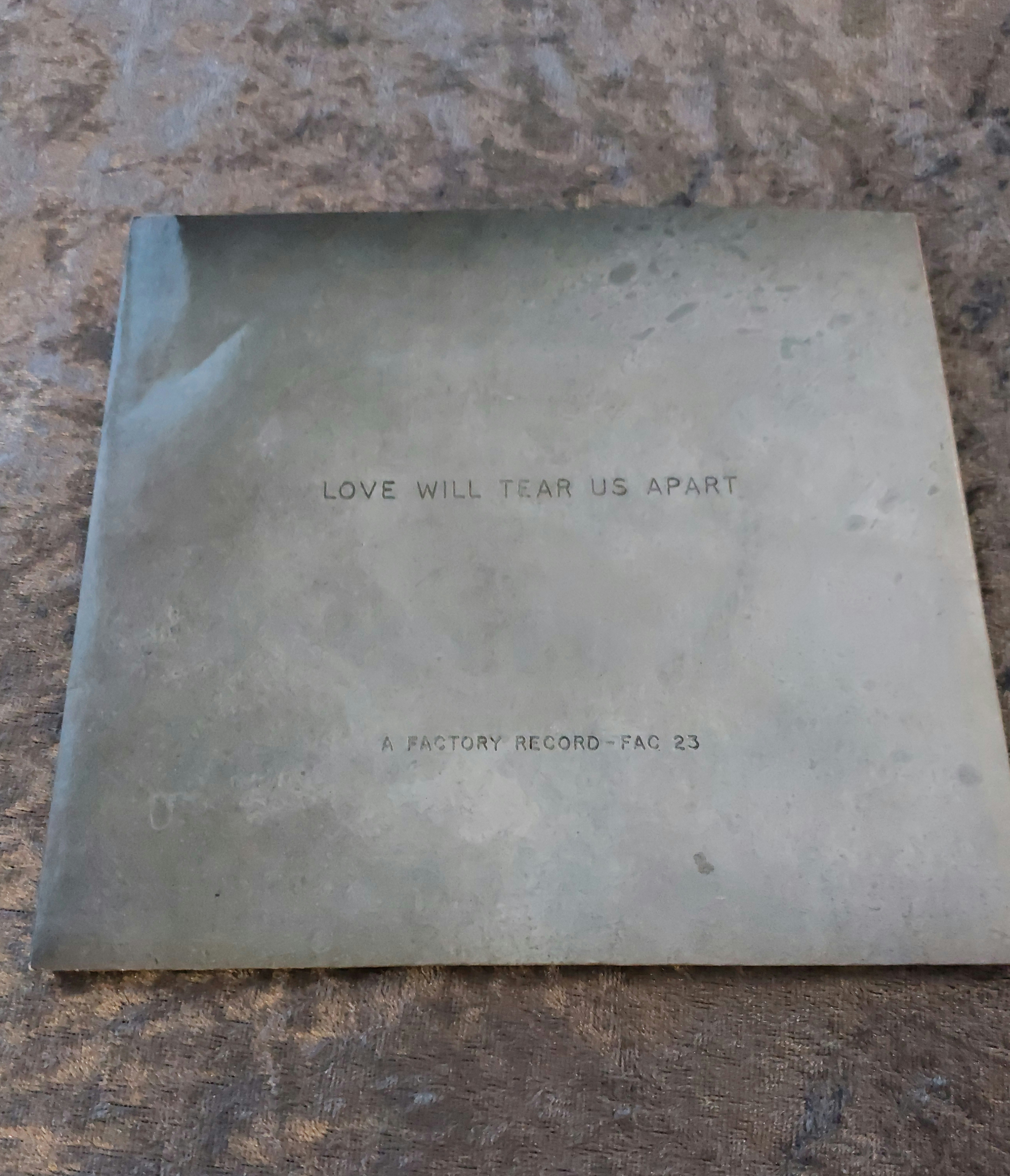 Two 7-inch vinyl records, presumed to be by Joy Division, comprising “Love Will Tear Us Apart” and “These Days,” both bearing the Factory Records catalogue number FAC 23. The records are black vinyl. The sleeve for “Love Will Tear Us Apart” features minimalist printed text on card stock, including the song title and “A FACTORY RECORD – FAC 23”. The sleeve for “These Days” shows partial text, with “THESE DAYS” visible. The “These Days” record itself displays text including “Joy Division,” “These Days,” “FAC 23”, and production credits. Both sleeves exhibit minor surface wear consistent with age and handling.