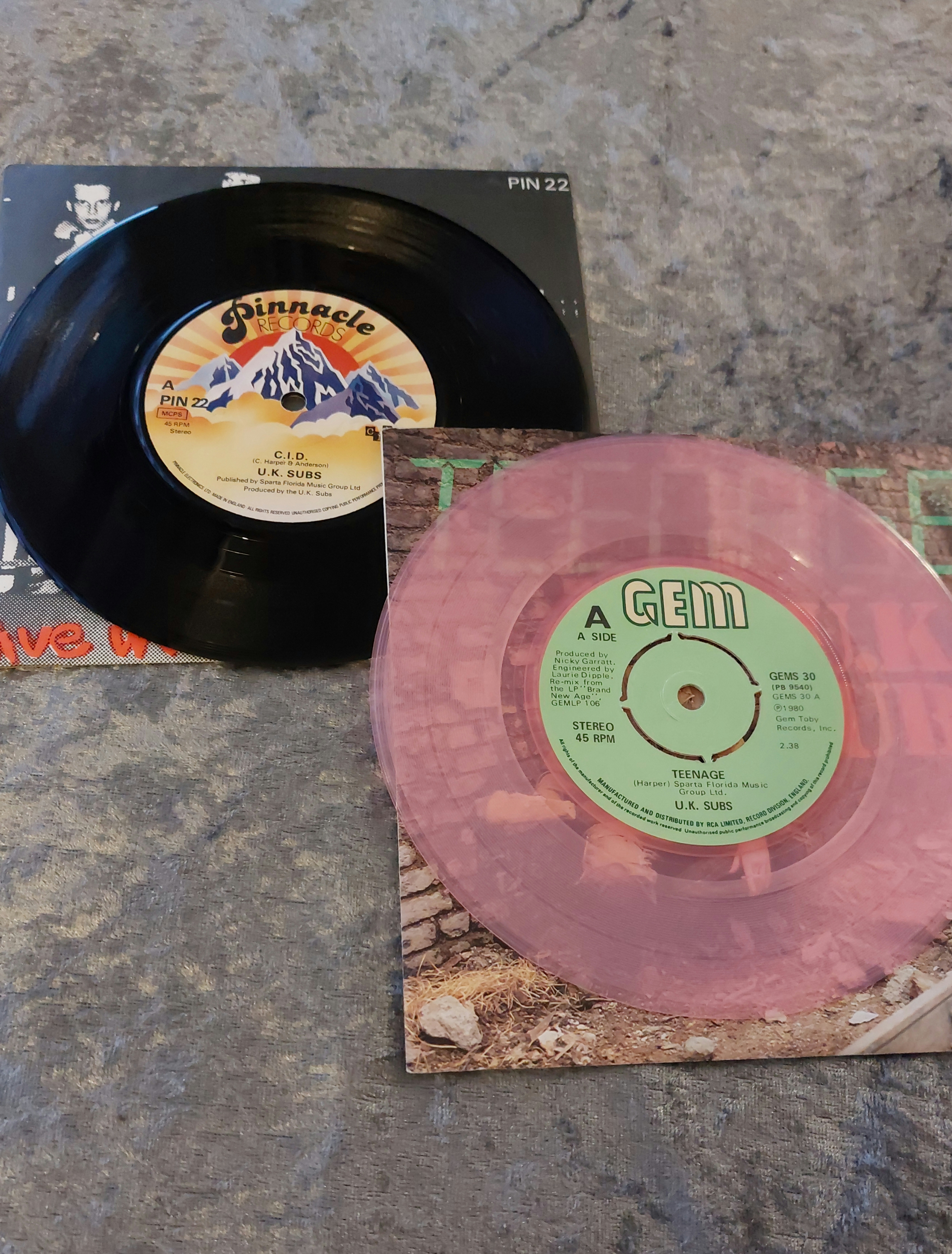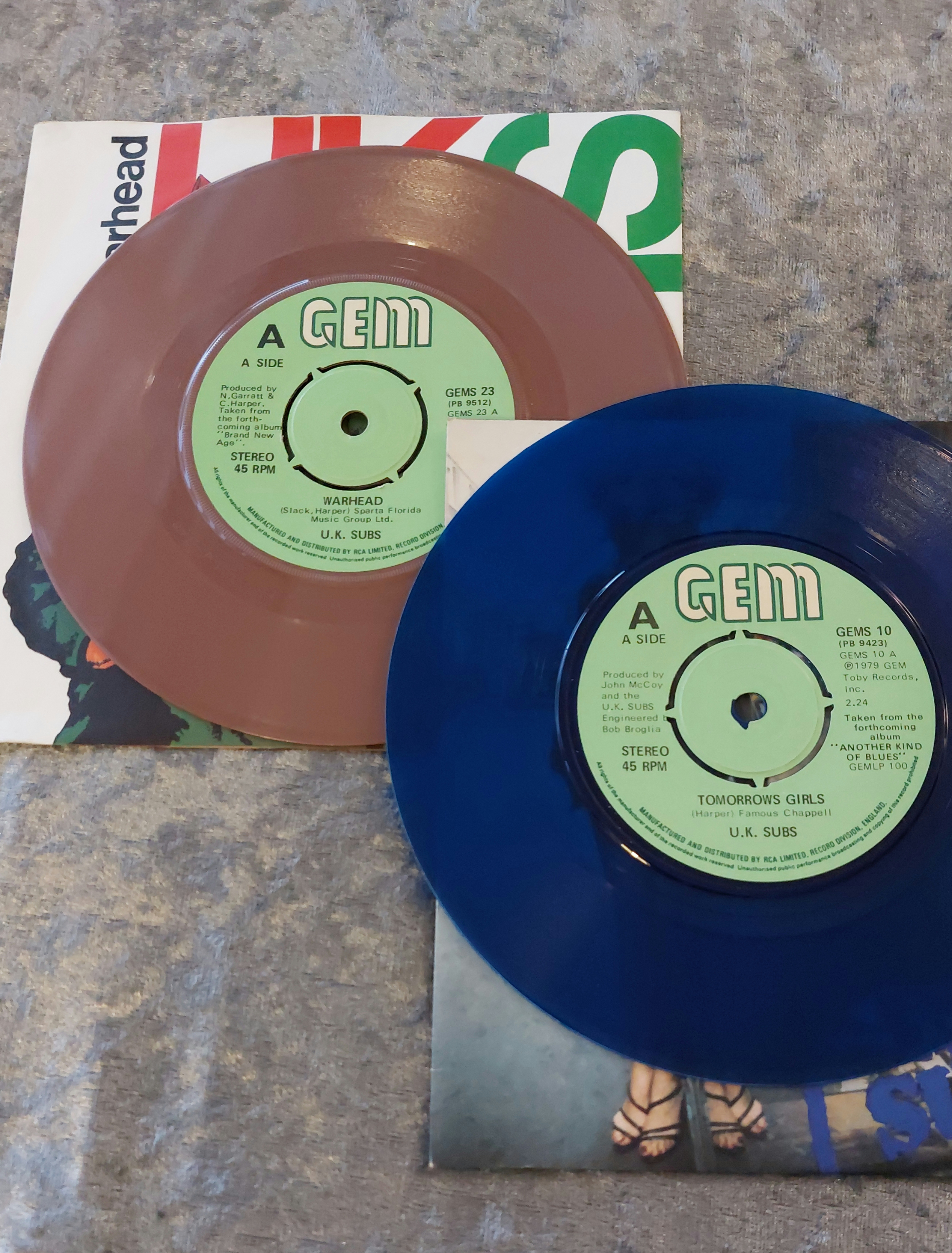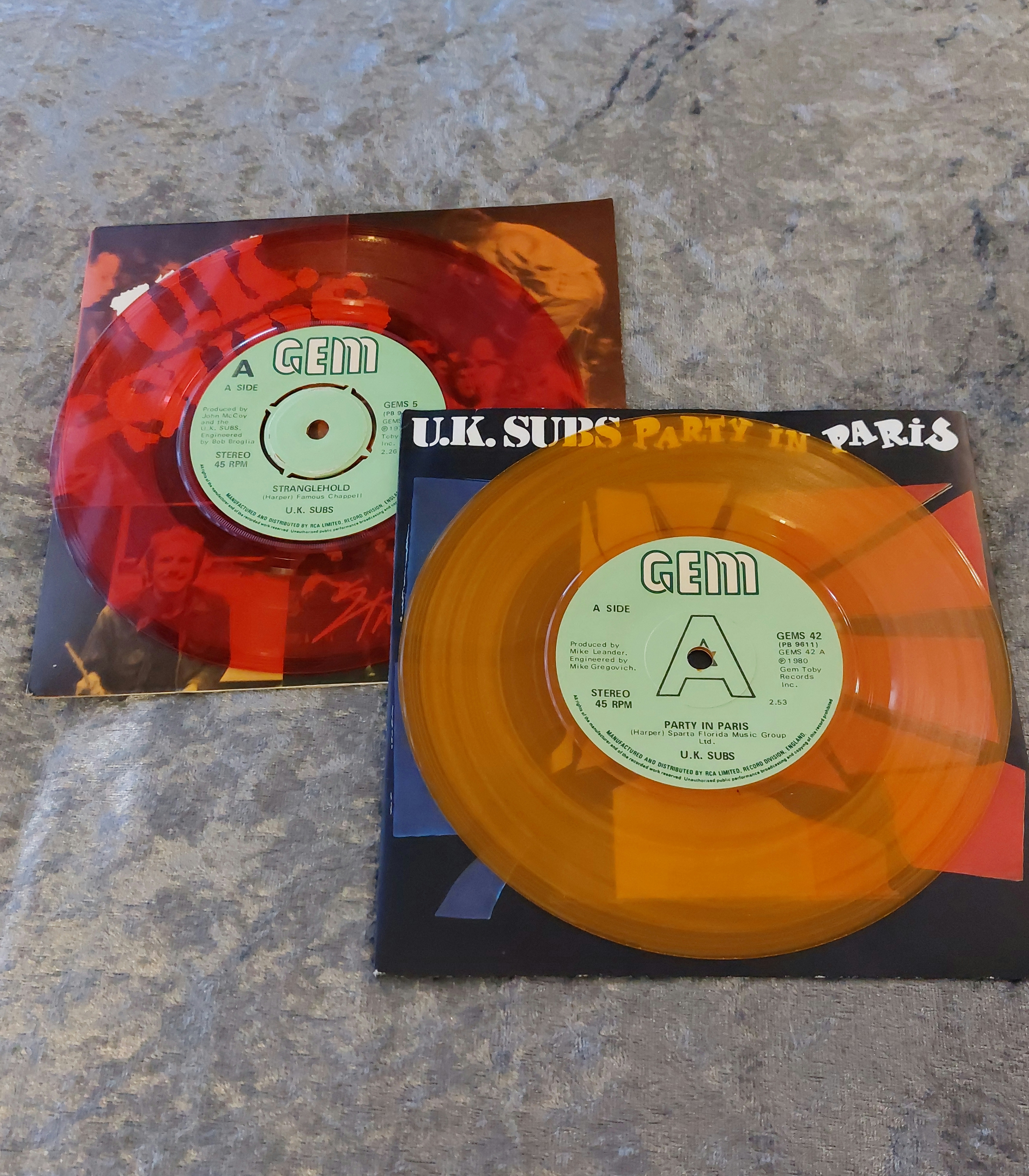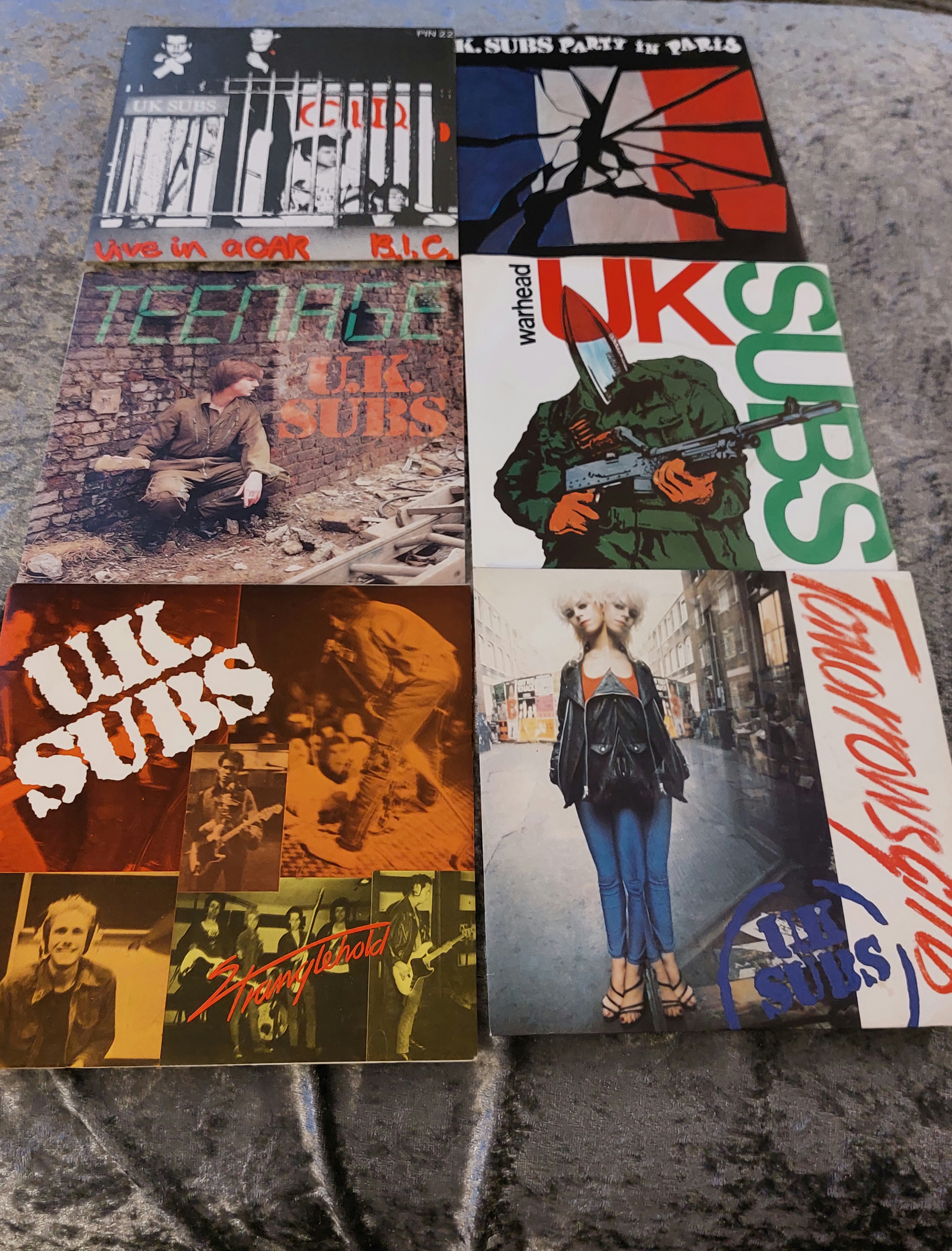 This lot comprises eight 7-inch vinyl singles by the band U.K. Subs. Four singles feature picture sleeves with photographic and graphic artwork, including depictions of a soldier, a woman in a leather jacket, and a fragmented French flag. The remaining four are colored vinyl records (pink, orange, mauve, and dark blue) housed in corresponding paper sleeves. All sleeves display printed text, including song titles and the Gem label. The sleeves and records exhibit some signs of handling and age-related wear.