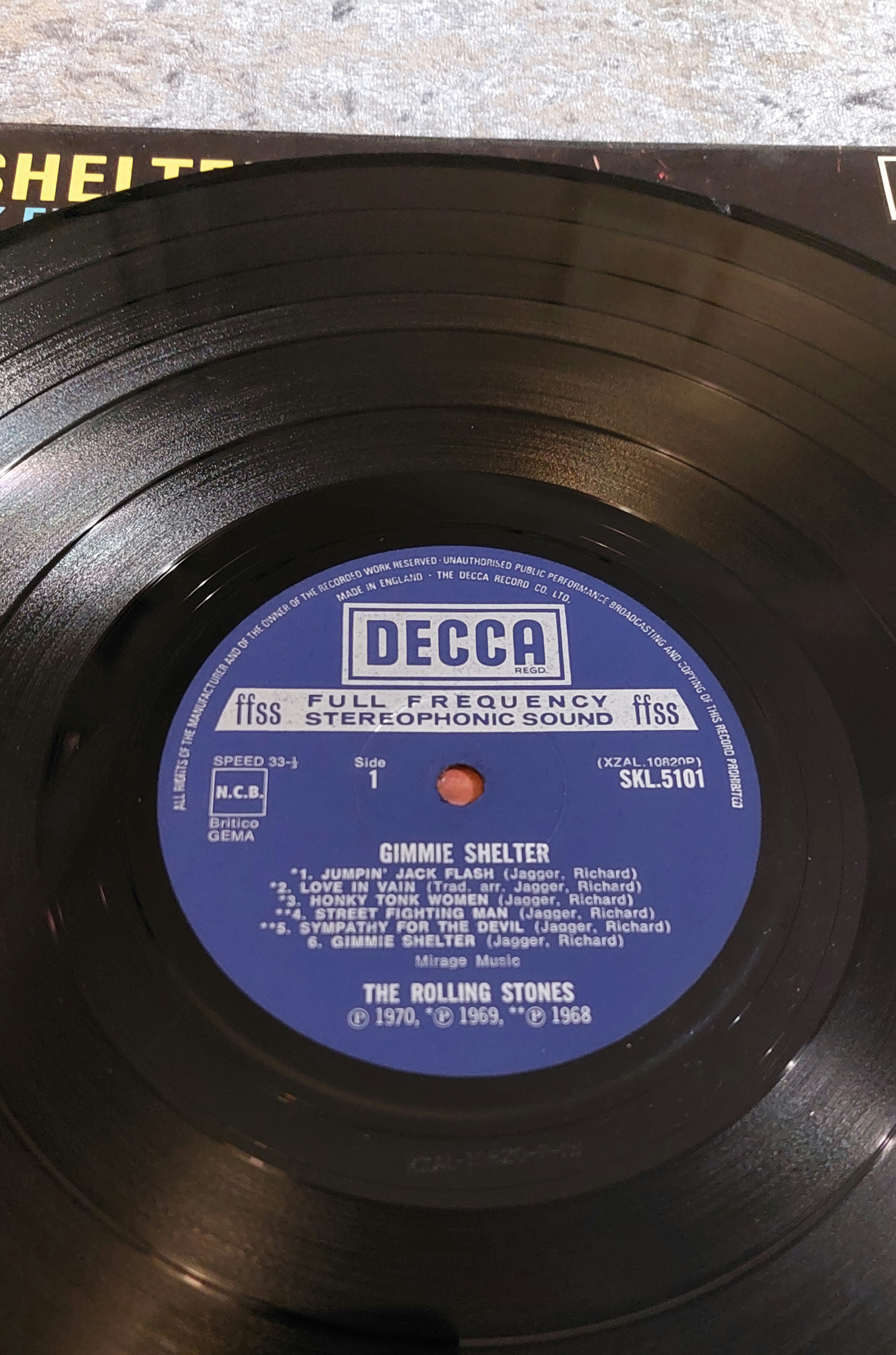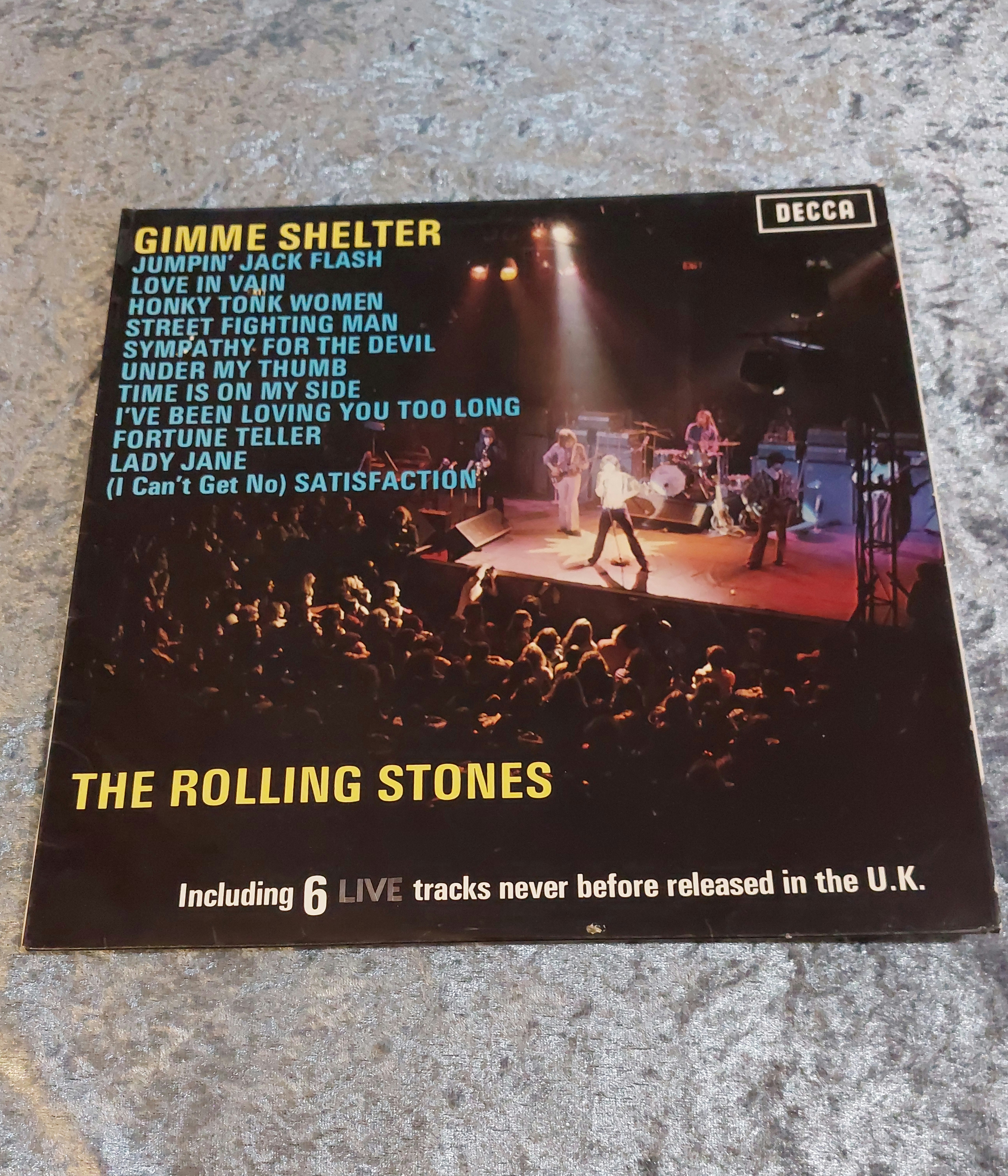 Vinyl LP record album titled “Gimme Shelter” by The Rolling Stones, released on Decca Records. The cover features a live performance photograph of the band and lists the track titles, including six live tracks noted as previously unreleased in the U.K. The vinyl record itself bears the Decca label, track listing, songwriting credits, and matrix numbers SKL 5101 and XTAL 105908.
