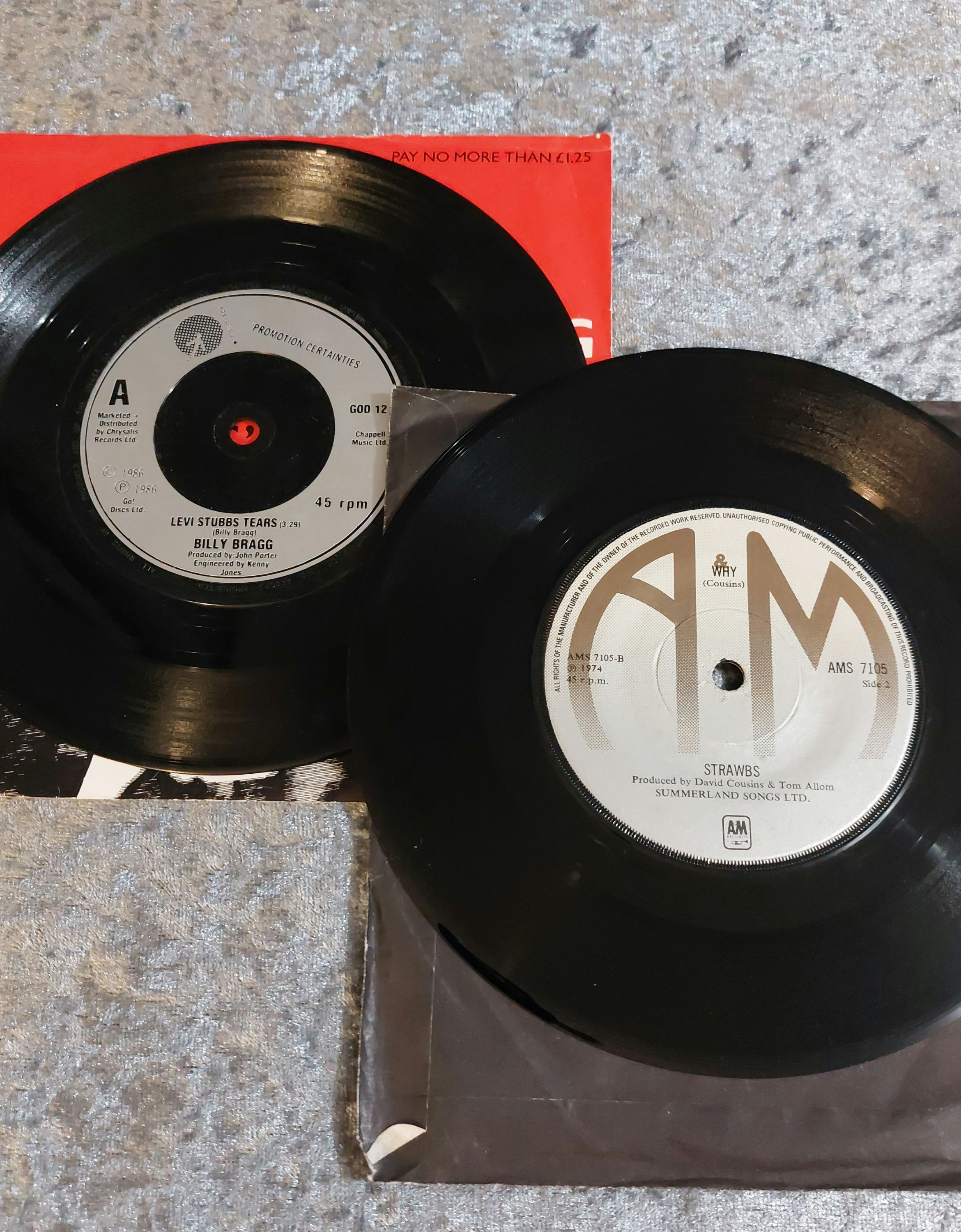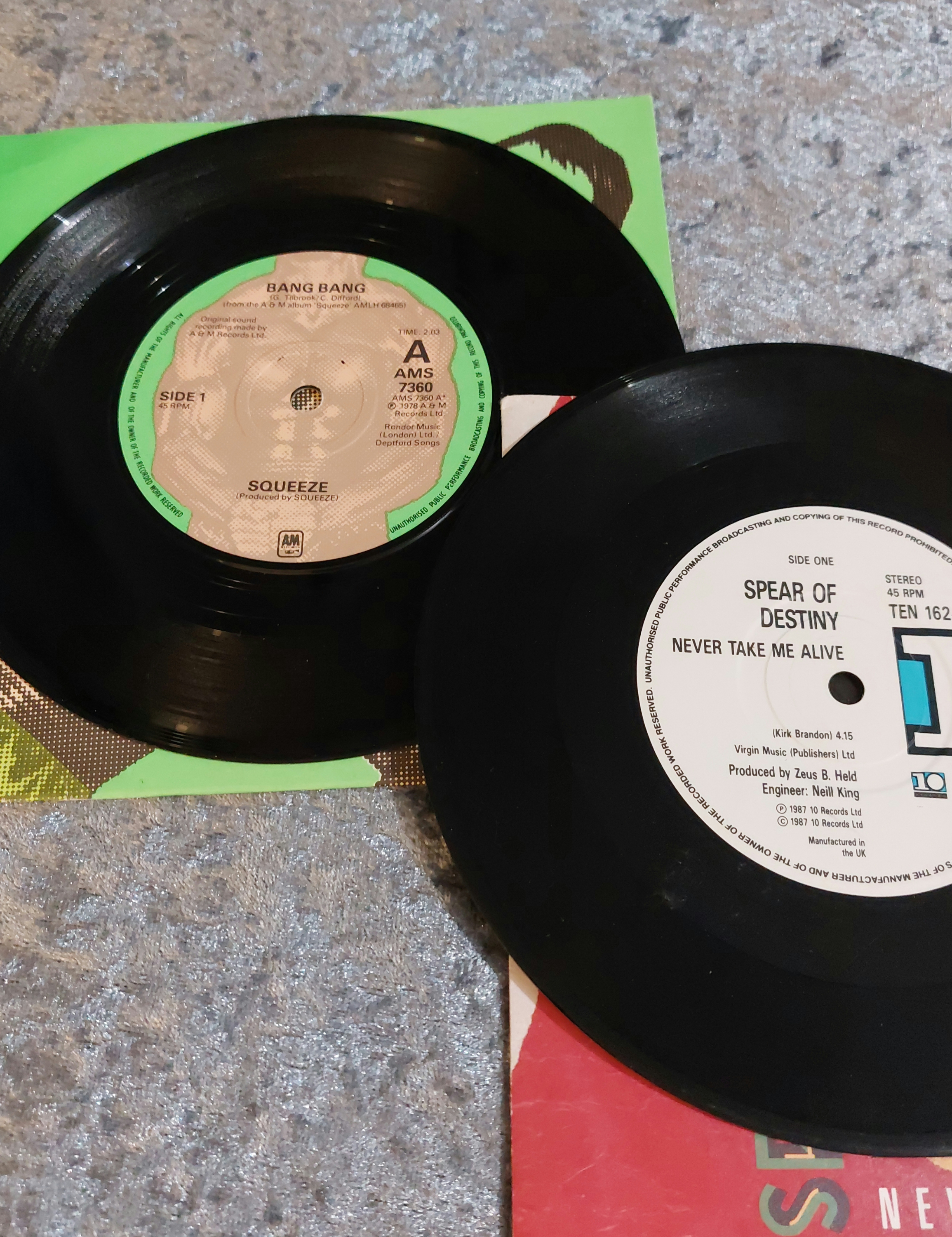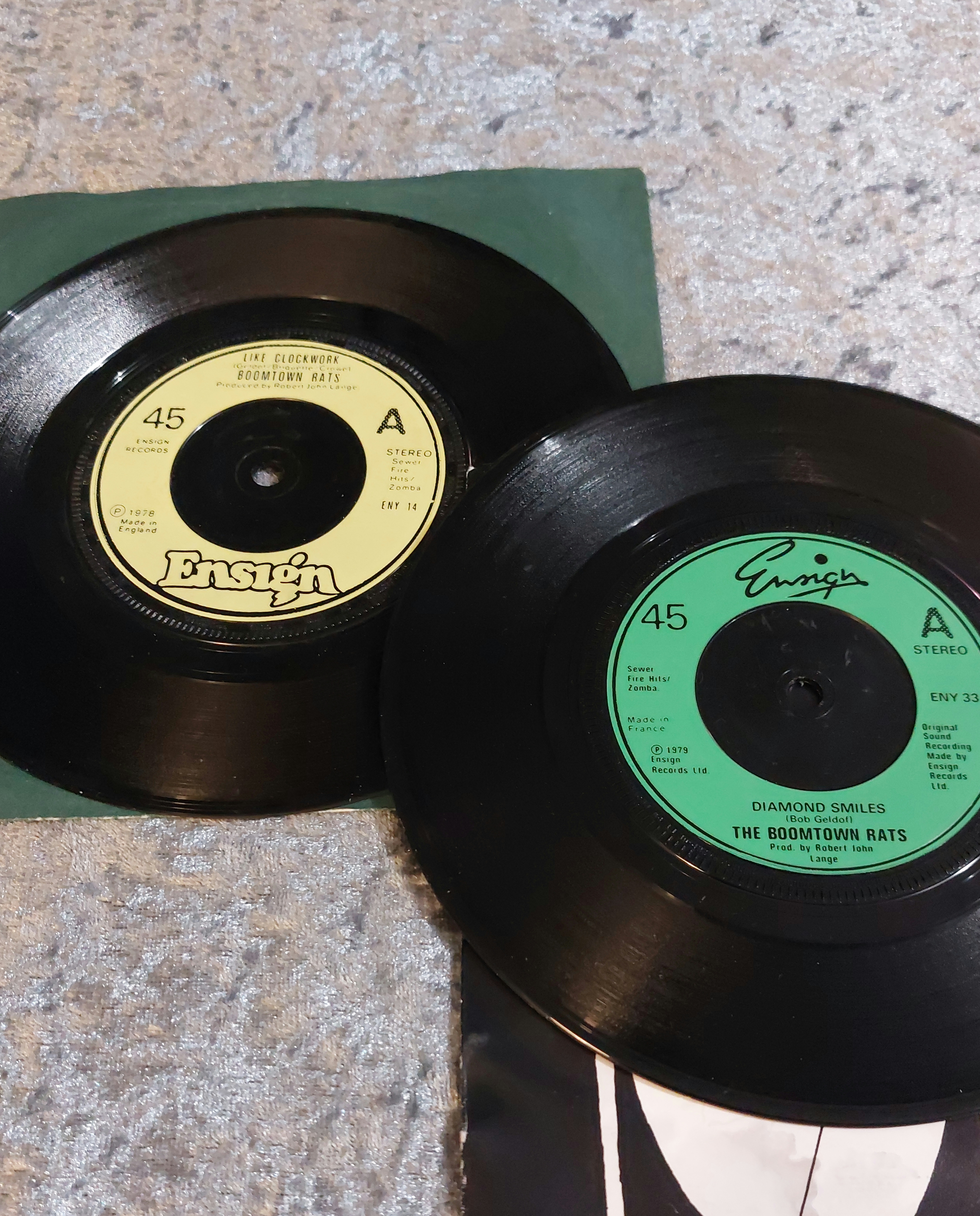 This lot comprises six 7-inch vinyl singles, seemingly dating from the late 1970s to the early 1980s based on label and sleeve designs. Artists and titles identifiable from the sleeves include The Boomtown Rats – “Diamond Smiles,” Billy Bragg – “Levi Stubbs’ Tears,” Squeeze – “Bang Bang,” and Spear of Destiny – “Never Take Me Alive.” Record labels present include Ensign, AM Records, and others. The records appear to be predominantly black vinyl. The sleeves exhibit various conditions, with some showing creases, markings, and discoloration. Further examination is recommended to fully assess the condition of both the records and sleeves.