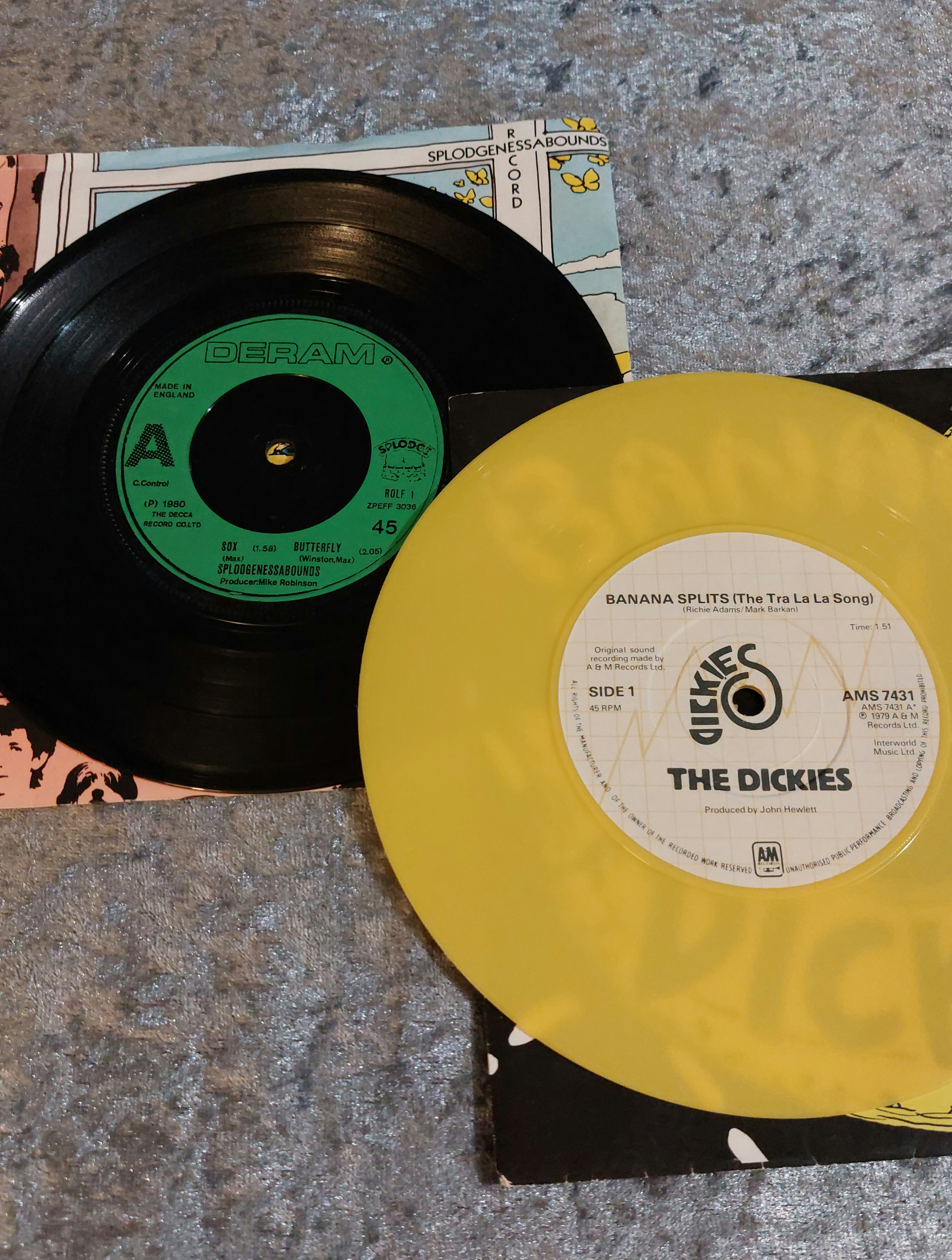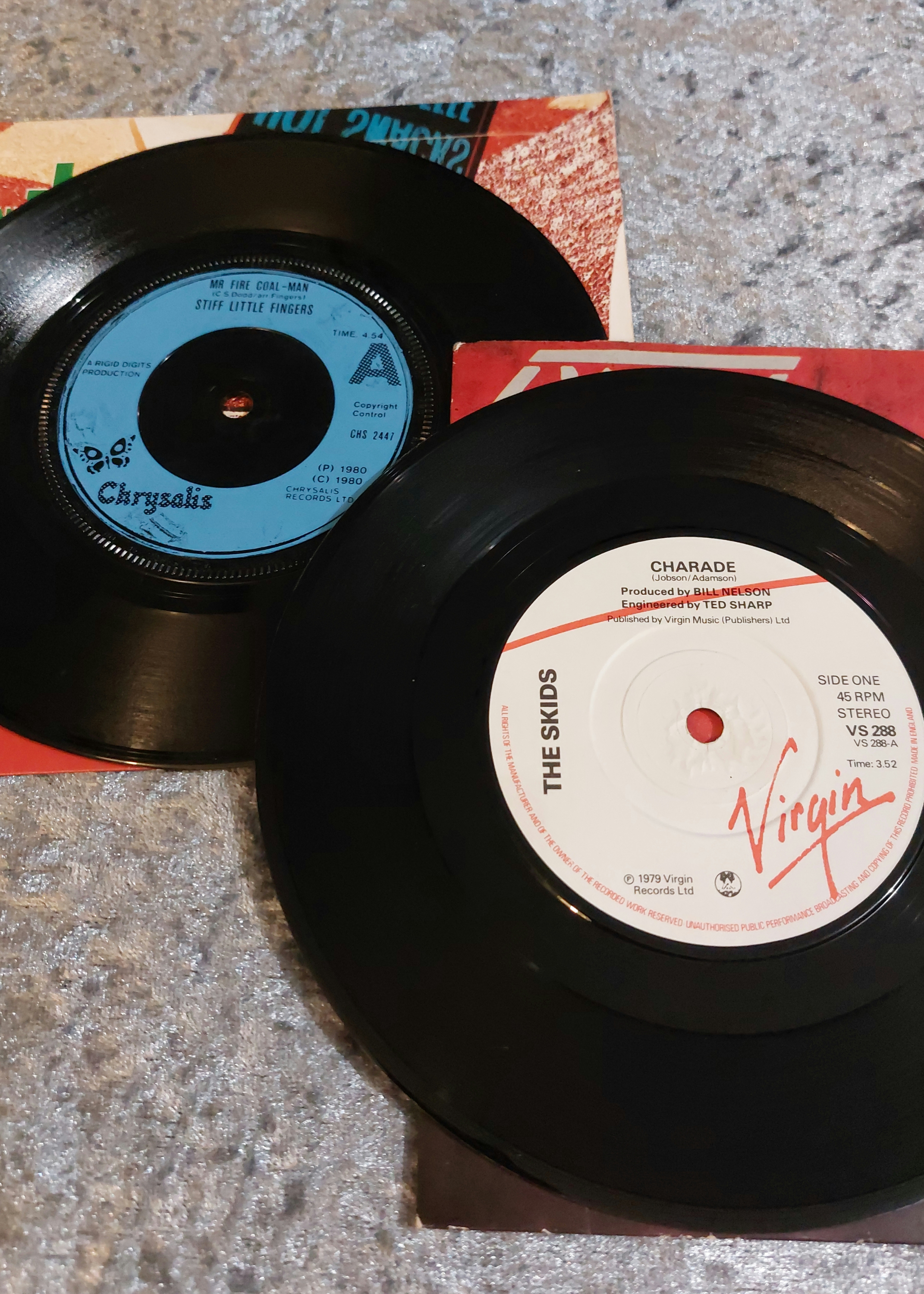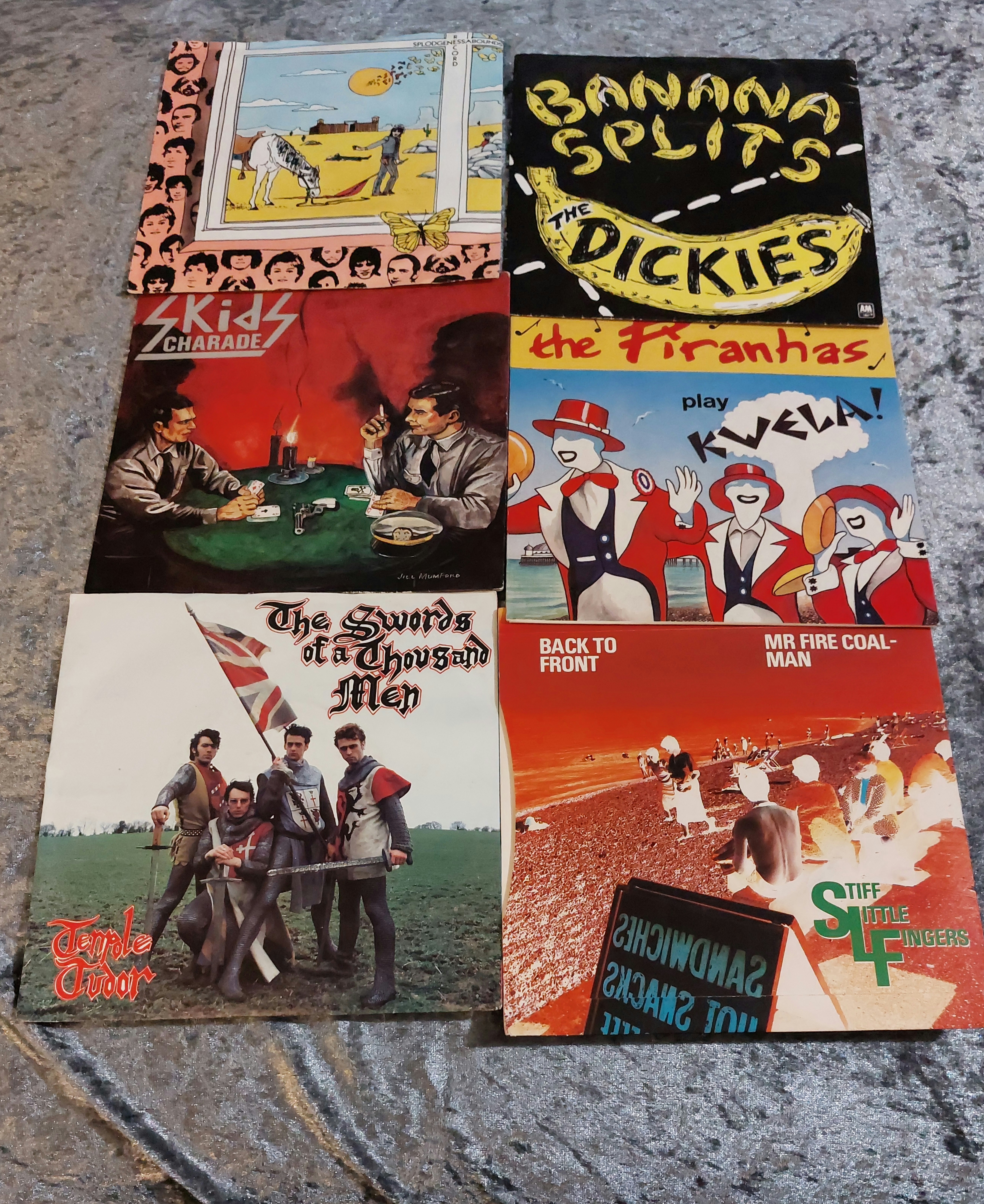 This lot comprises eleven vinyl records from the late 1970s and early 1980s, including six 12-inch LP albums and five 7-inch singles. The collection features a variety of artists and musical styles. Album art varies from cartoonish illustrations to photographic images. Labels represented in the collection include Chrysalis, Virgin, Sire, and Deram. The records exhibit varying degrees of wear consistent with age and use.