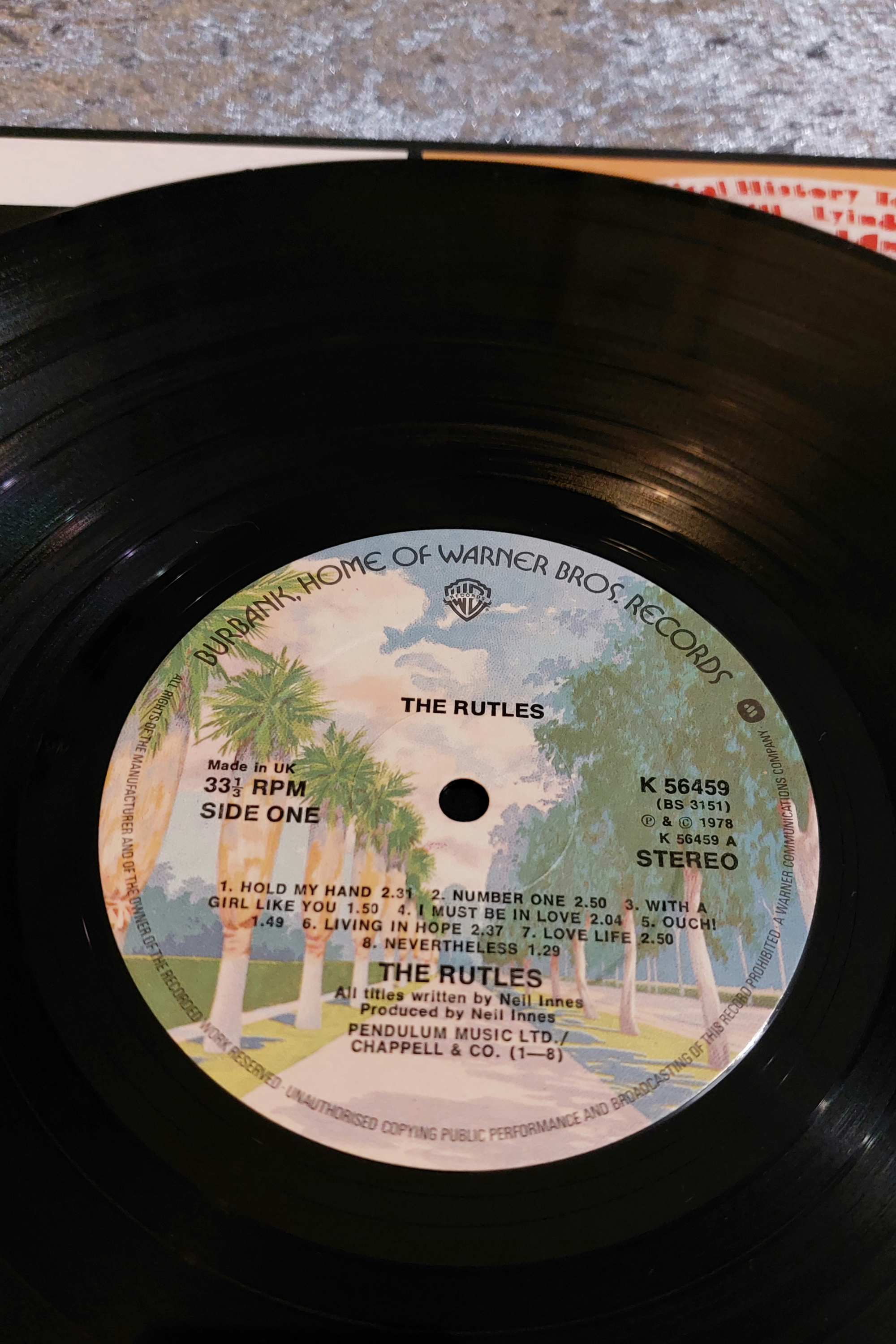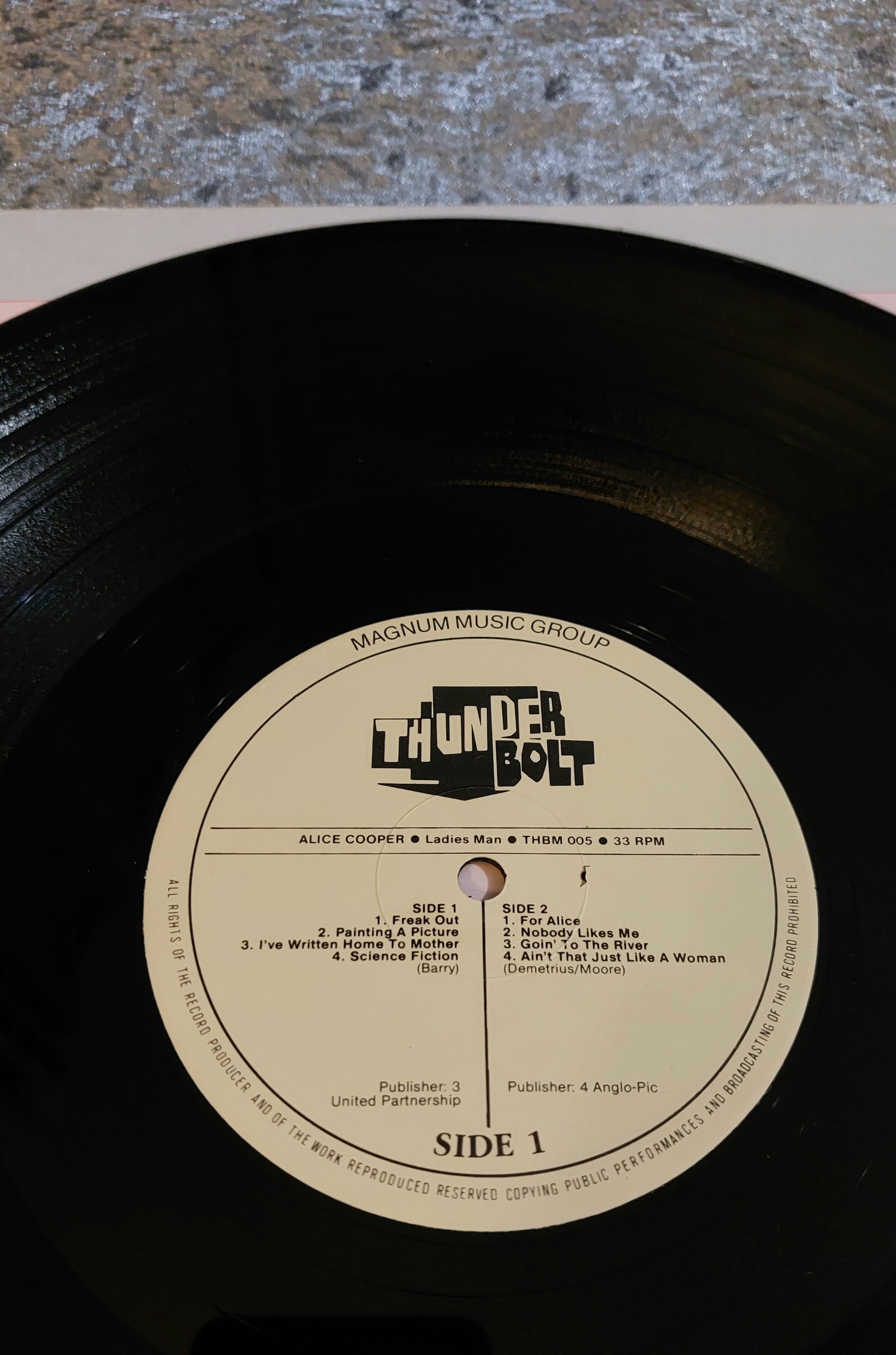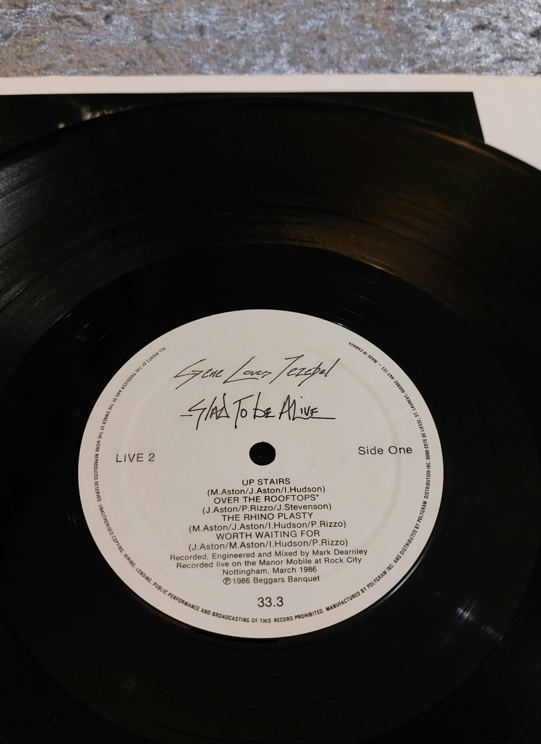 Three vinyl LP records. The first is “Alice Cooper – Ladies Man” on the Magnum Music Group/Thunderbolt label. The second is “Gene Loves Jezebel – Glad To Be Alive (Live 2)” on the Beggars Banquet label. The third is by The Rutles on the Warner Bros. label. All three records exhibit some minor wear consistent with previously owned items.