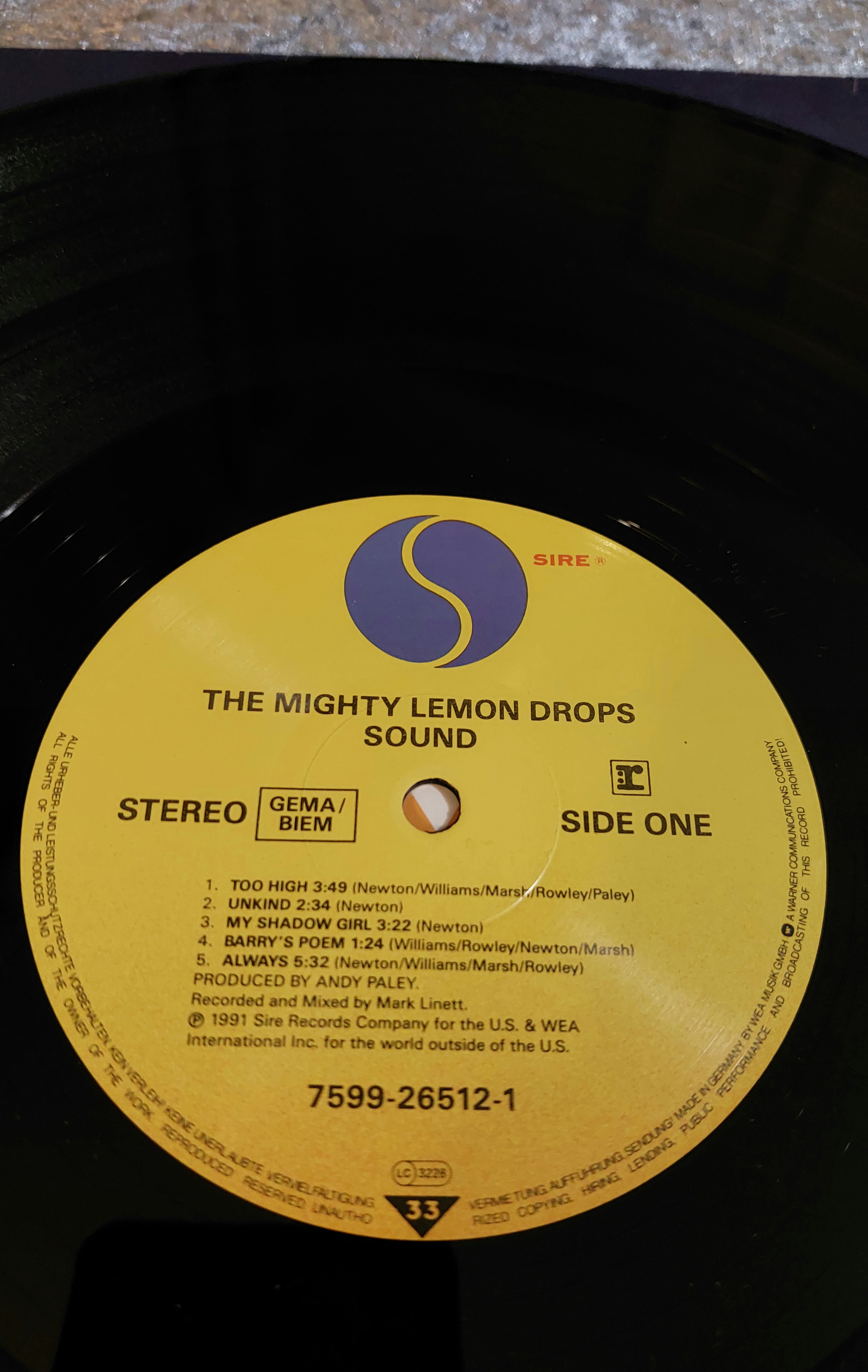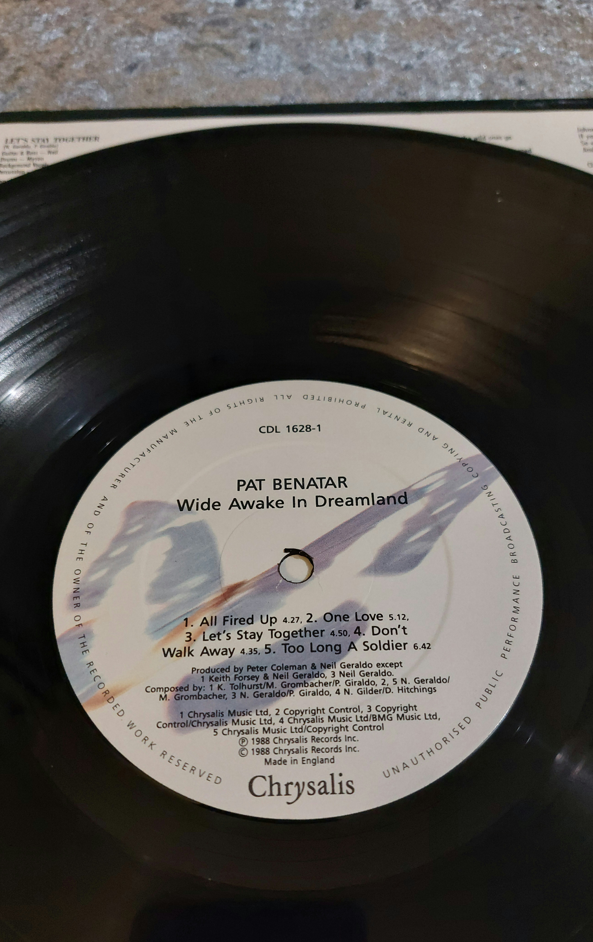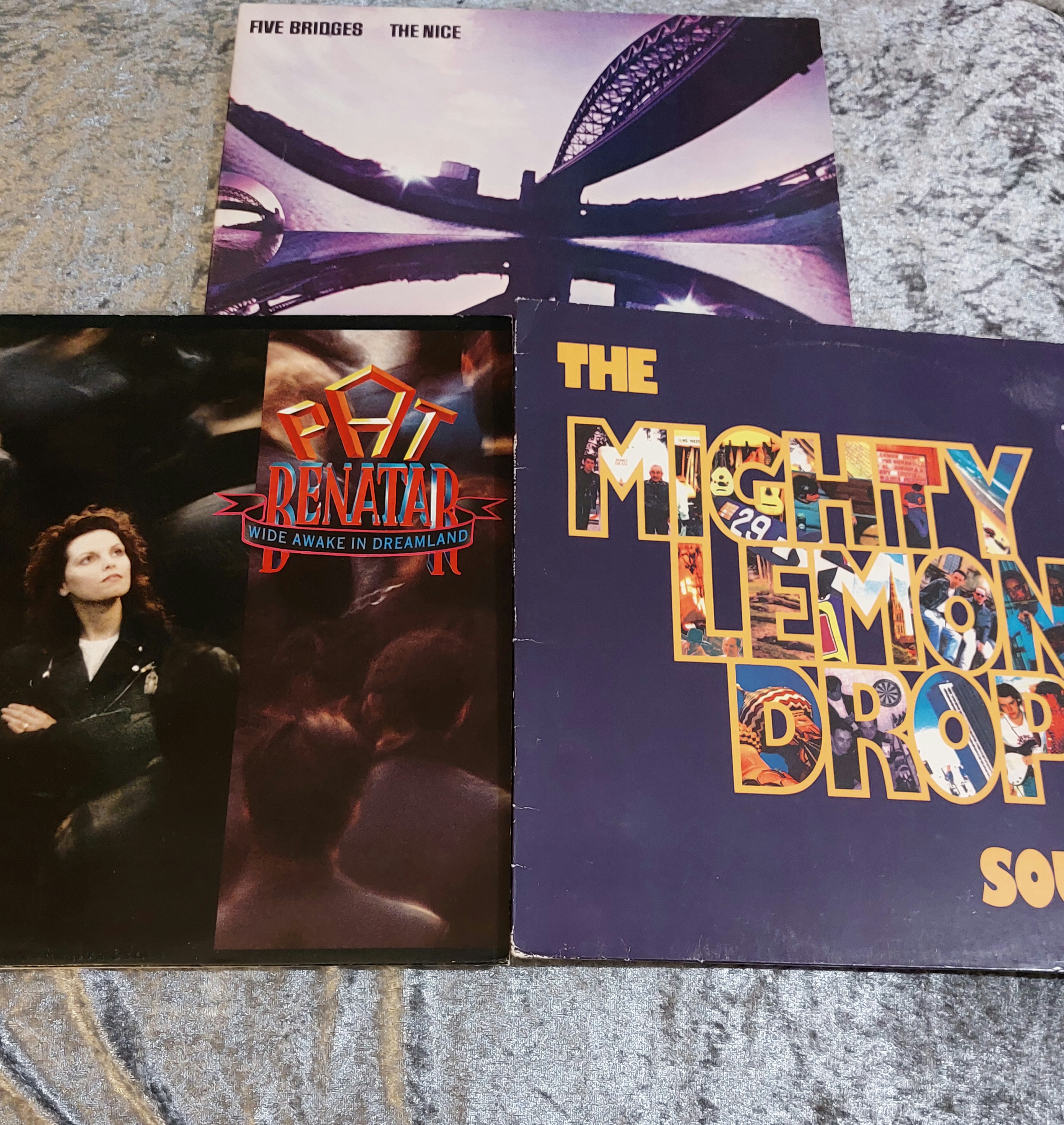 Three vinyl long-playing records. The first is “Wide Awake in Dreamland” by Pat Benatar, Chrysalis Records, CDL 1628-1. The second is “Sound” by The Mighty Lemon Drops, Sire Records, 7599-26512-1. The third is “Five Bridges” by The Nice, Charisma Records, CAS 1014. All three LPs include their original sleeves and feature track listings, recording information, and identifying marks including manufacturer and copyright details.