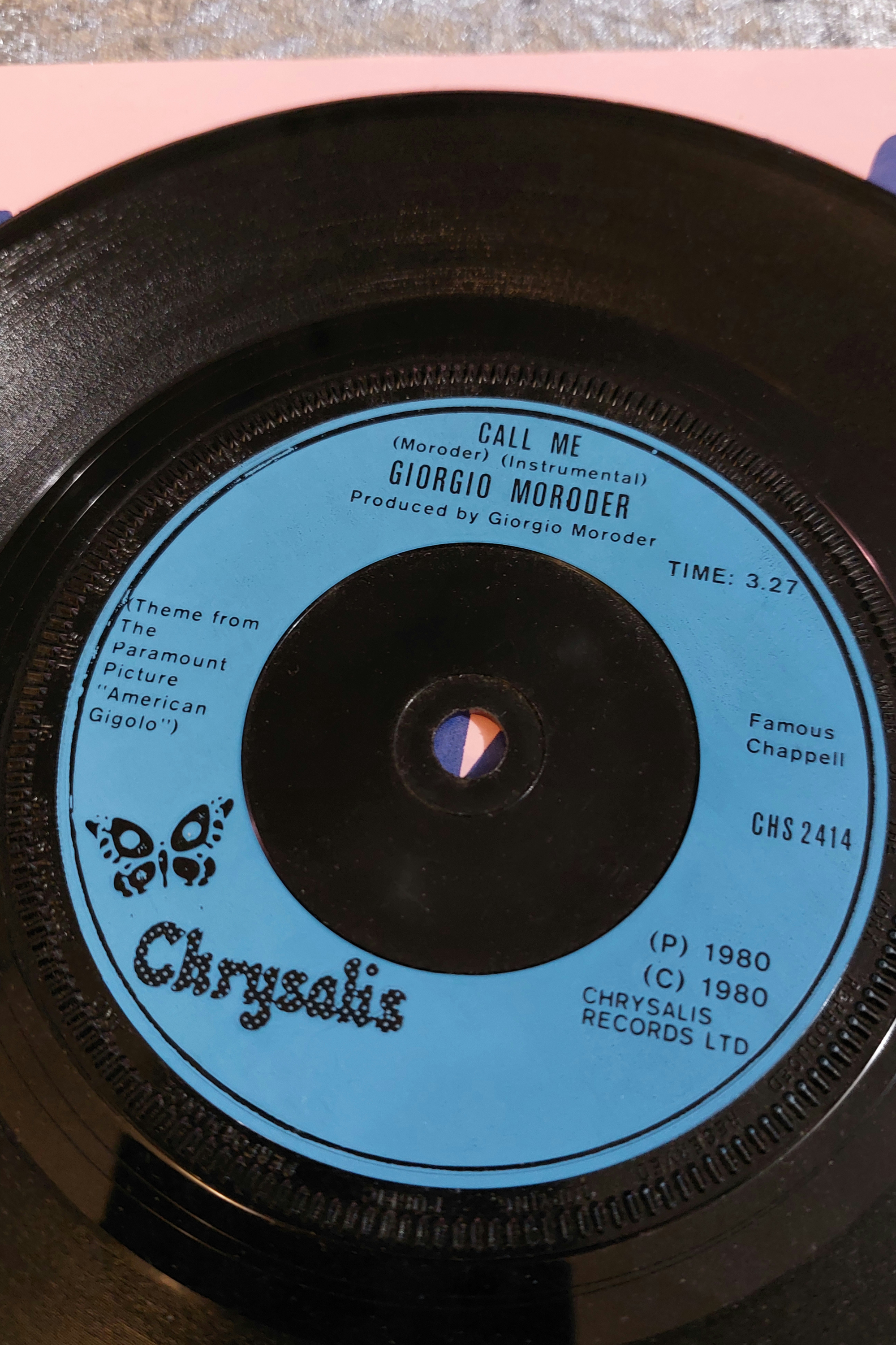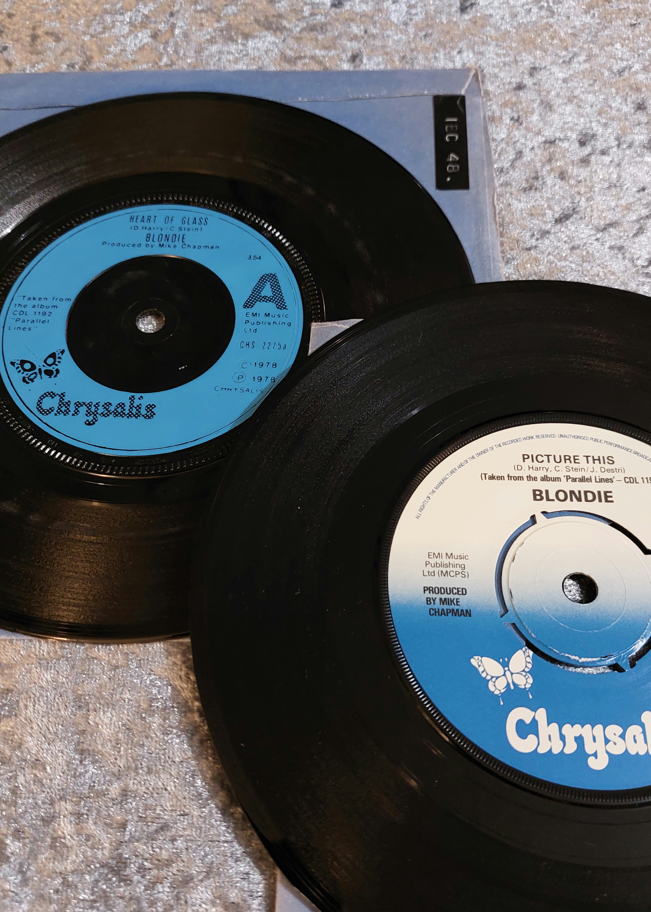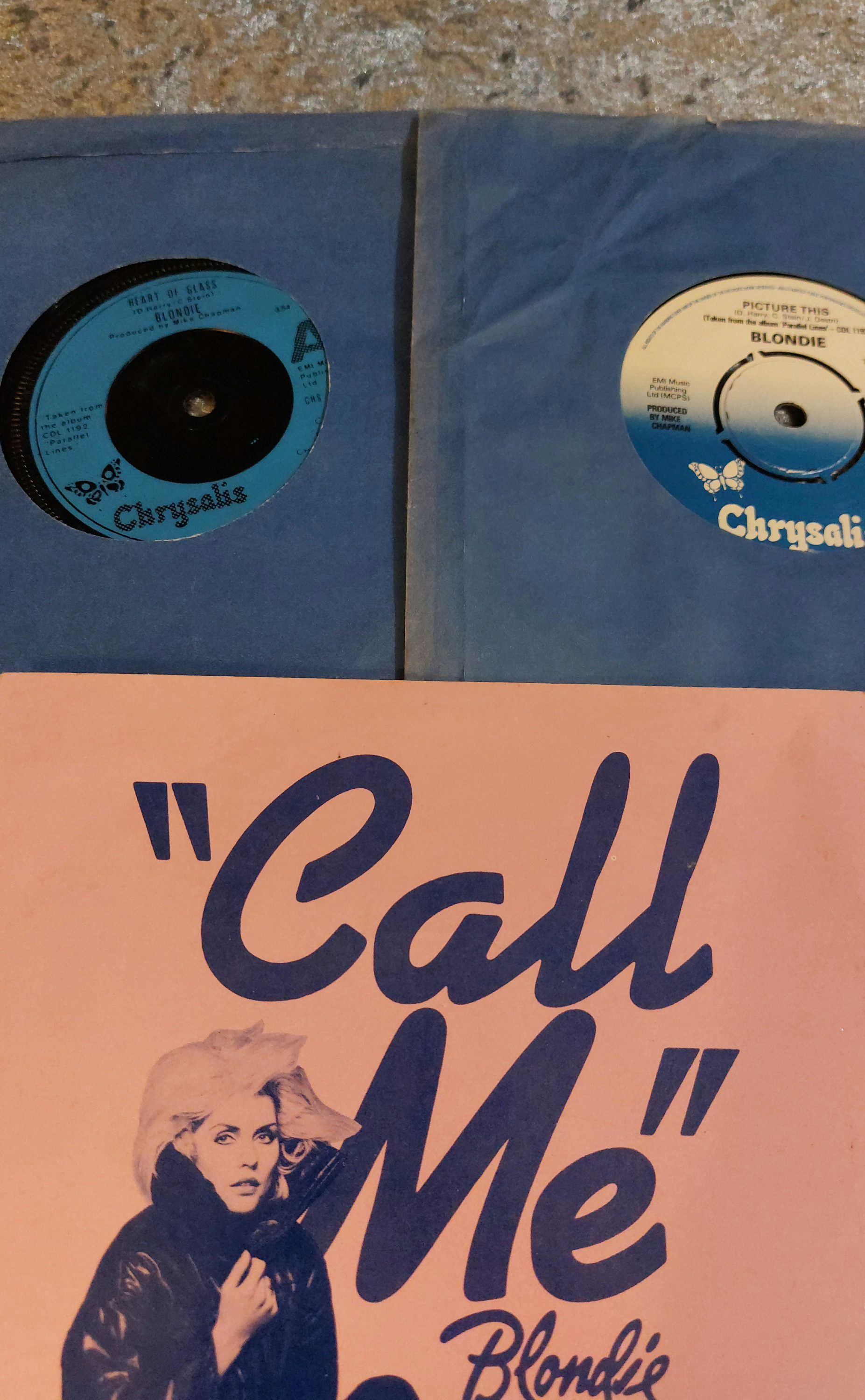 This lot comprises three 7-inch vinyl singles. Two are by Blondie: “Heart of Glass” / “Picture This” and “Picture This.” The third single is “Call Me” by Giorgio Moroder. All three singles are on the Chrysalis Records label and include their original picture sleeves. Two of the sleeves are blue, and one is pink. The vinyl records exhibit matrix numbers and Chrysalis logos.