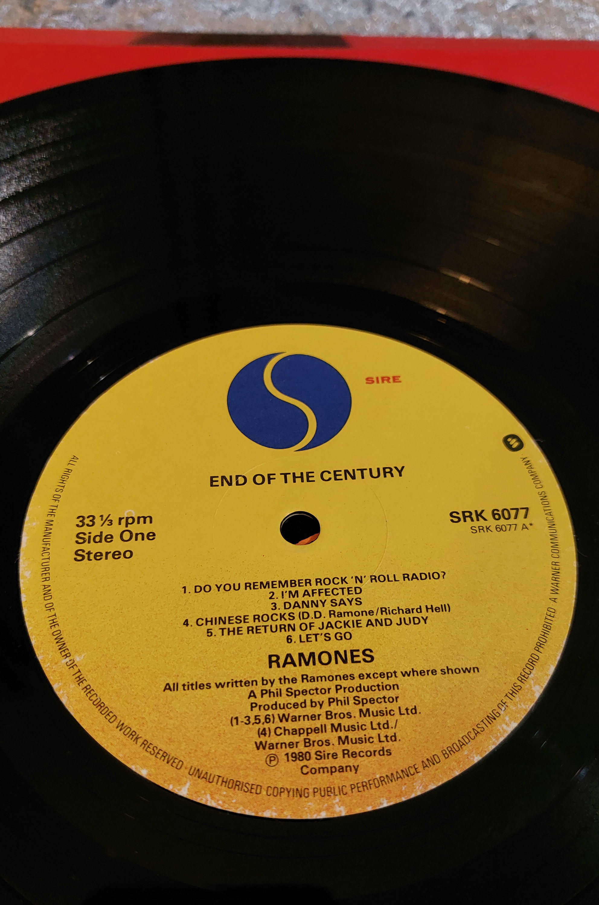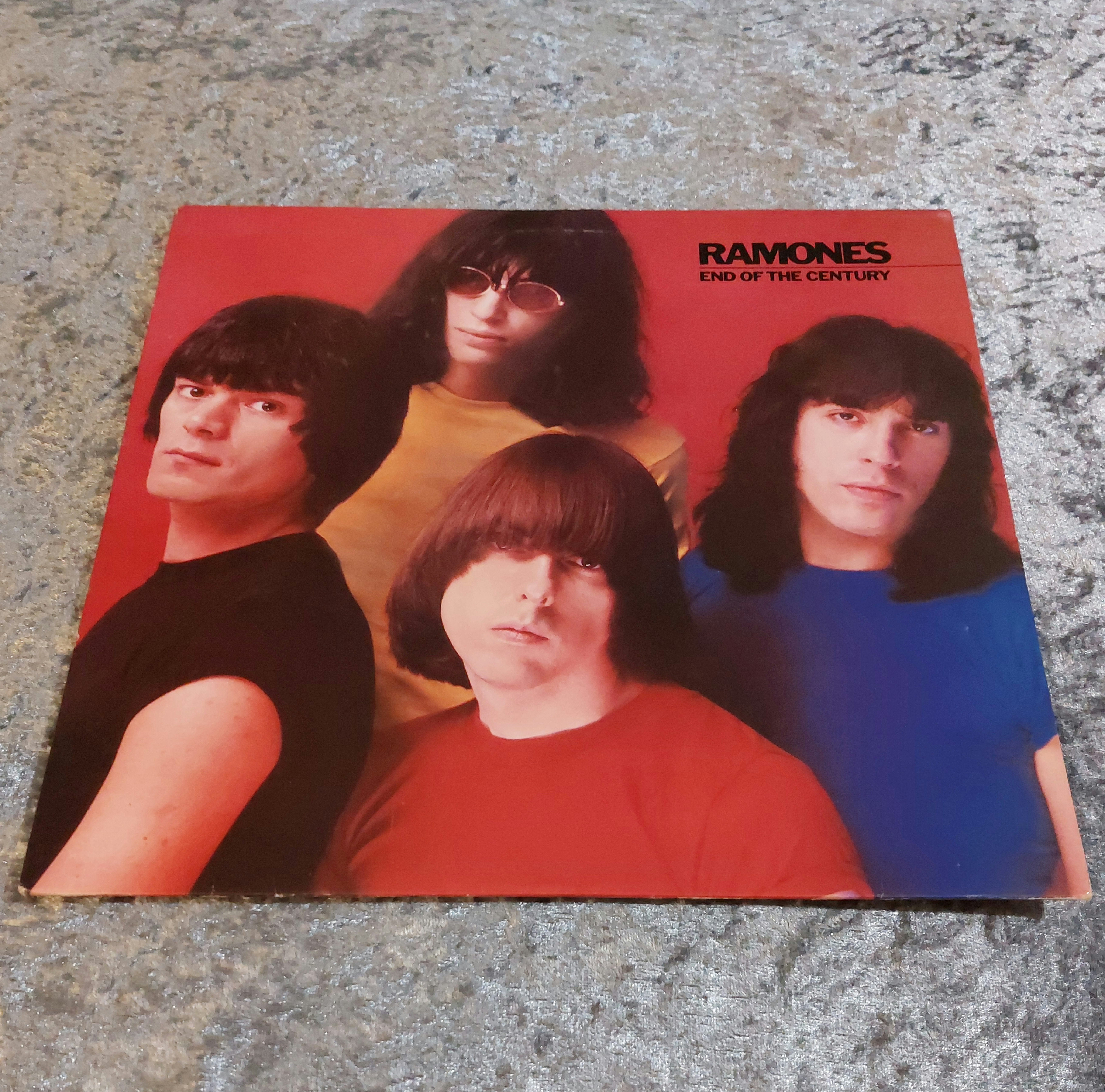 Vinyl long-playing (LP) record album titled “End of the Century” by the Ramones. Gatefold sleeve with photographic image of the band against a red background. Yellow record label with Sire Records logo. Includes track listing, recording credits, and copyright information. Marked “33 1/3 rpm” and “Side One Stereo.” Matrix number SRK 6077-A.