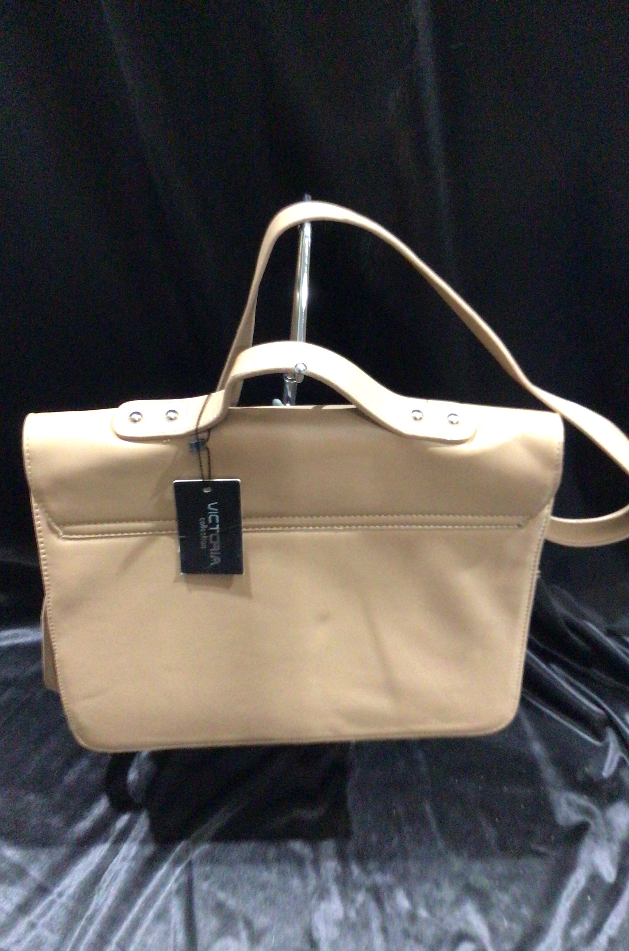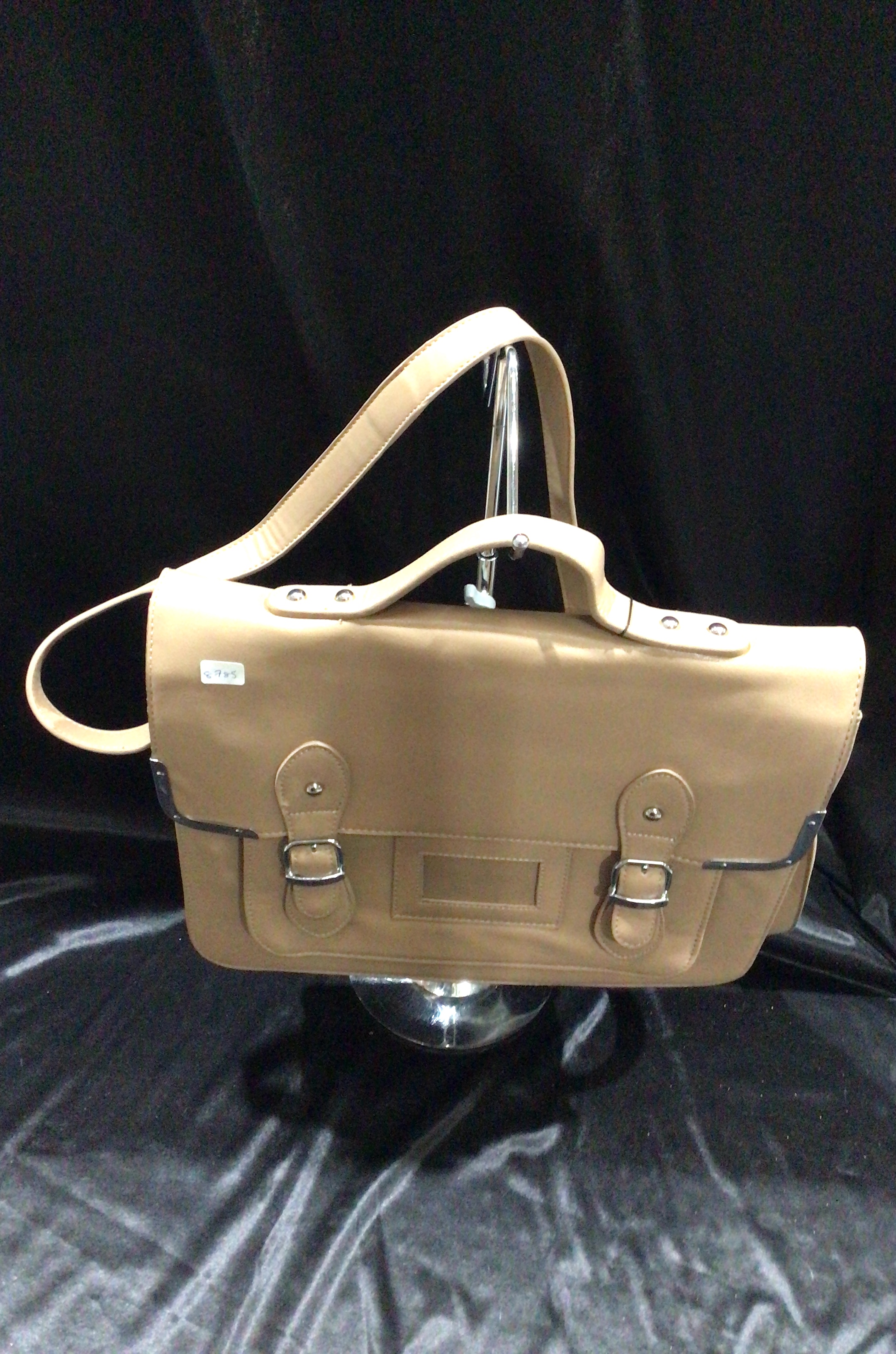 A light brown rectangular faux leather handbag with a flap closure, silver-toned buckles, a top handle, and an adjustable shoulder strap.