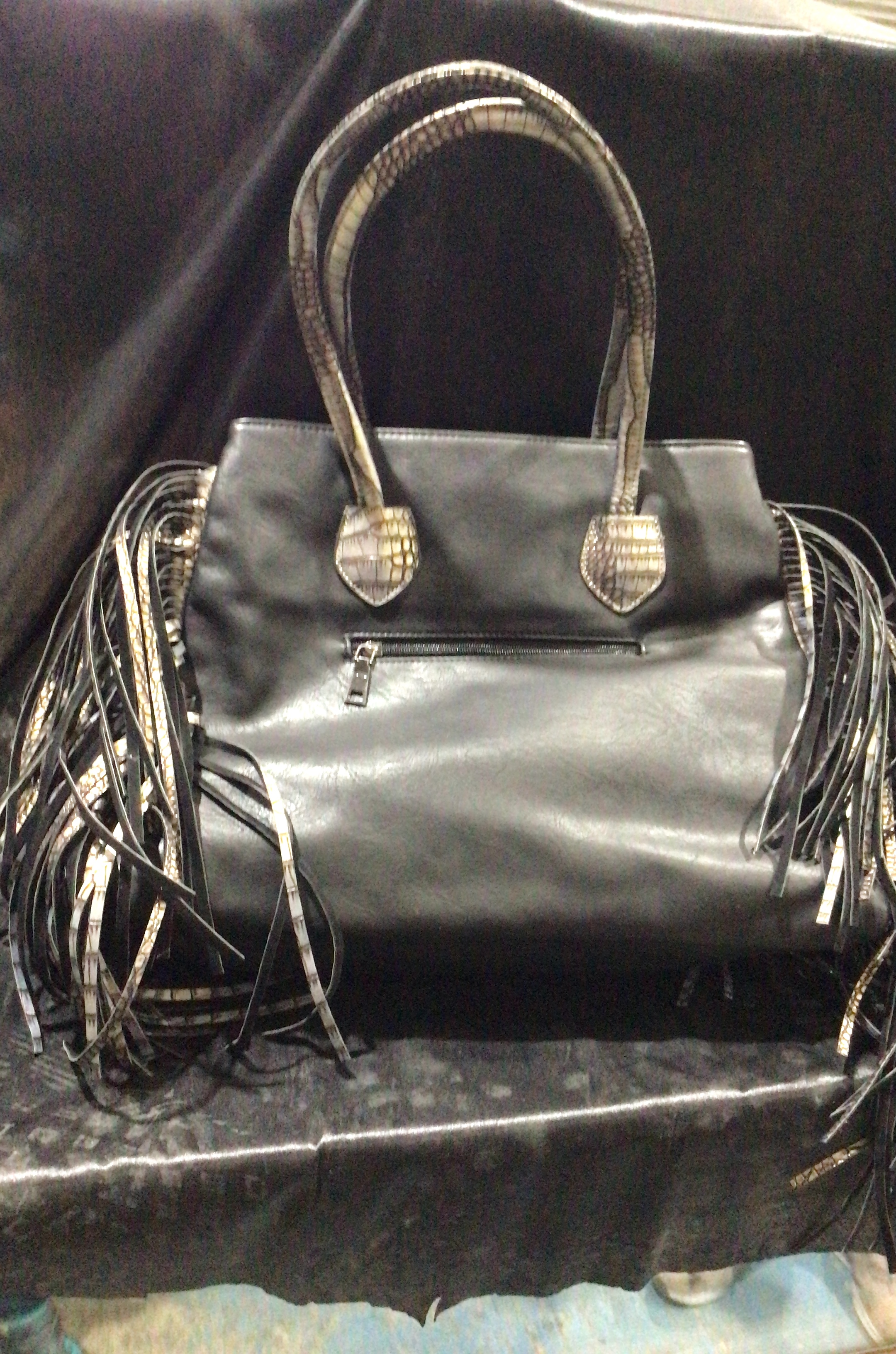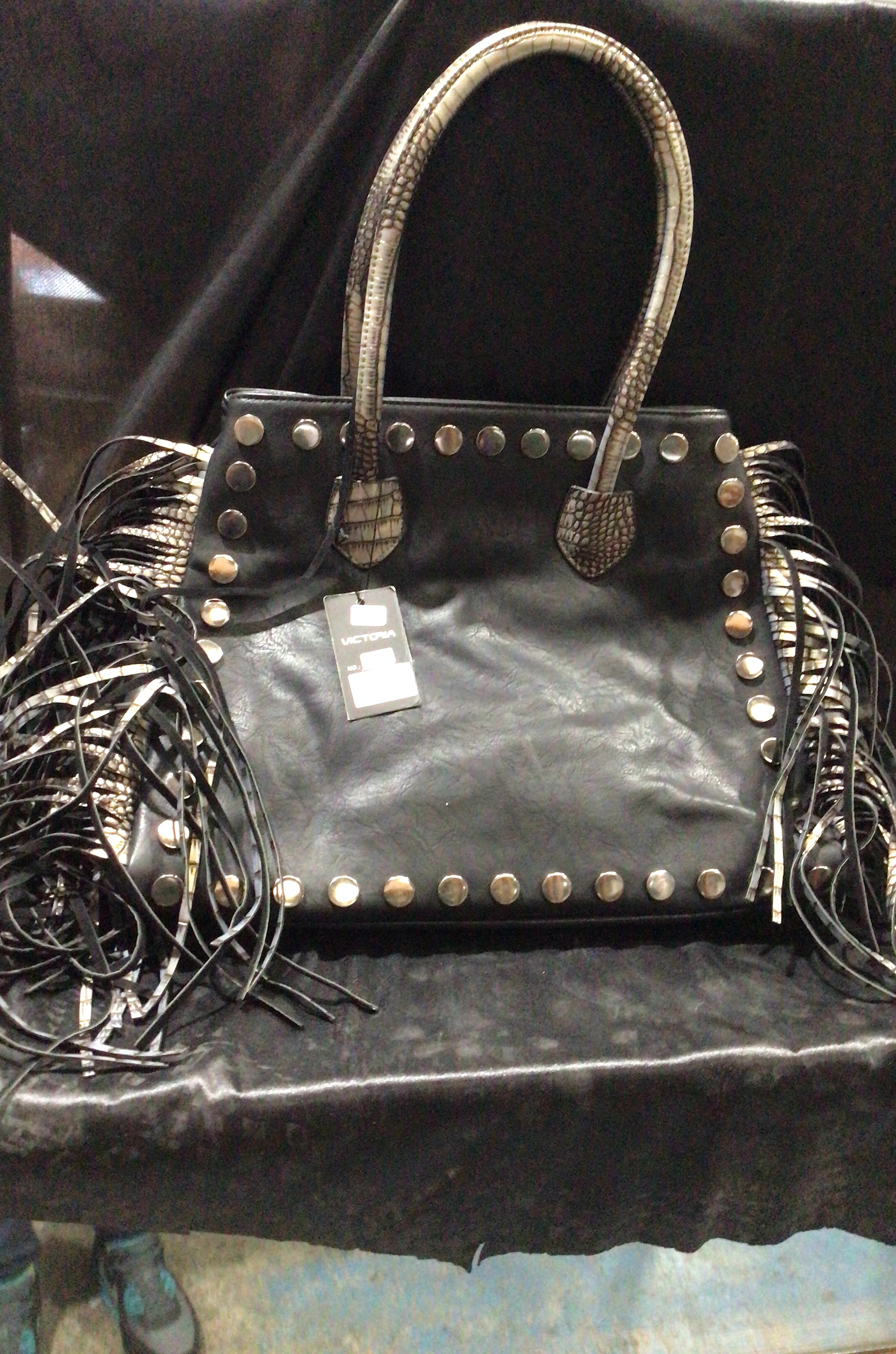 A black textured handbag featuring silver-toned studs, decorative fringe, and a grey and white patterned handle.