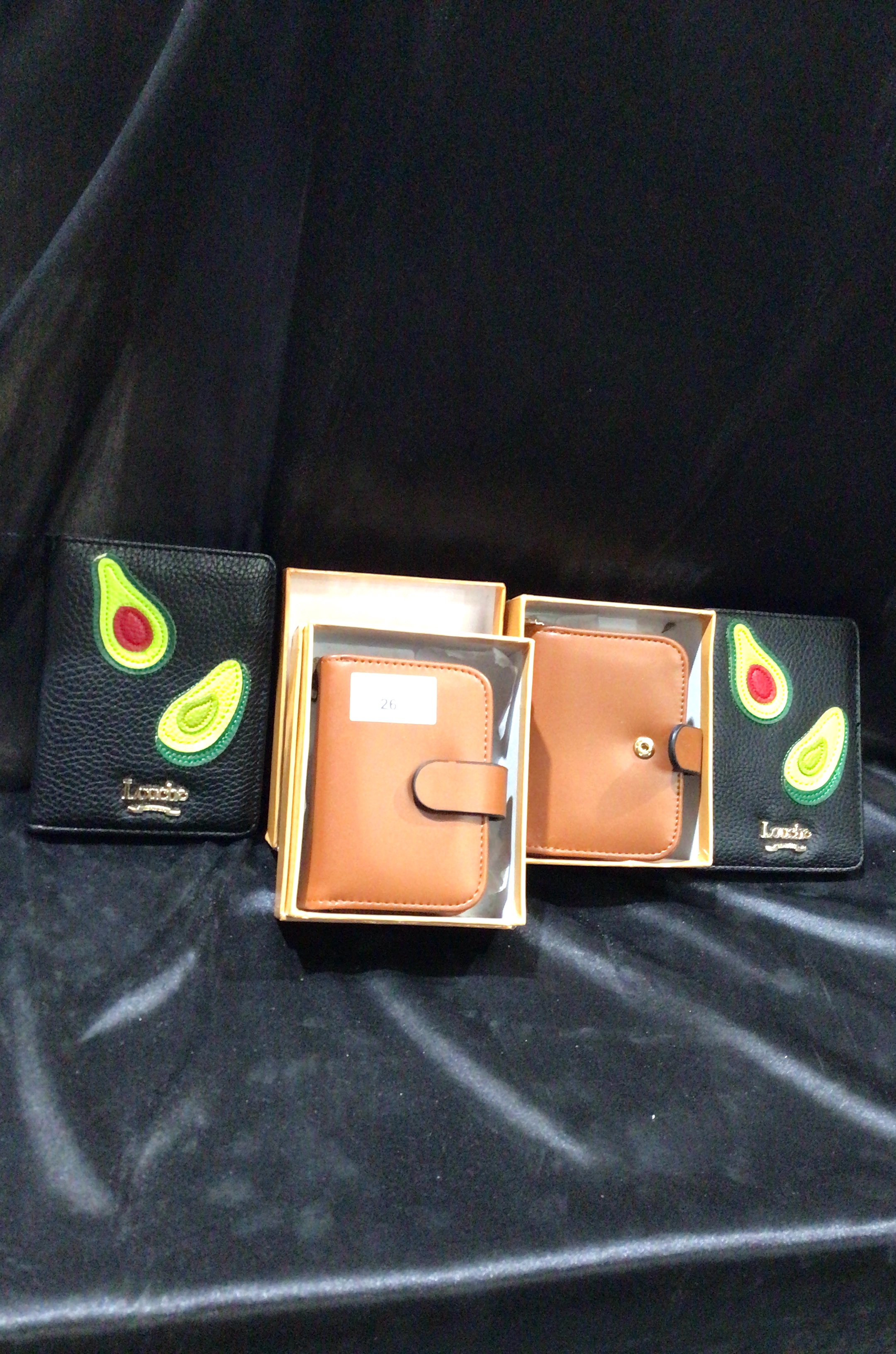 A collection of wallets featuring avocado designs and a flap closure wallet.