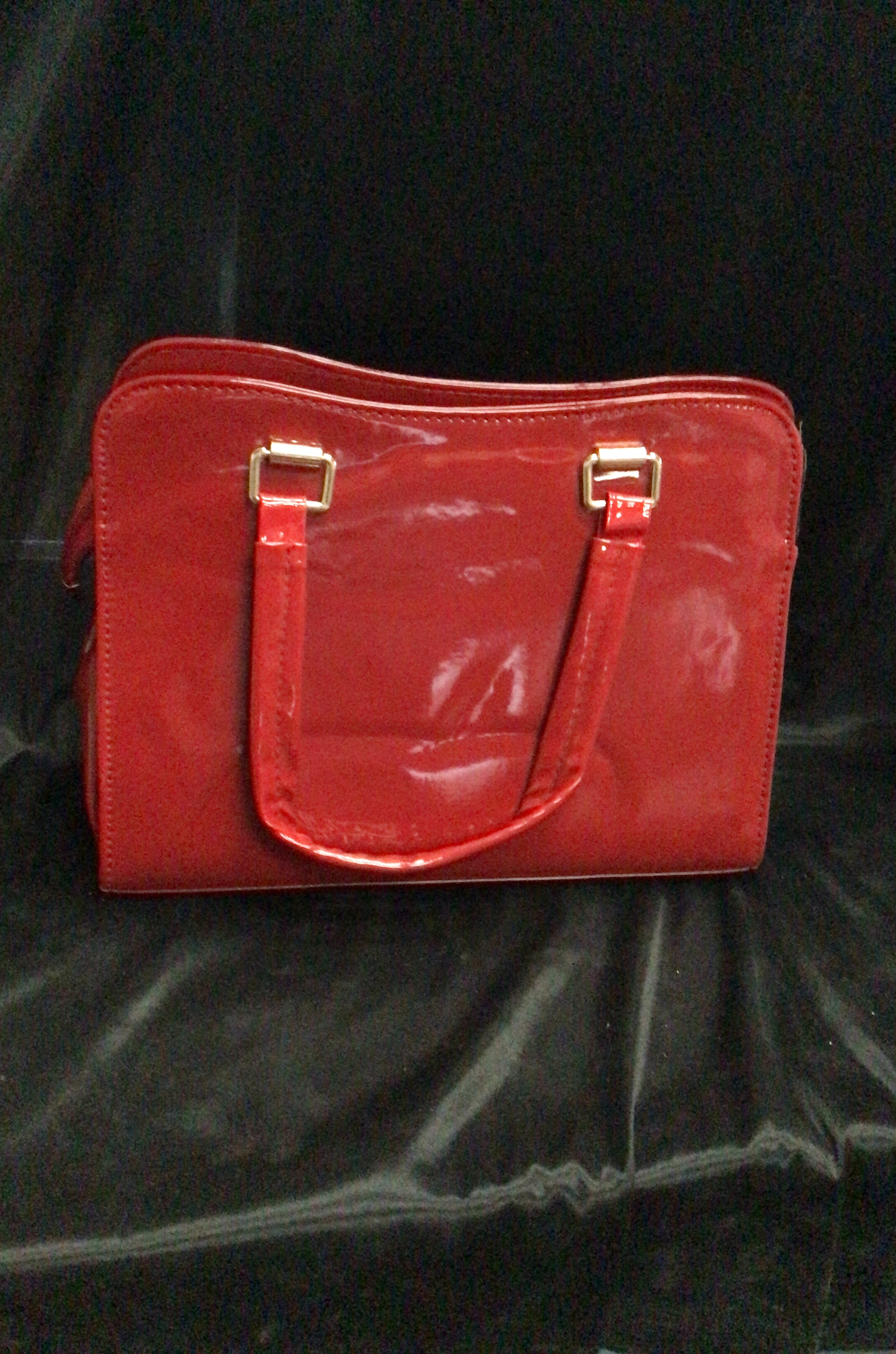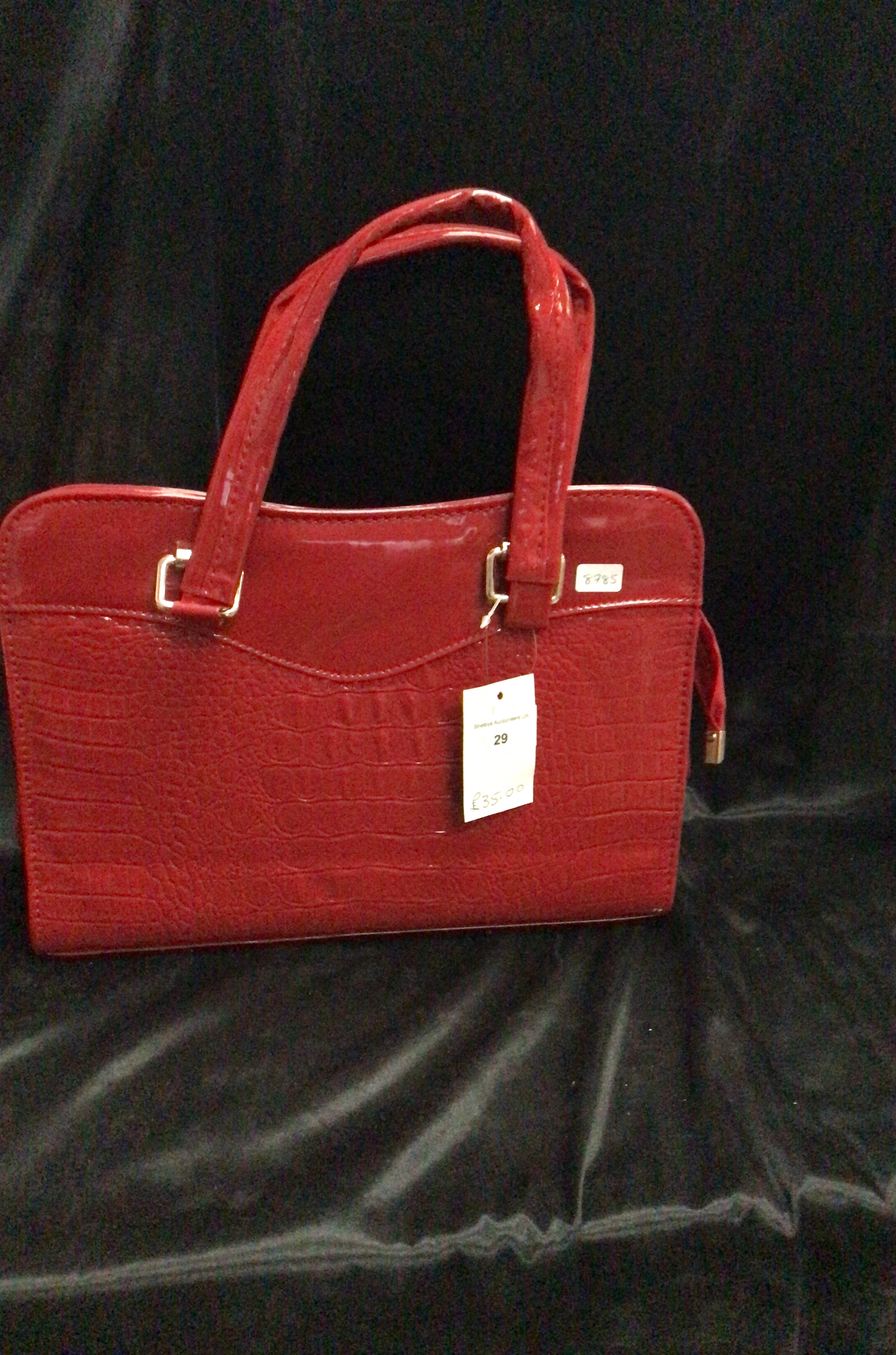A red patent leather handbag featuring a crocodile effect lower panel and gold-toned hardware.