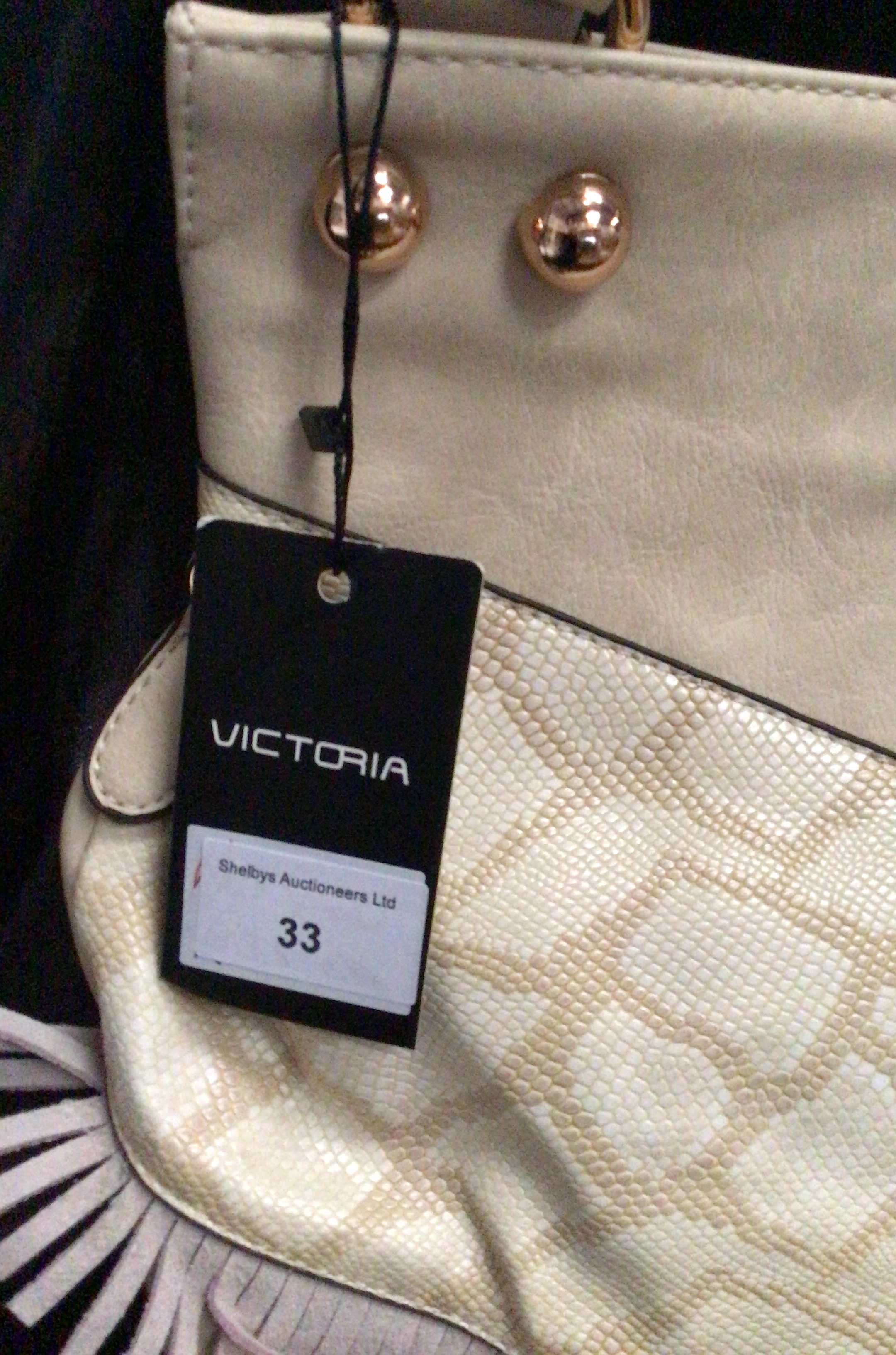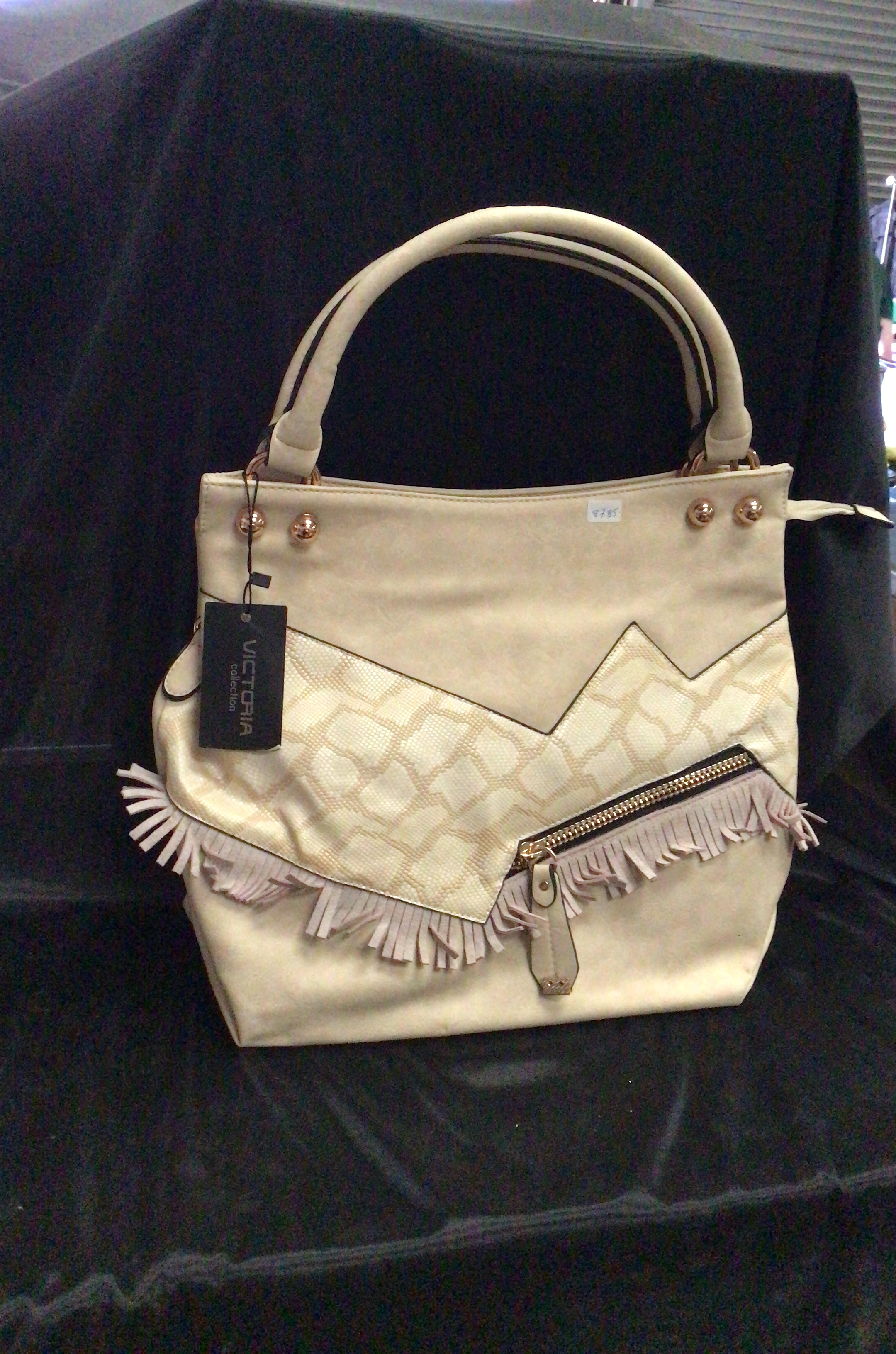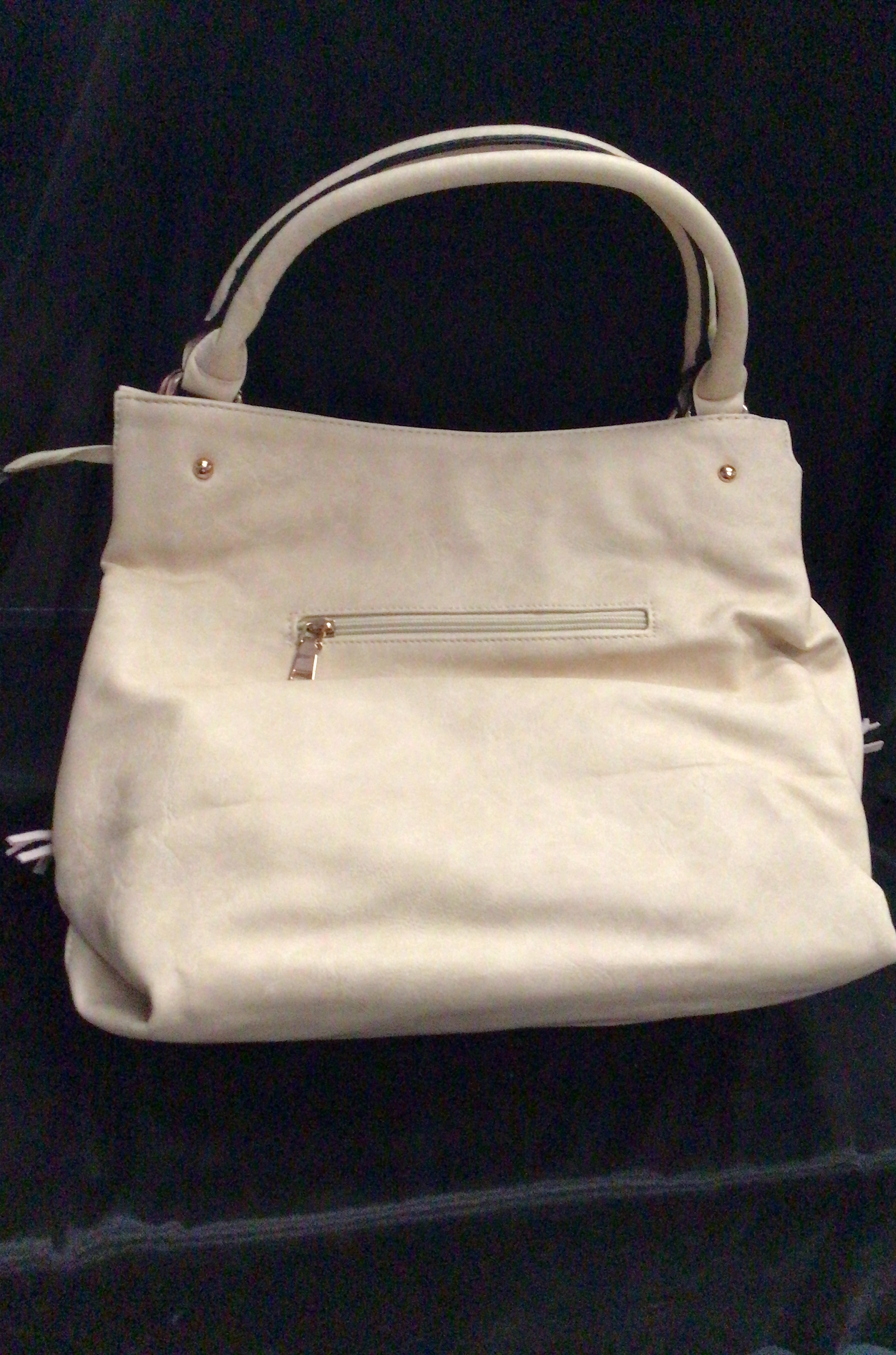 A cream-colored faux leather handbag featuring a geometric textured front panel, gold-tone hardware, fringe detailing, and multiple zippered pockets.