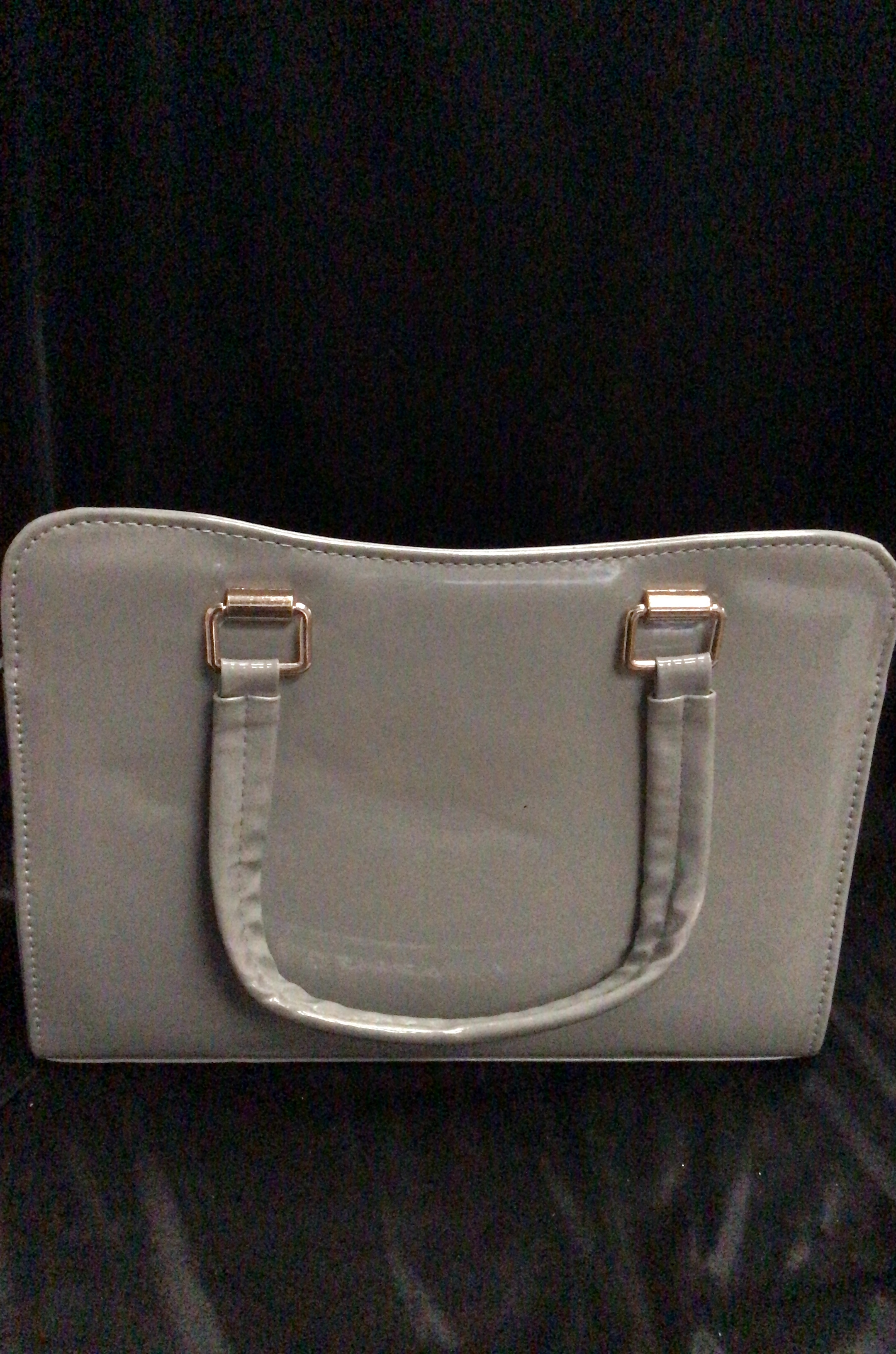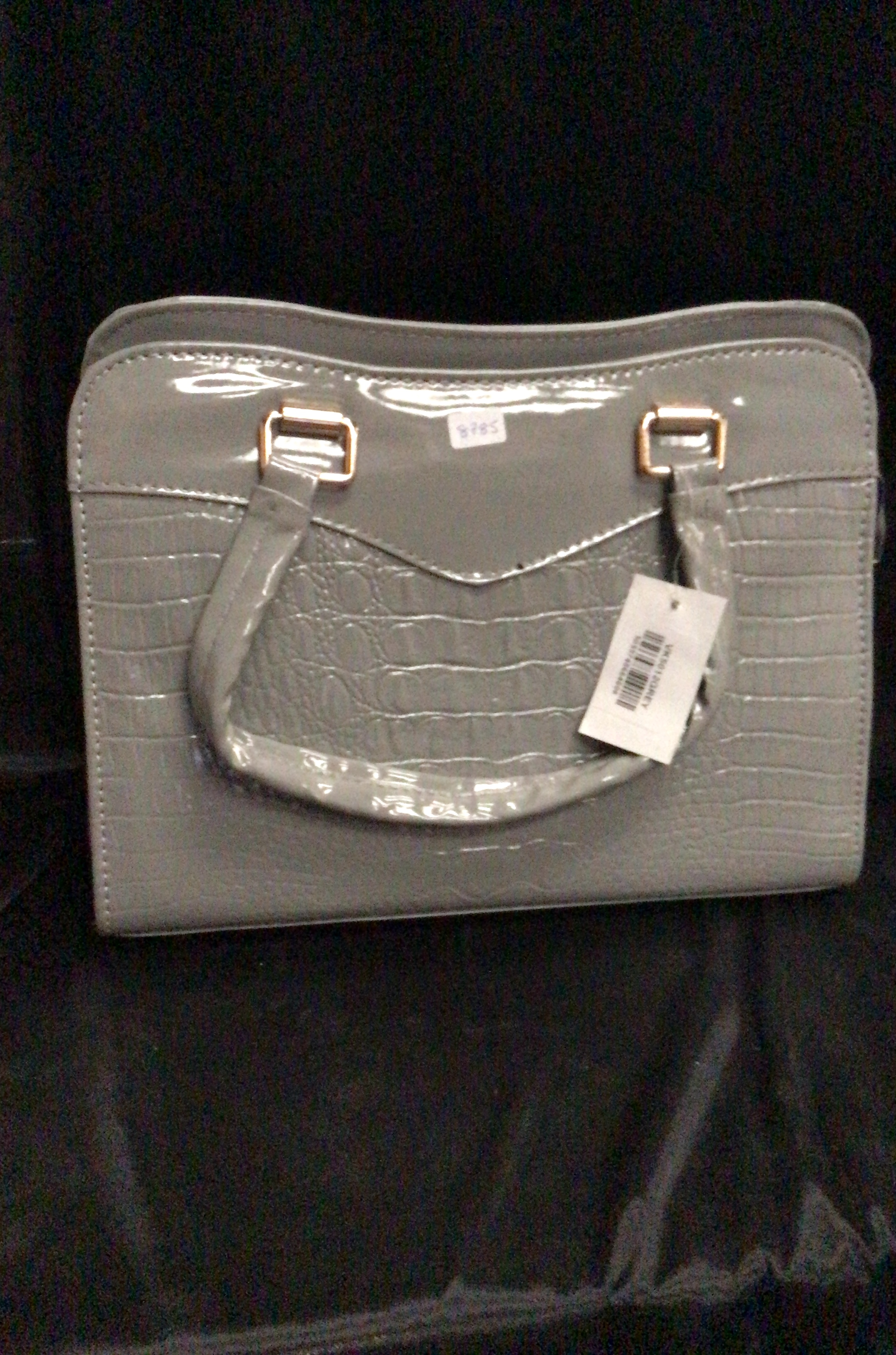This is a light gray patent handbag with a crocodile-embossed front and gold-toned hardware.