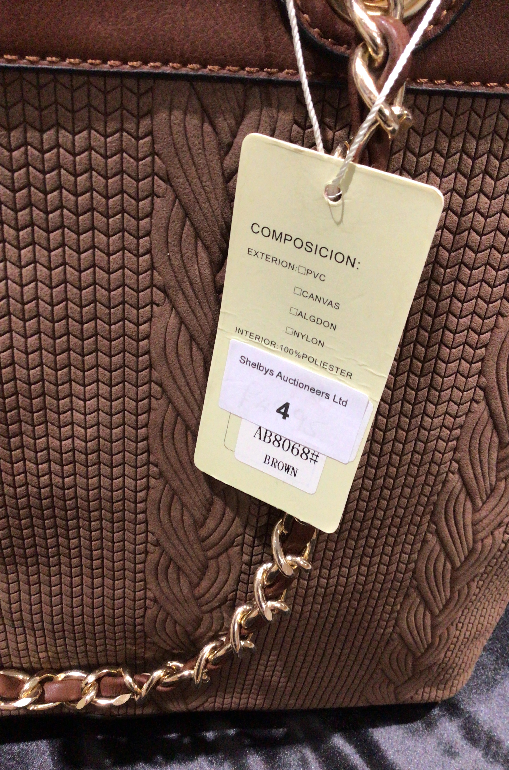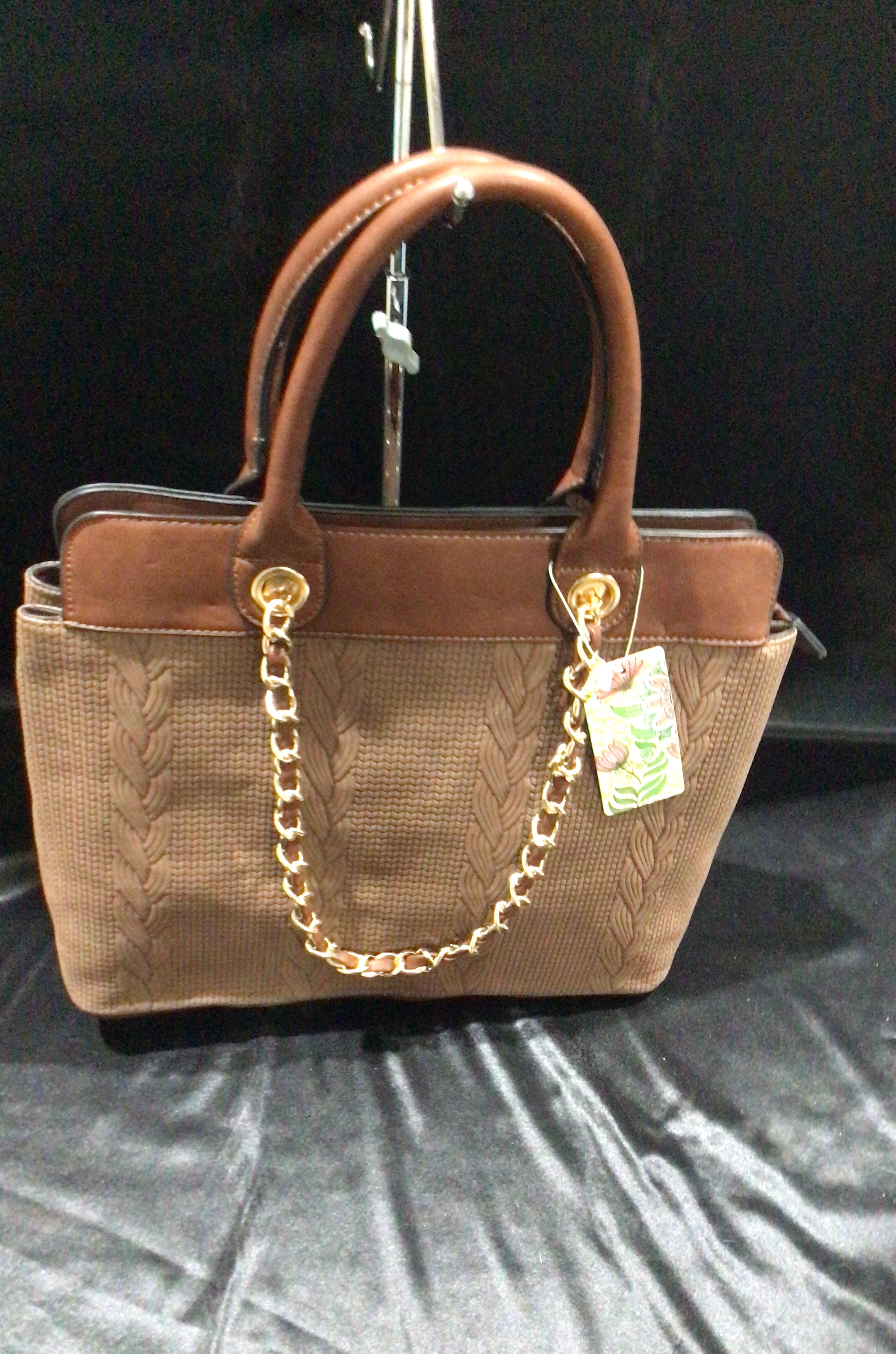 A textured brown handbag with smooth accents, gold-toned hardware, and a decorative floral tag.
