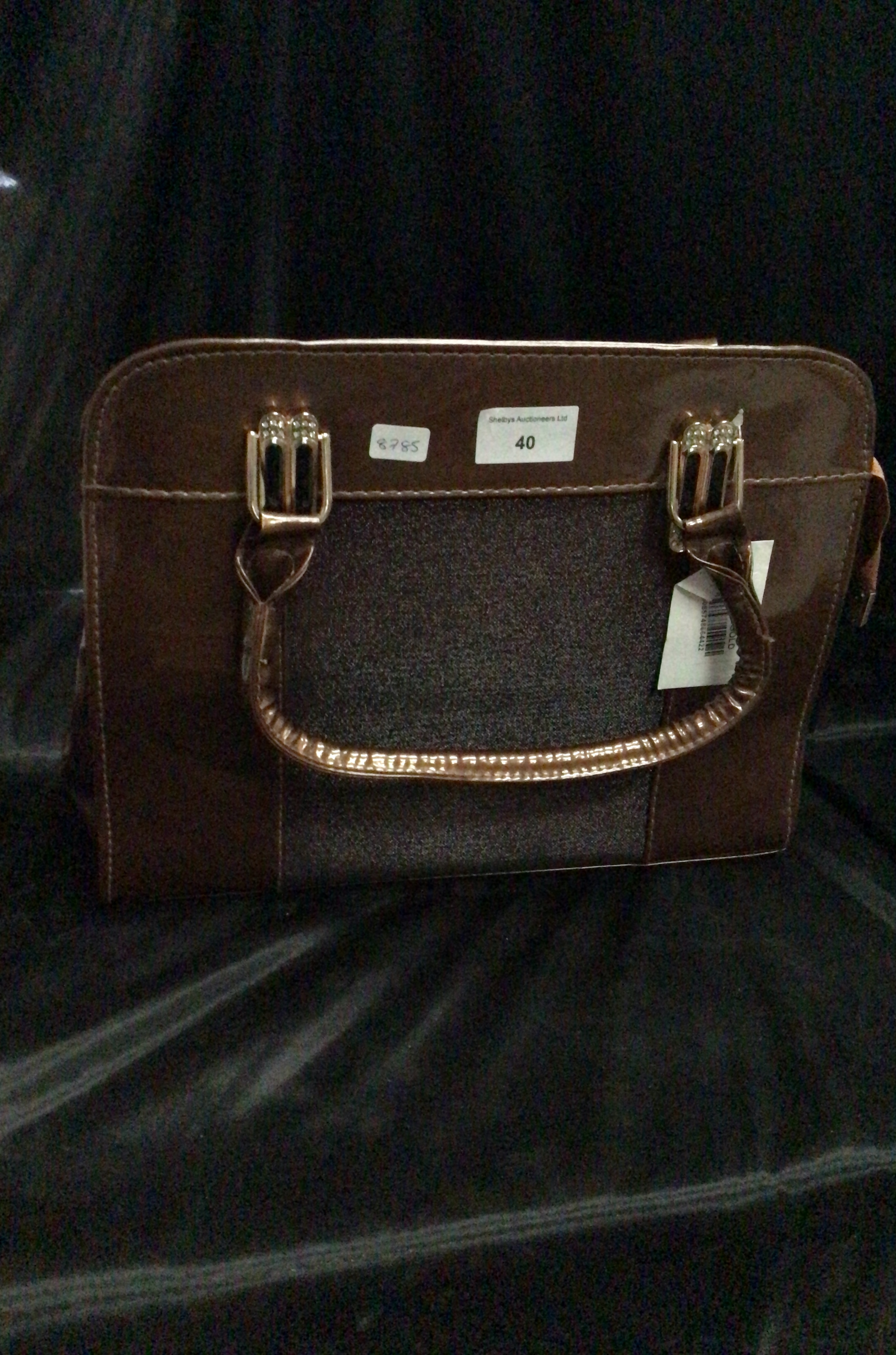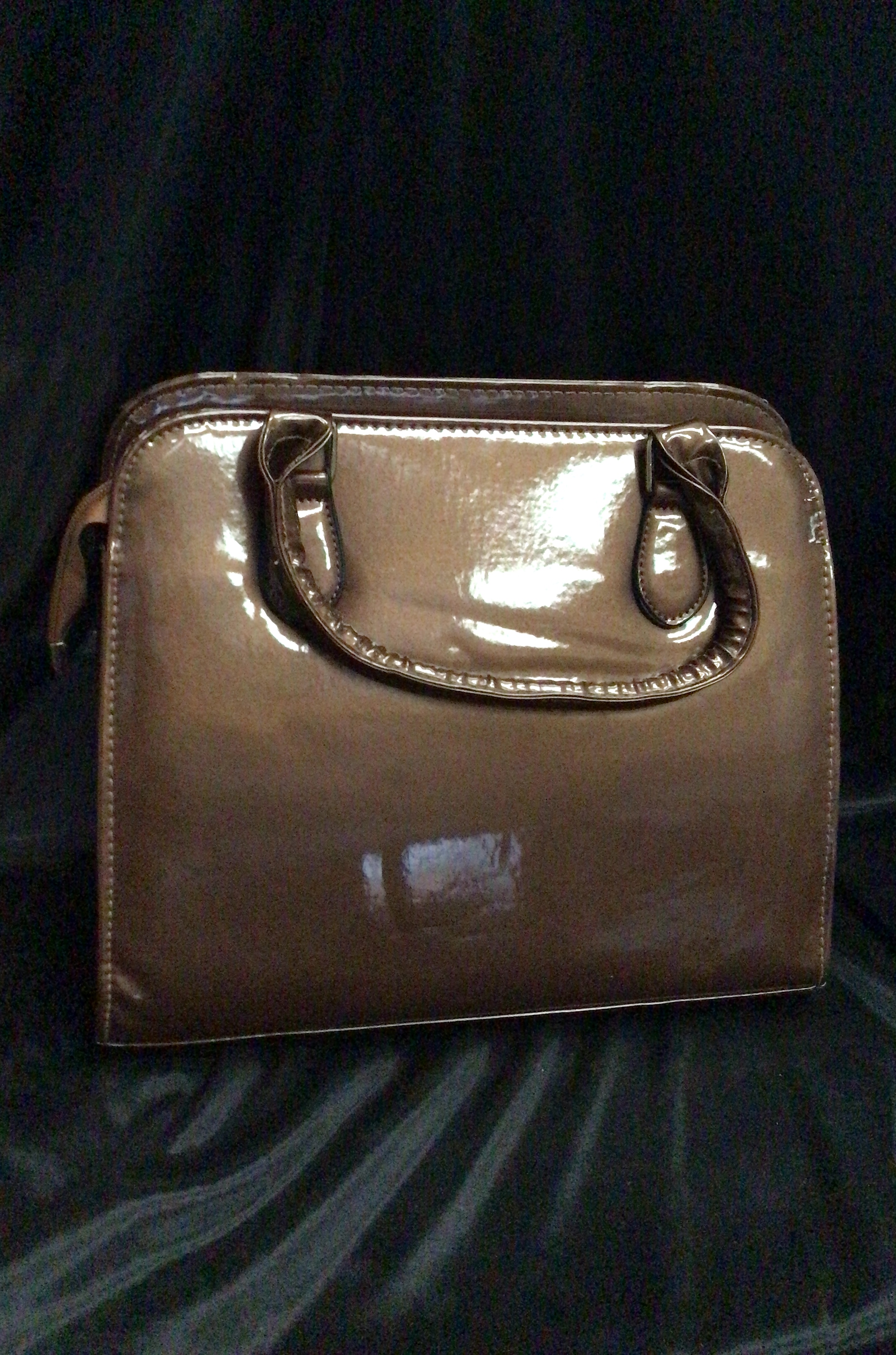 This is a structured, medium brown patent leather-like handbag with two top handles and silver-toned buckle attachments, featuring a textured dark gray front panel.