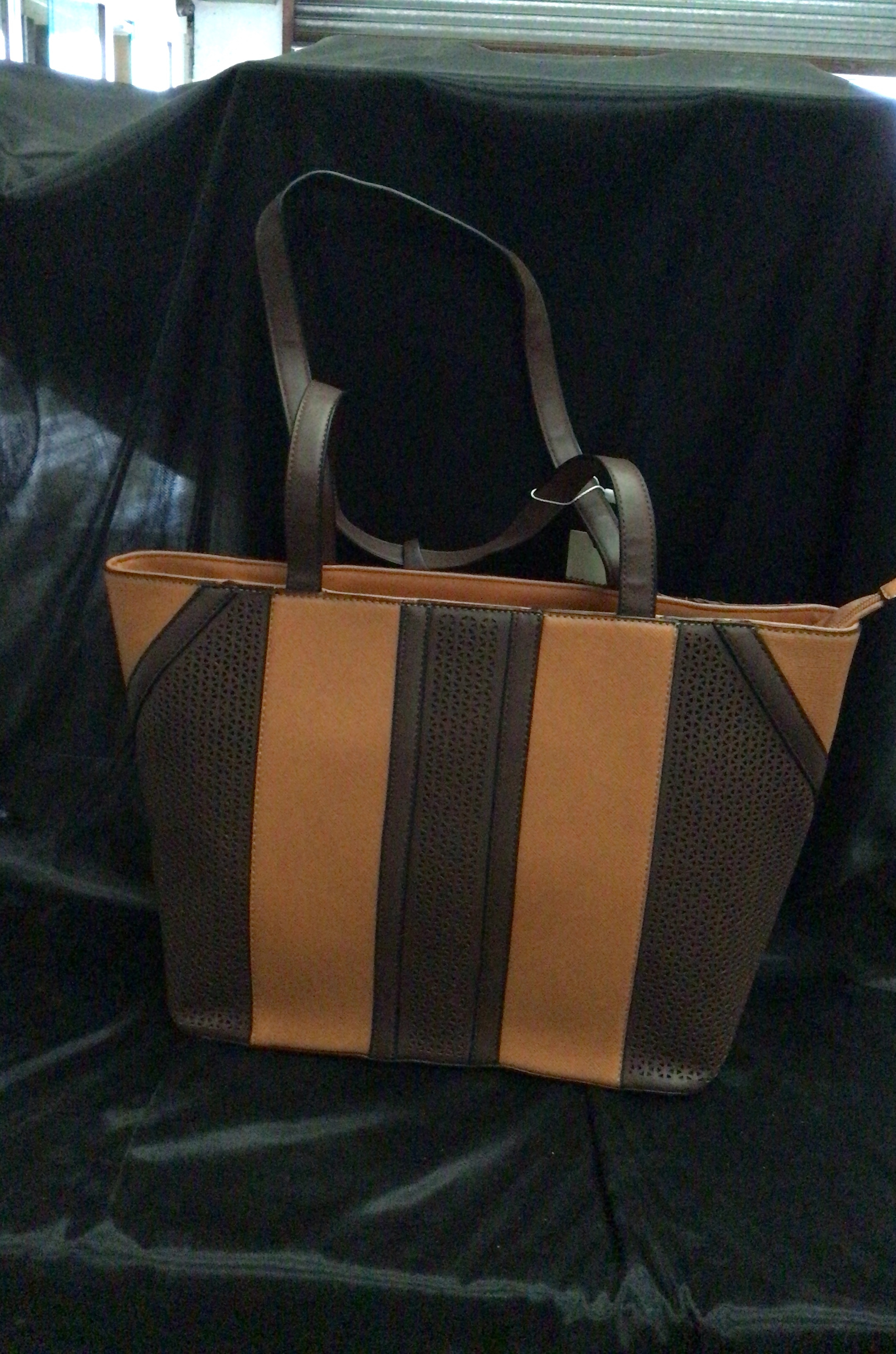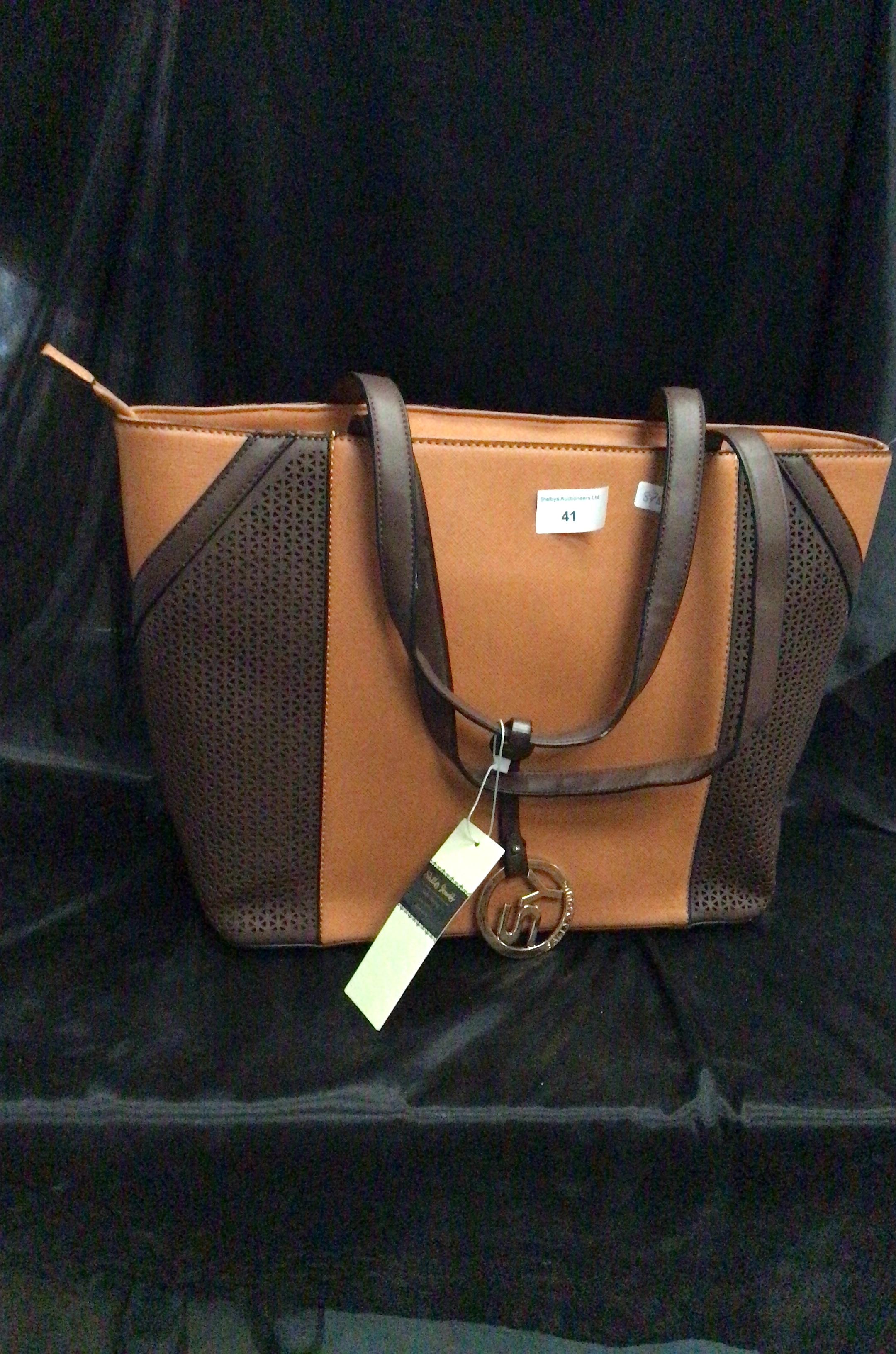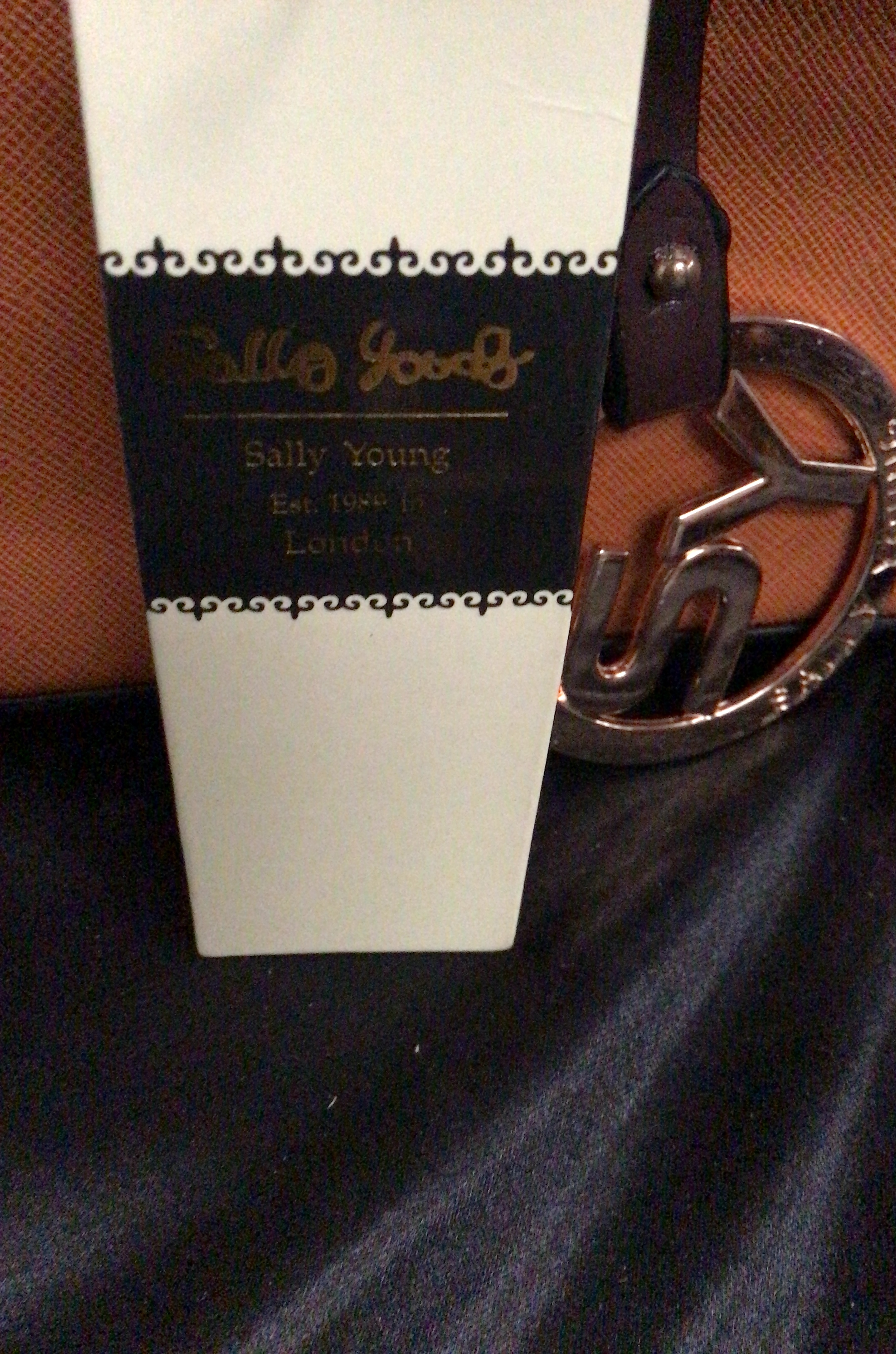 A light brown faux leather tote bag with dark brown perforated side panels and dual shoulder straps, featuring a gold-toned “SY” charm and “Sally Young Est. 1986 London” tag.