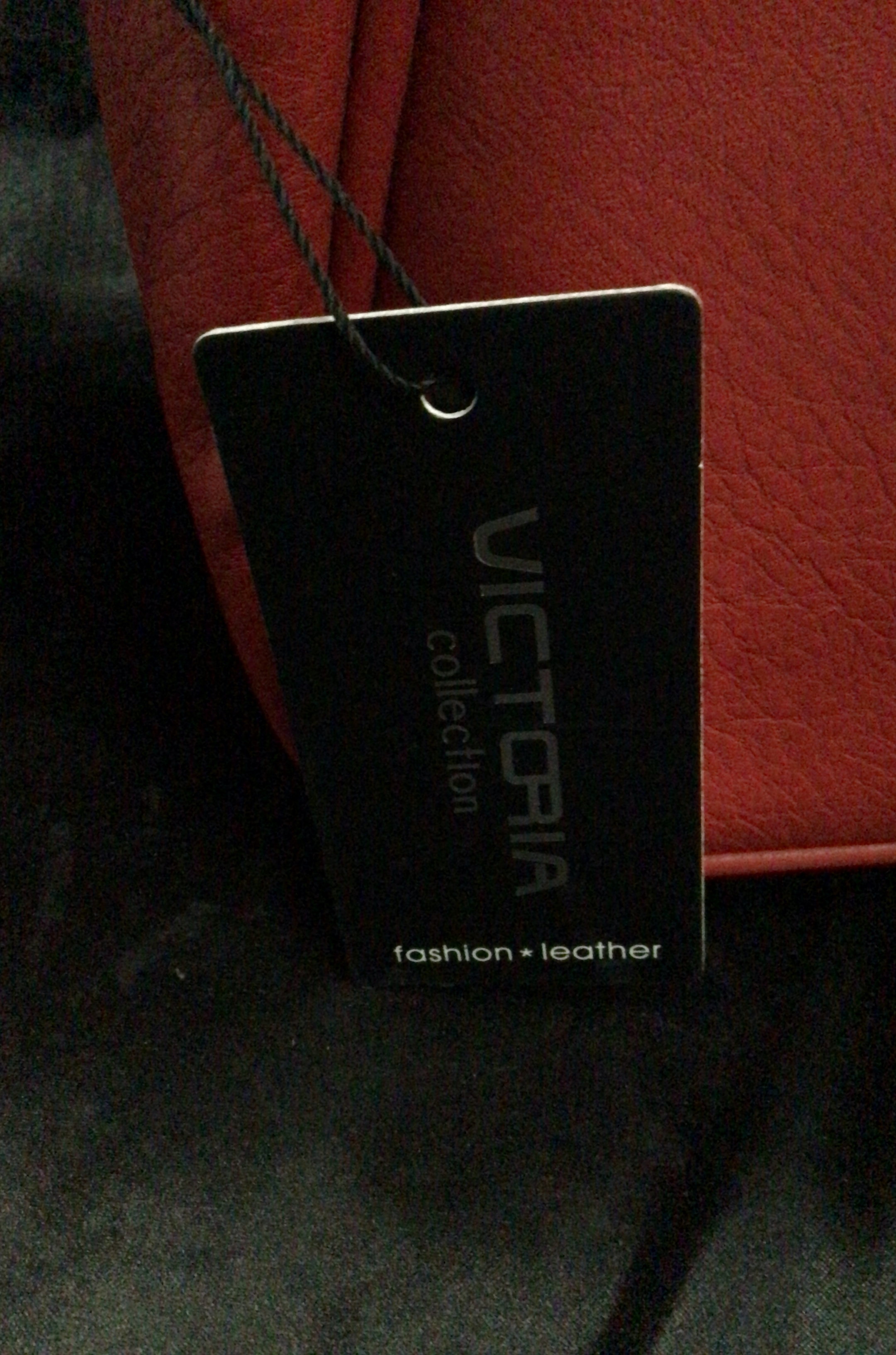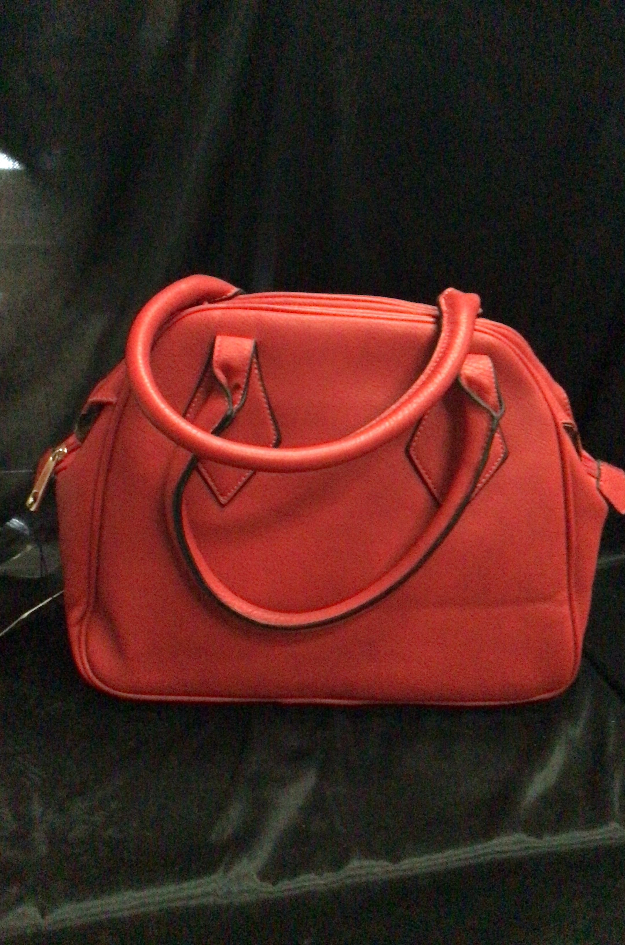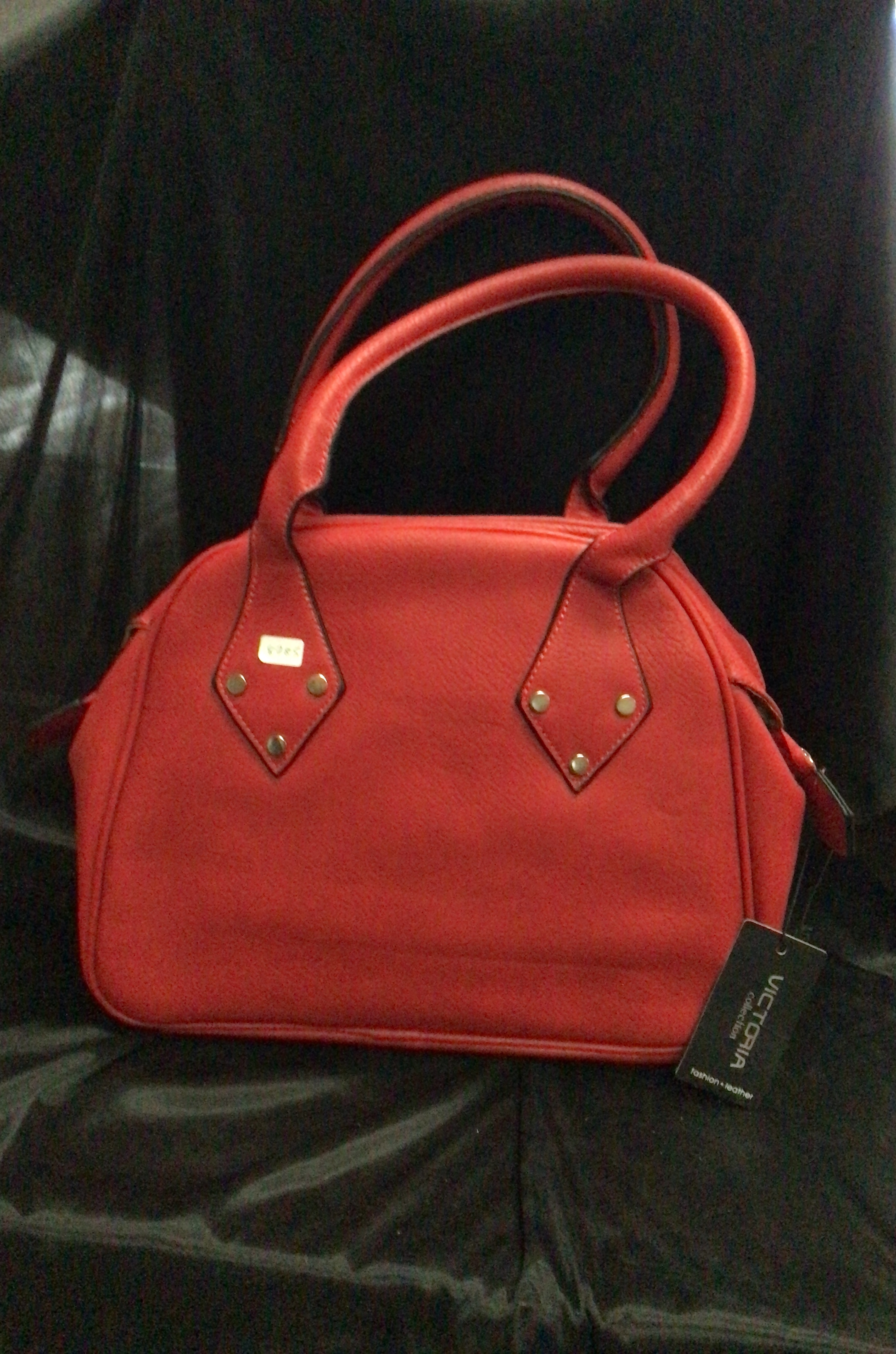 A structured red leather handbag featuring two top handles and decorative diamond-shaped accents on the front.