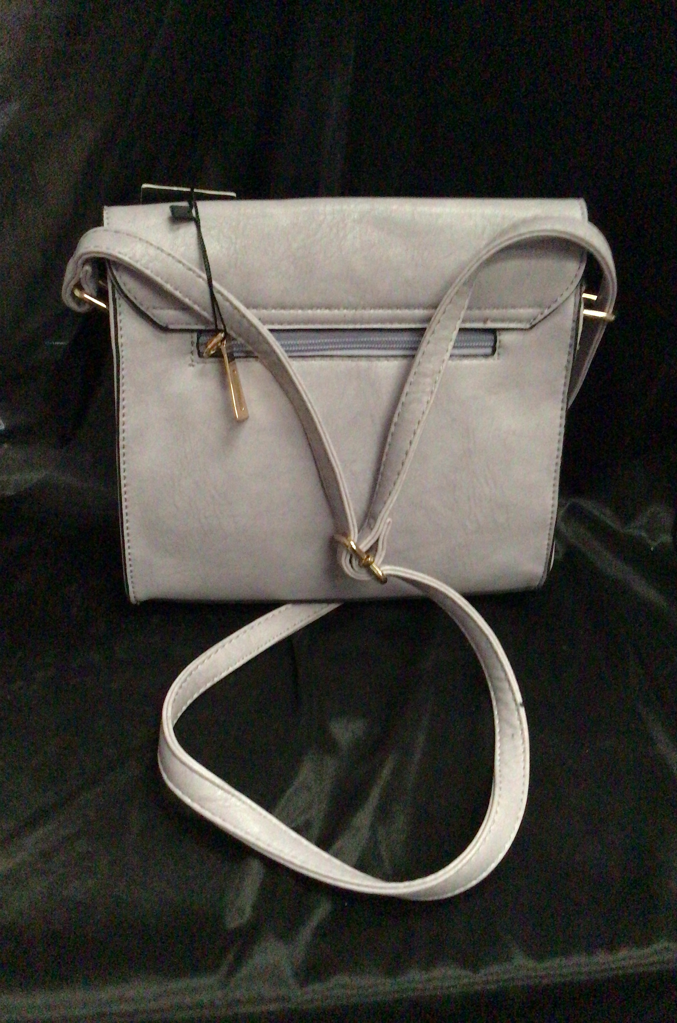 A light purple faux leather rectangular handbag featuring a flap closure with a gold-tone turn-lock clasp and an adjustable shoulder strap.