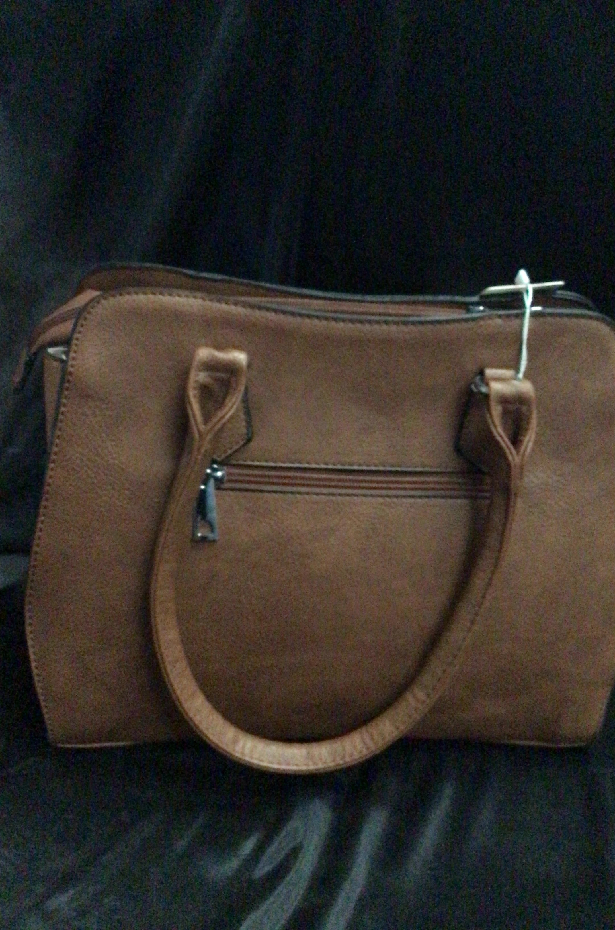 This is a brown textured handbag featuring a zip closure, top handles, studded front panel, and a floral tag.