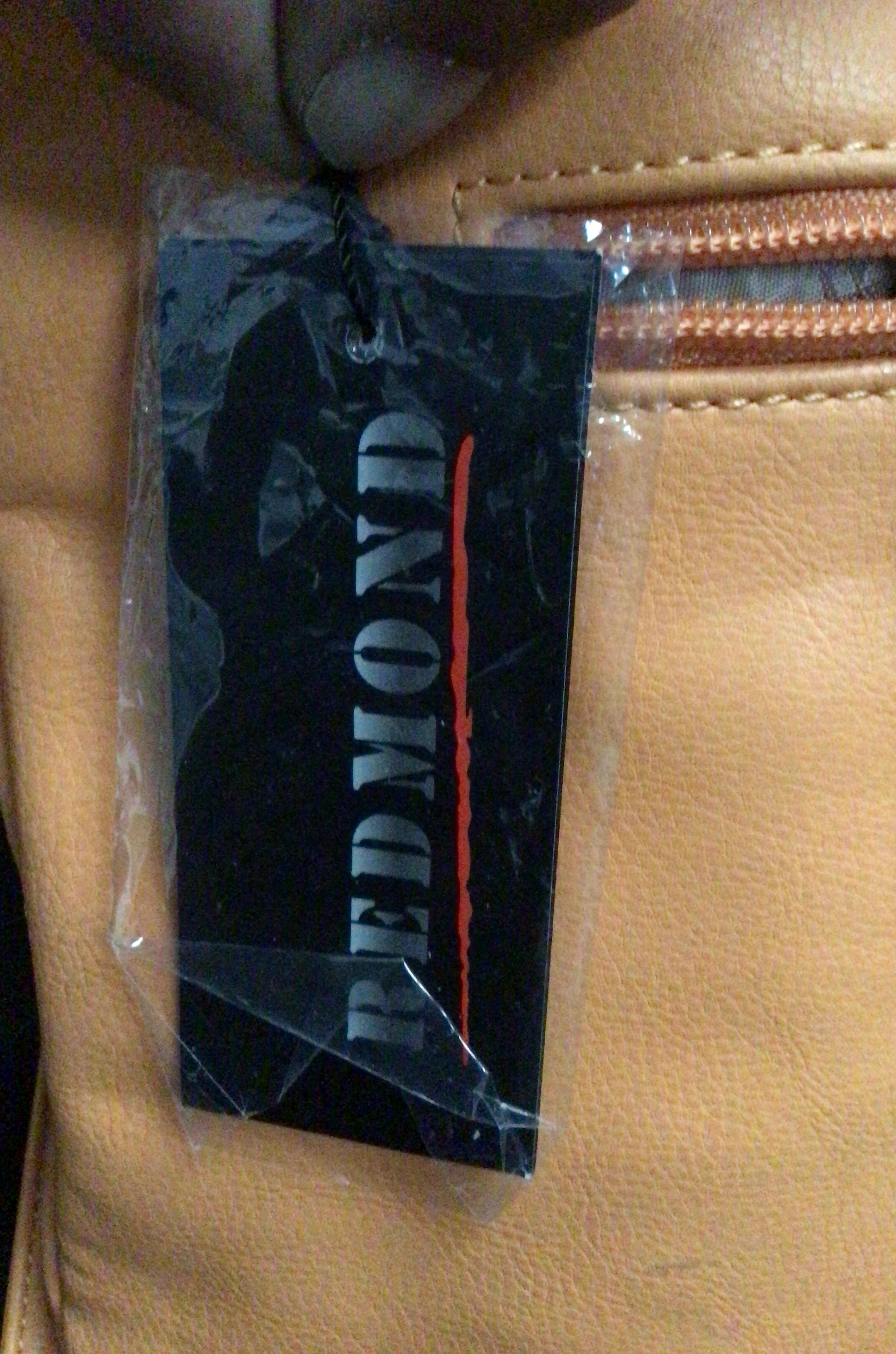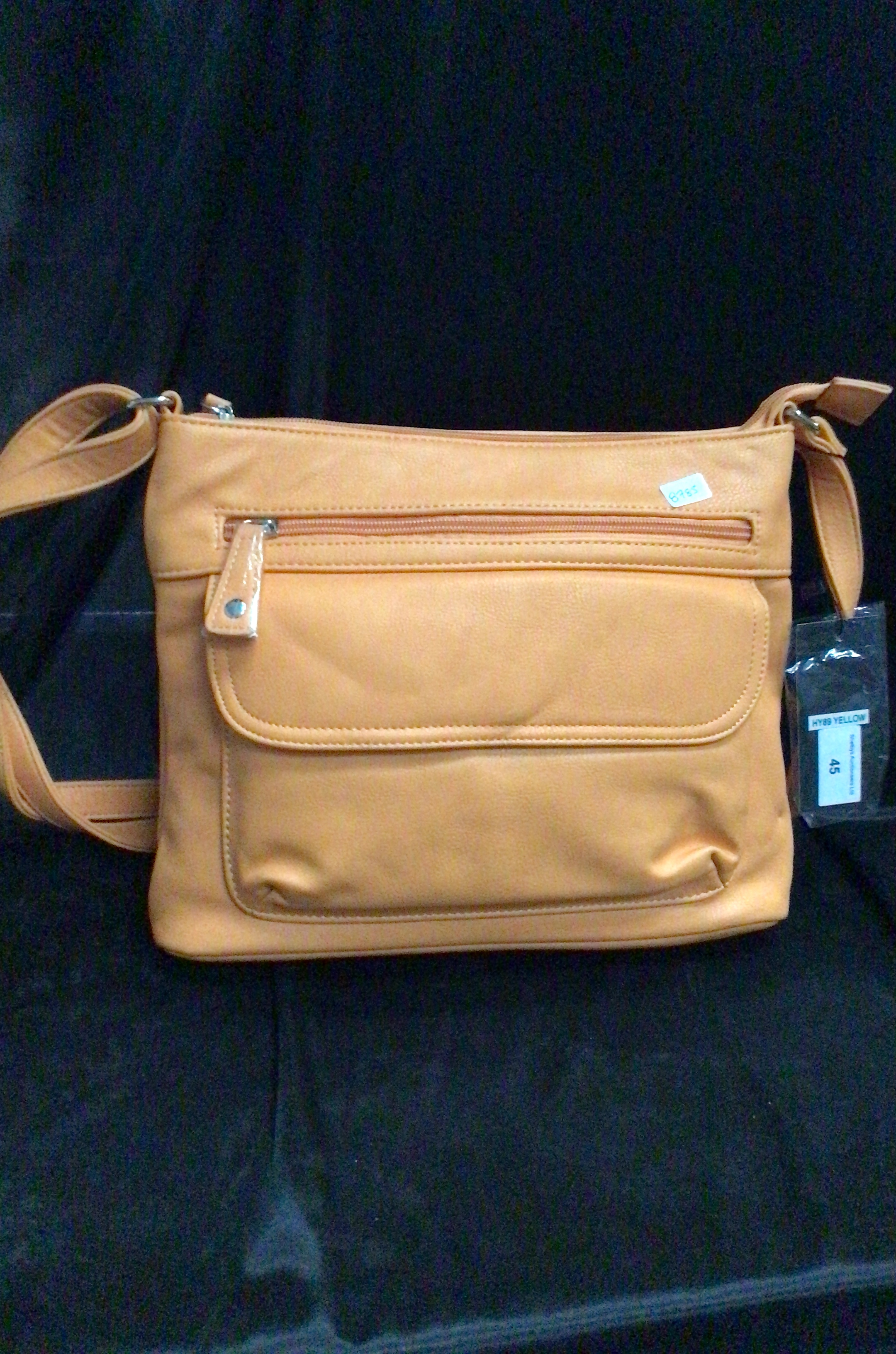 A light orange faux leather shoulder bag with multiple zippered pockets and an adjustable strap.