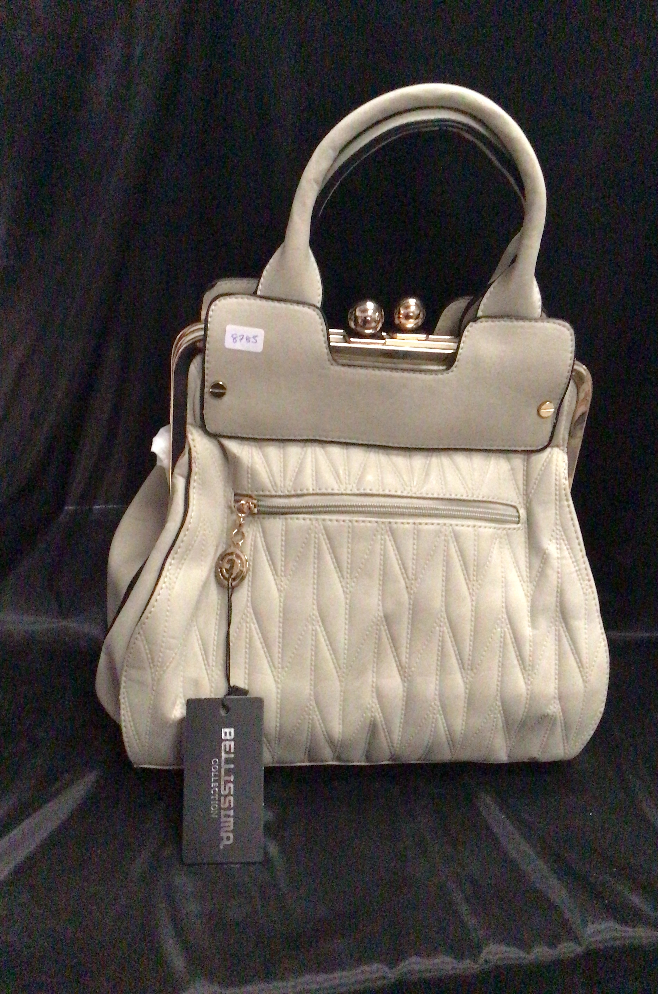 Light gray structured handbag with diamond quilting, top handle, clasp closure, and front zip pocket.