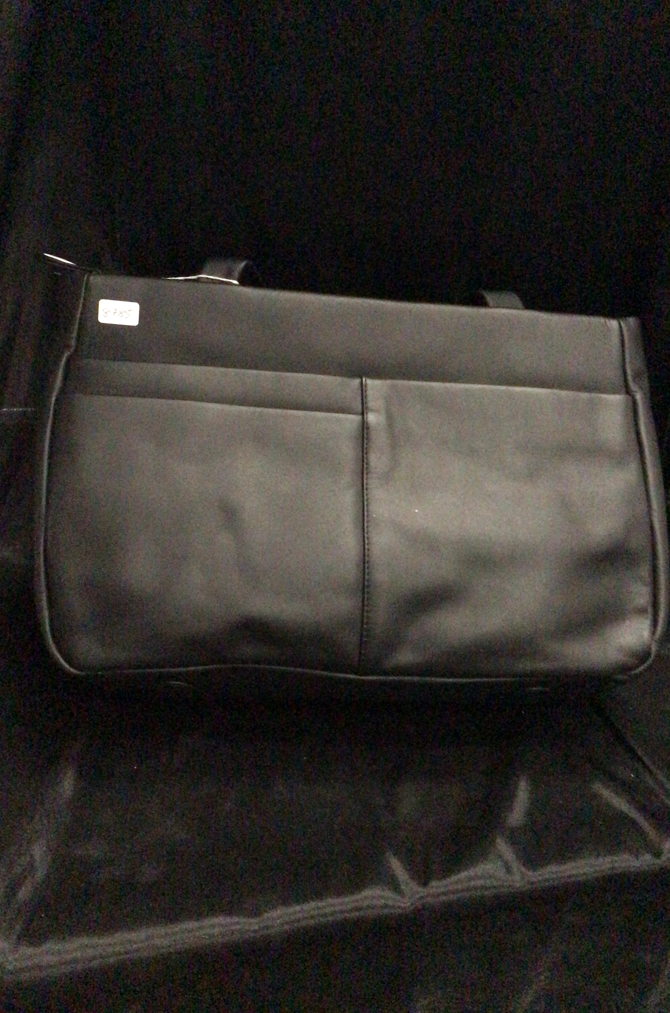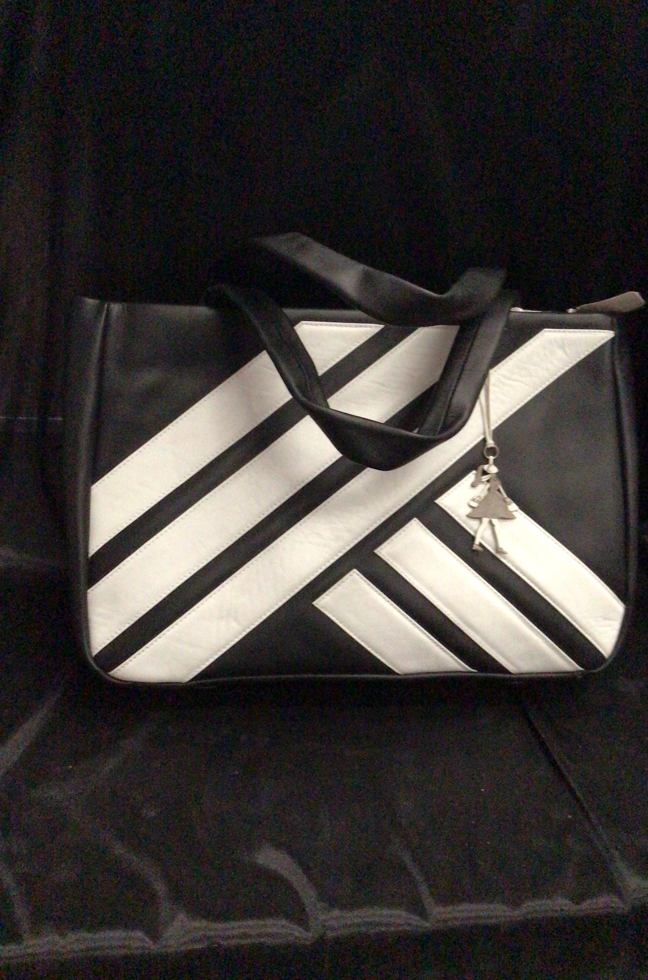 A black and white geometric stripe handbag featuring two black straps, a silver-toned person charm, and two stitched pockets on the back.