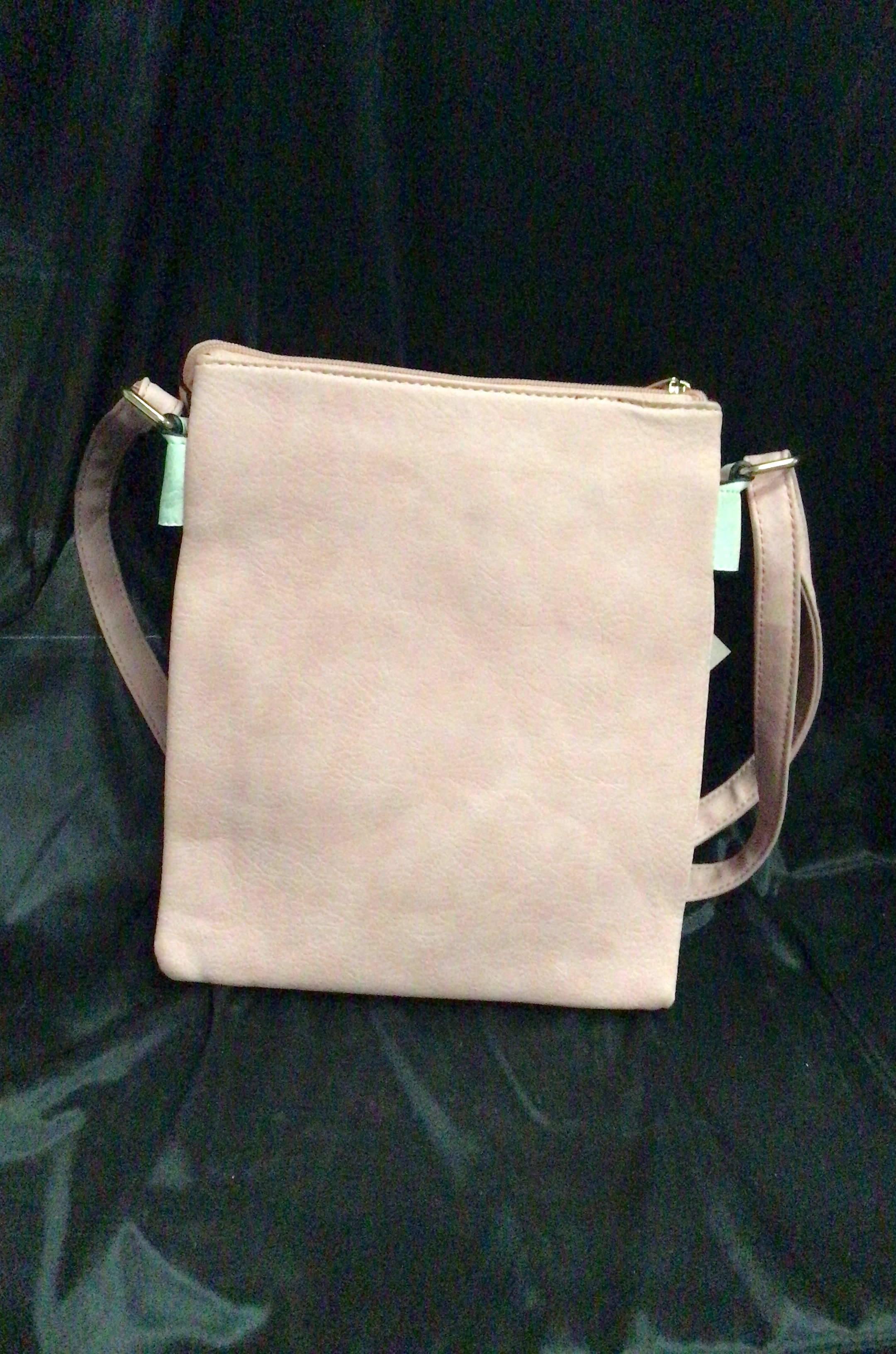 This light pink textured crossbody bag features a flap closure with decorative gold-toned hardware and a distinctive white and black trim.
