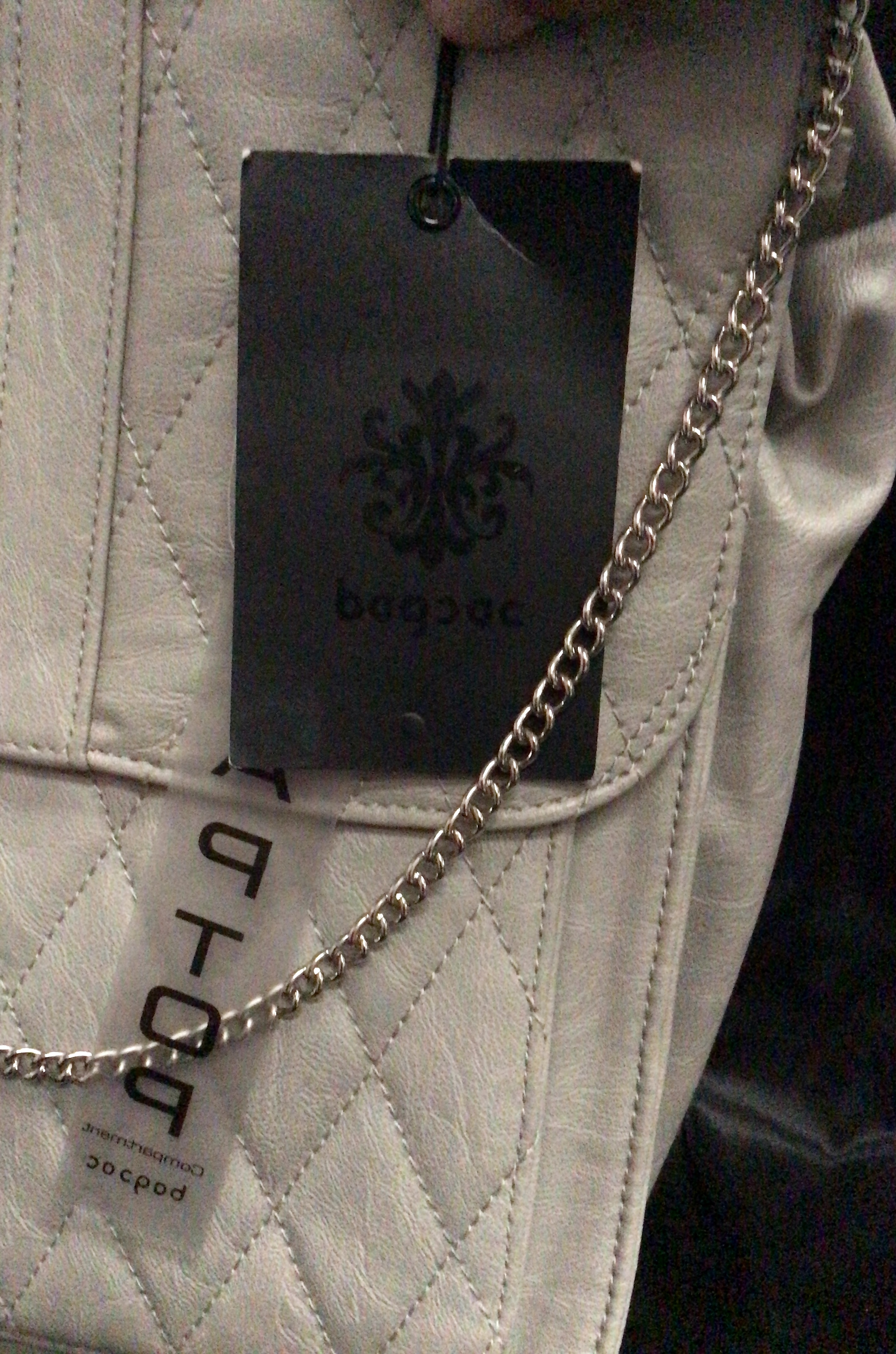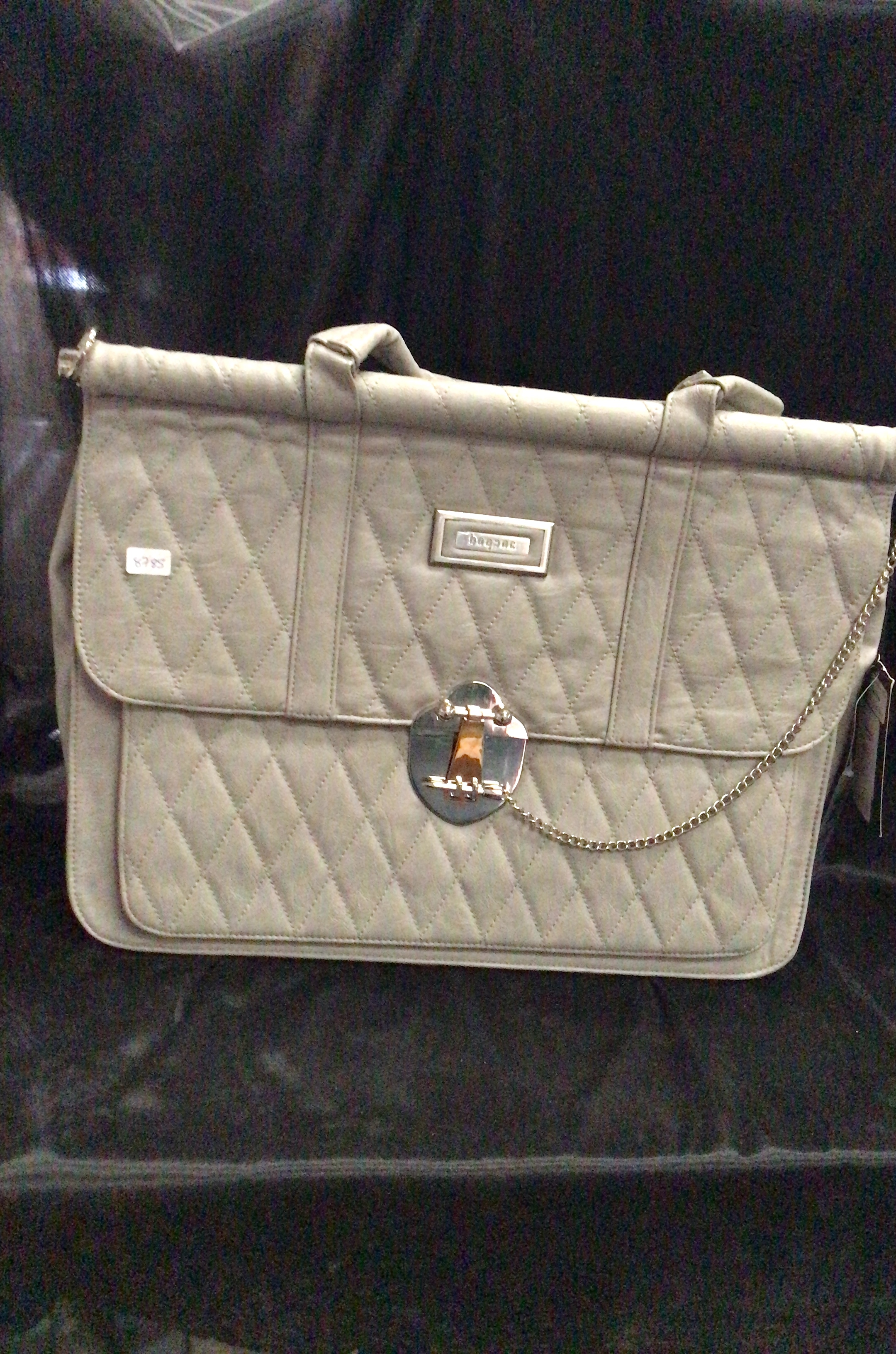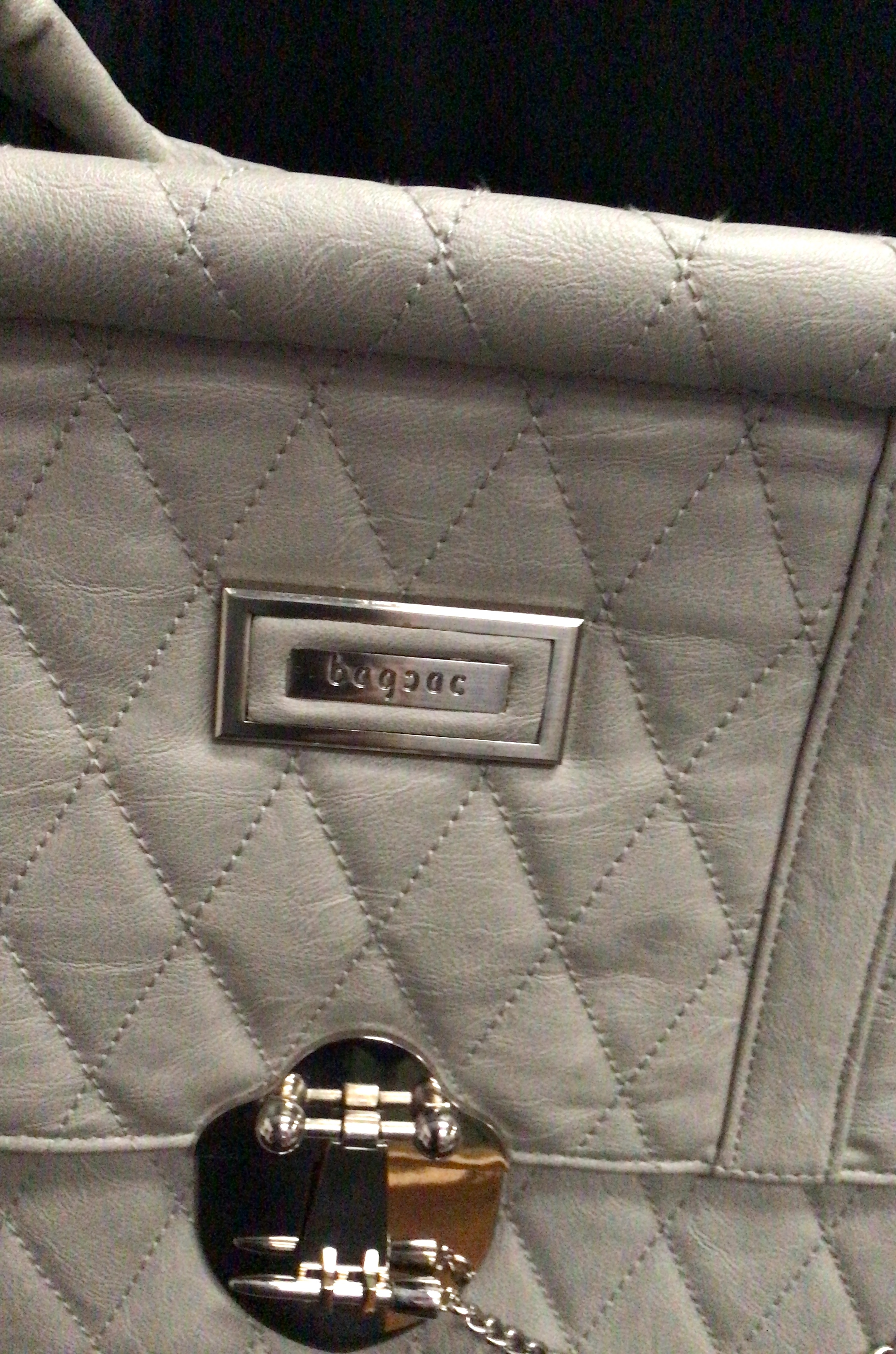 This is a light gray, quilted handbag with interlocking diamond patterns, featuring top handles, a silver-tone chain strap, and a flap closure with distinctive branding.