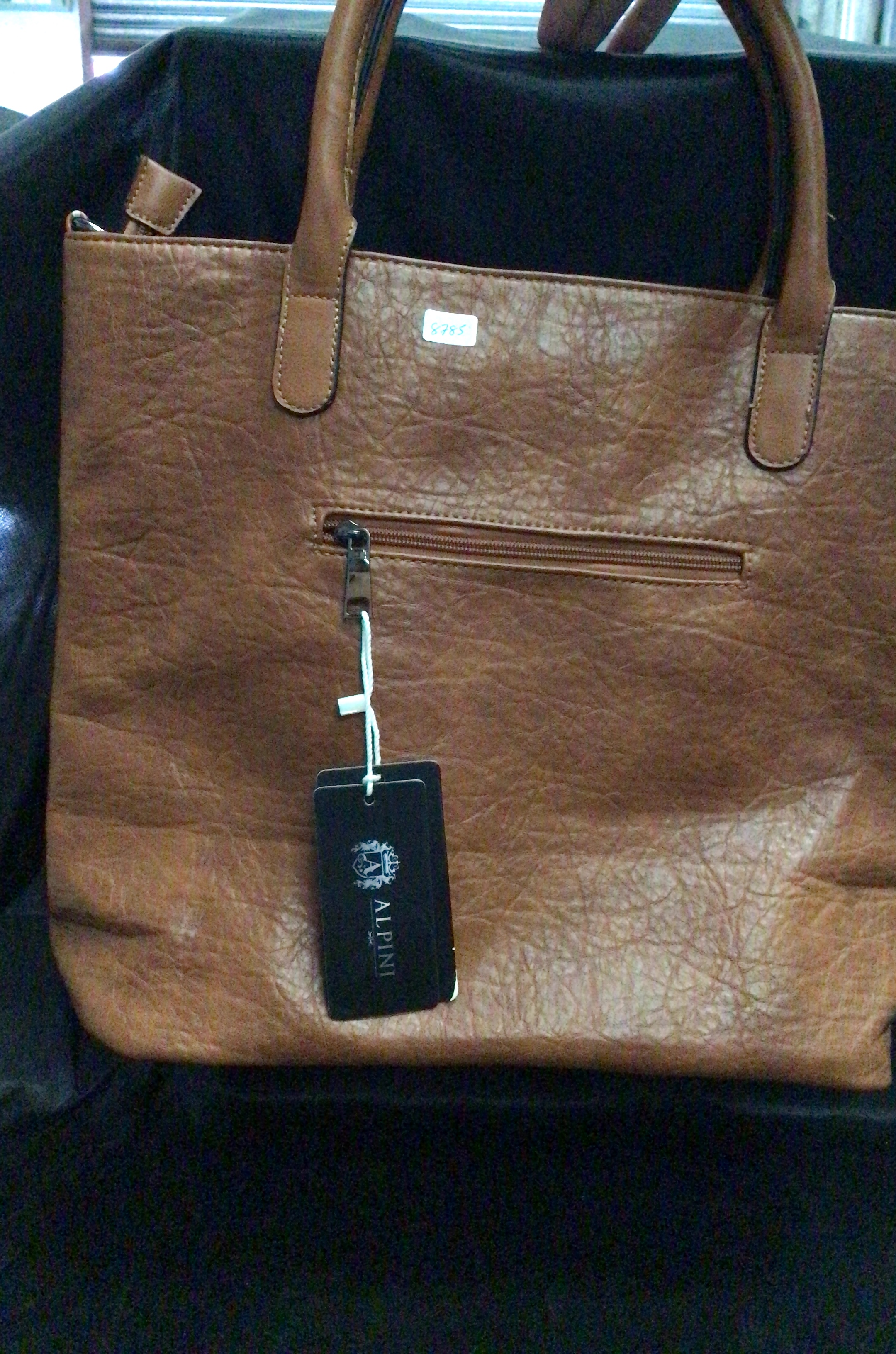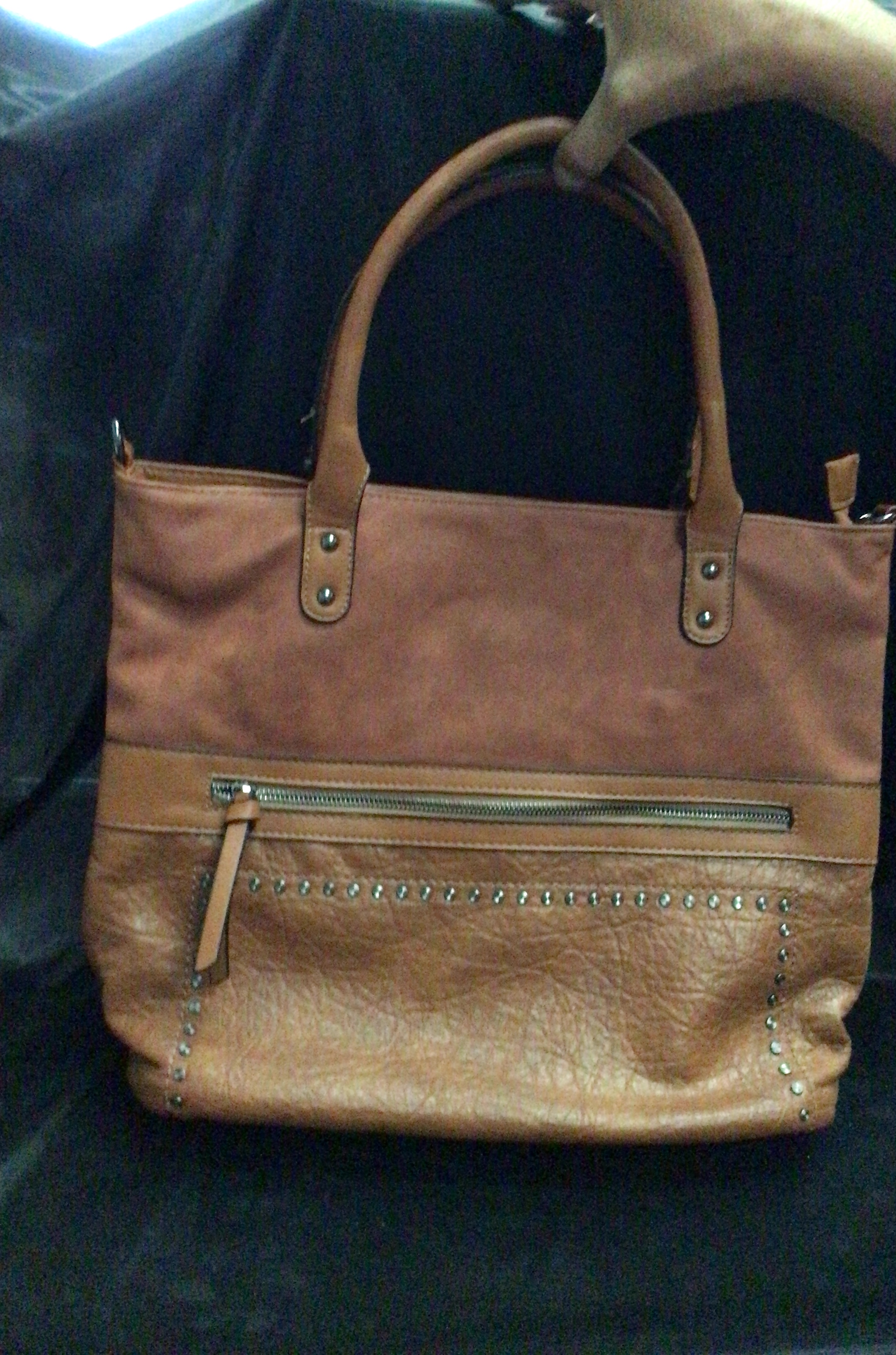 This is a brown faux leather tote bag with a textured finish, featuring a front zip pocket, studded detail, and a top zip closure.