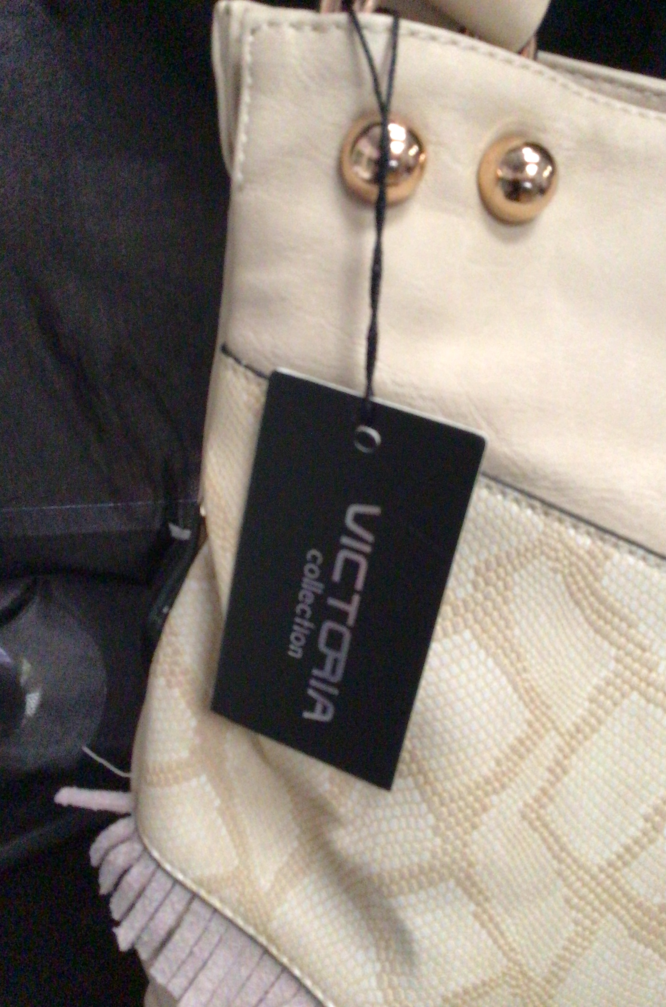 A cream-colored structured handbag with a textured geometric panel, black trim, gold-toned hardware, and pink fringe detail.