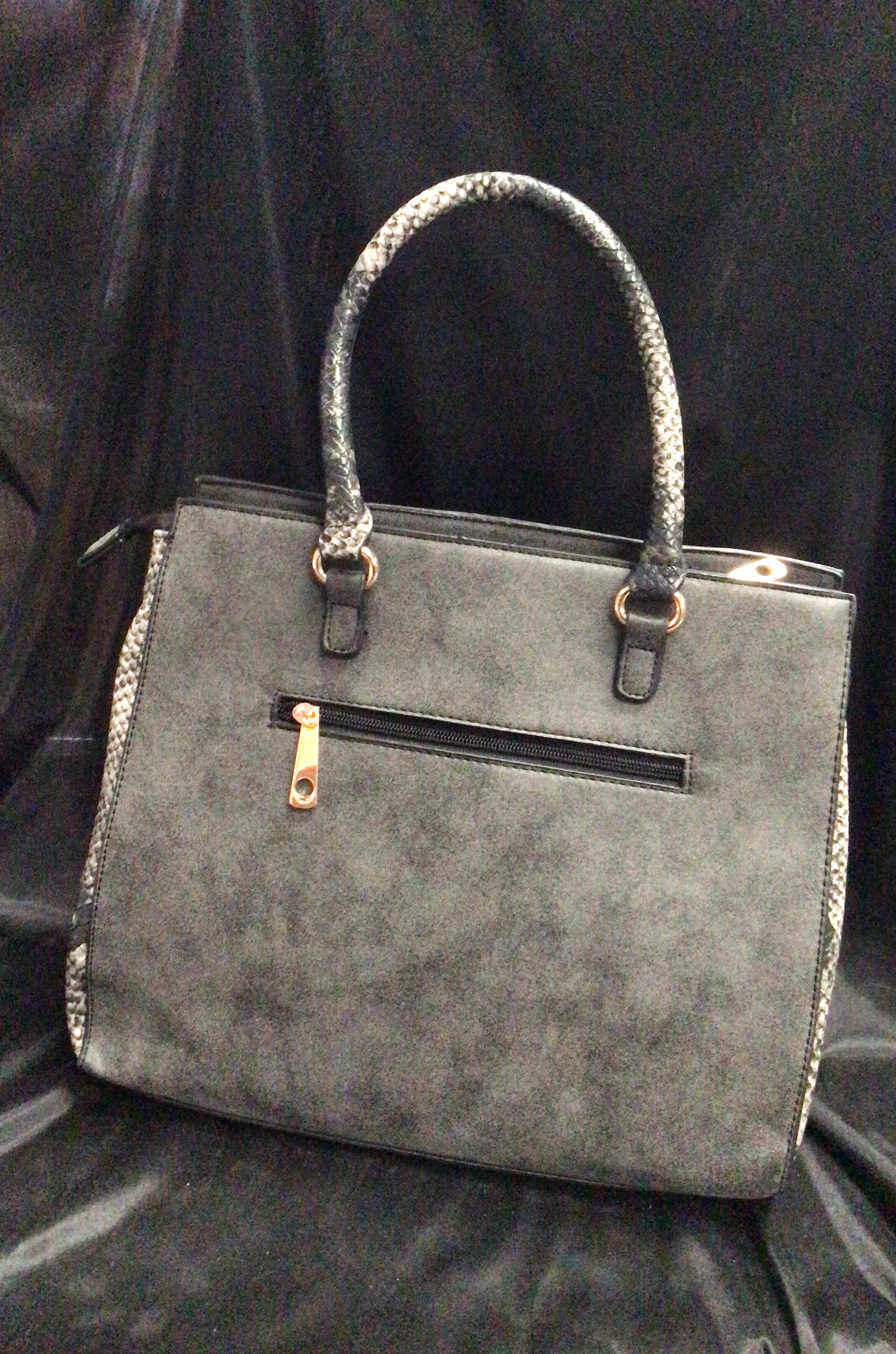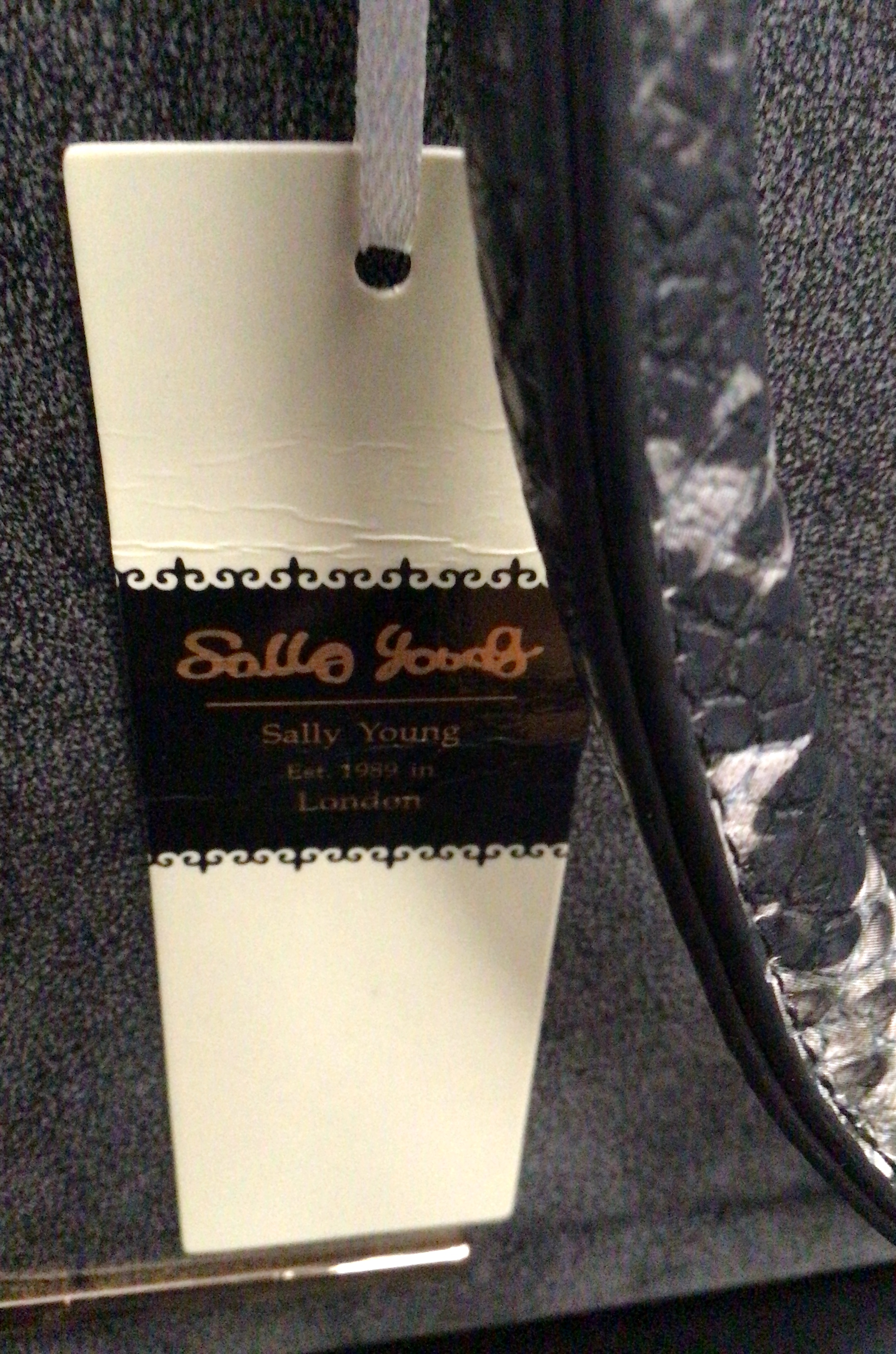 A dark gray suede tote bag featuring black and white snakeskin patterned sides and handles, with gold-toned hardware and a Sally Young logo.